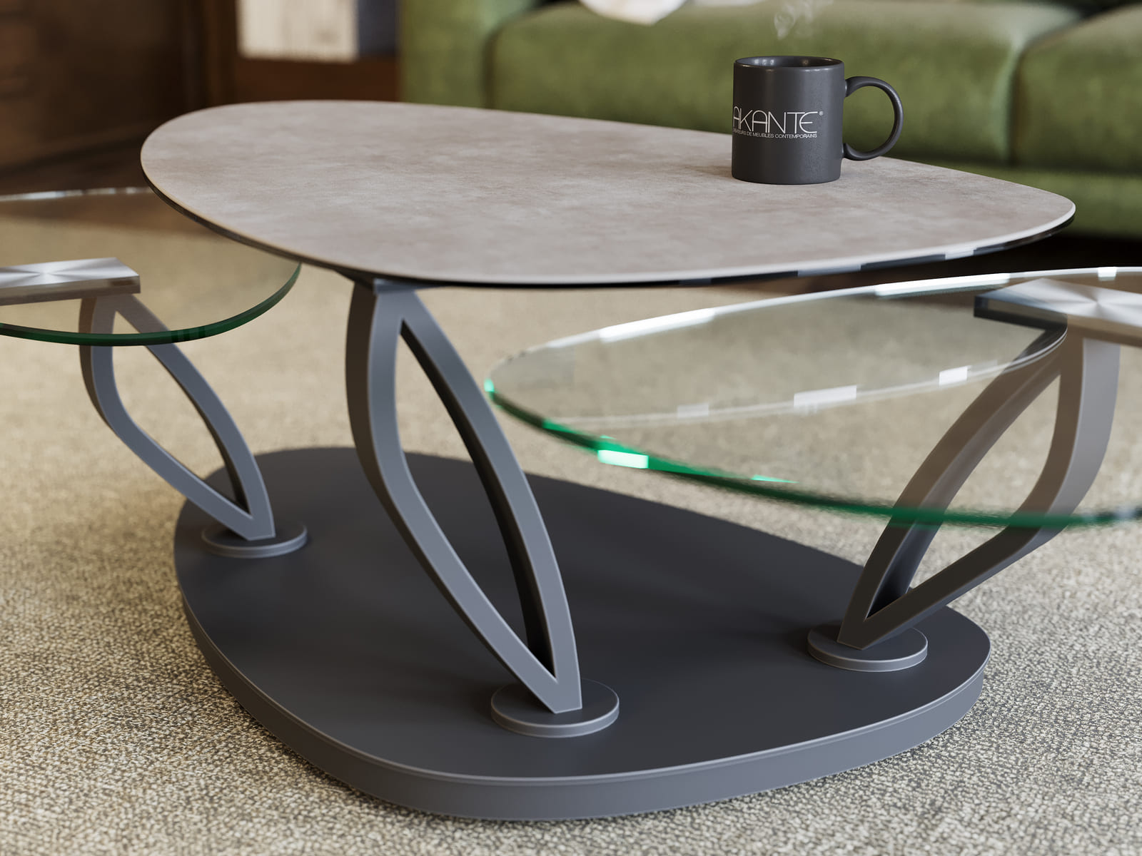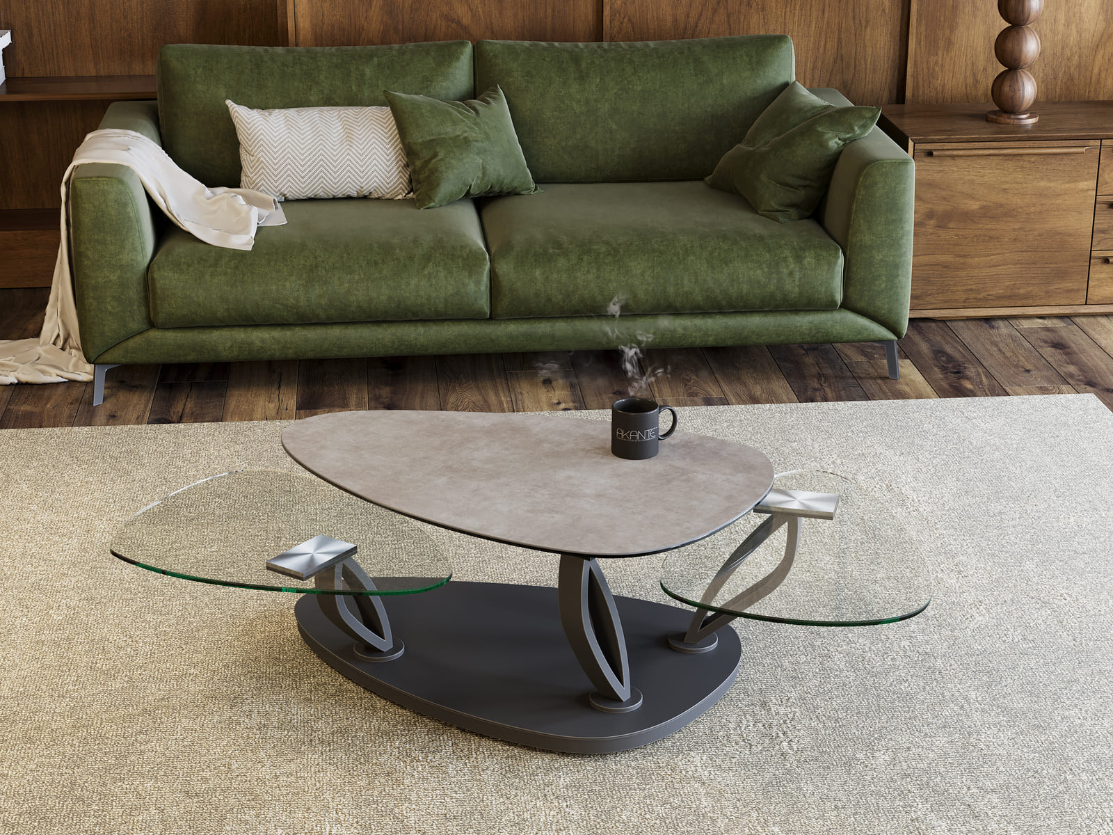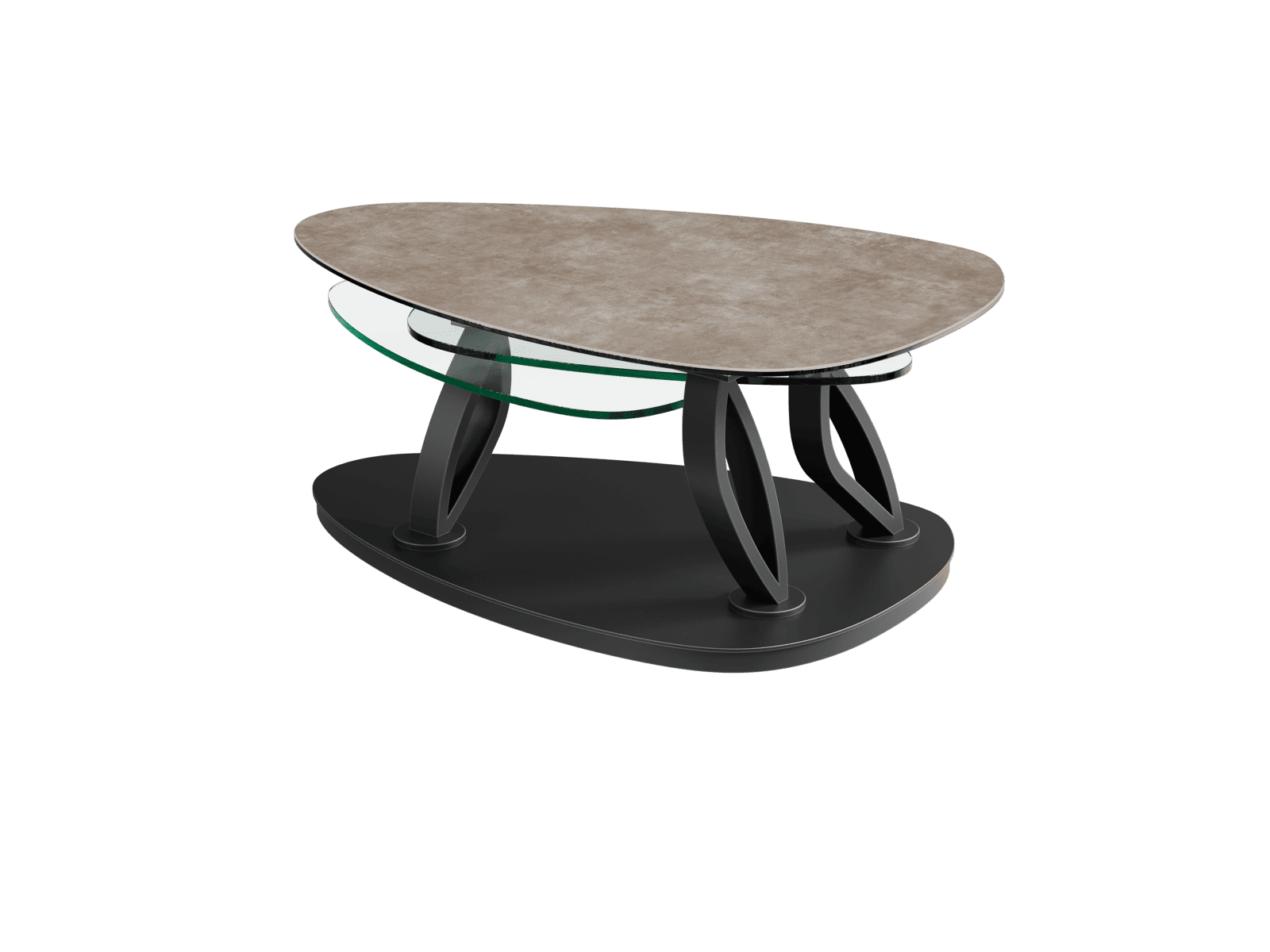 Pour un salon chaleureux et convivial, adoptez la table basse Magnolia en teinte Argile. Ce modèle est doté de 3 plateaux pivotants, ce qui permet d’ajuster la surface selon vos besoins. En effet, le plateau principal conçu en céramique de 3 mm collée sur 6 mm de verre, mesure 100 x 65 cm. Les deux plateaux inférieurs sont en verre trempé de 10 mm, lorsque vous les déployez, la surface totale s’étend jusqu’à 155 x 71 cm. La forme de pétale est inspirée de notre modèle Galet. Elégante et contemporaine, la table basse Magnolia possède une structure ajourée, conçue en acier laqué noir mat.