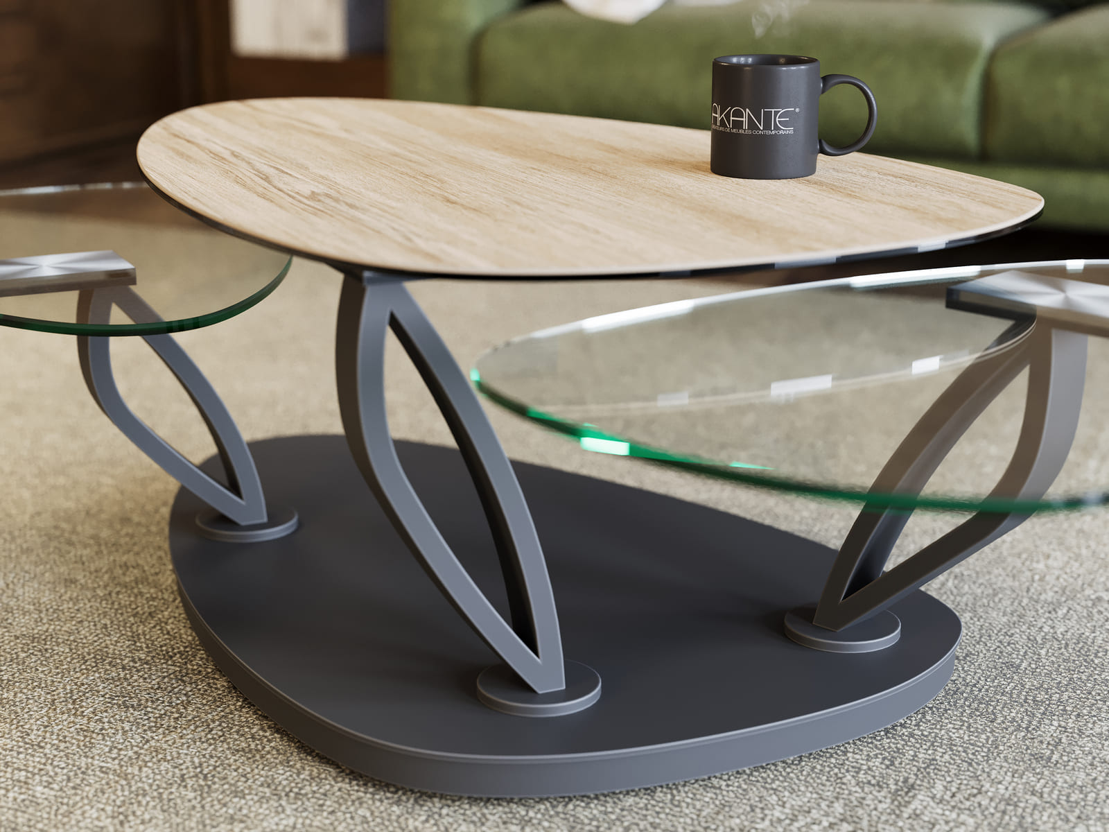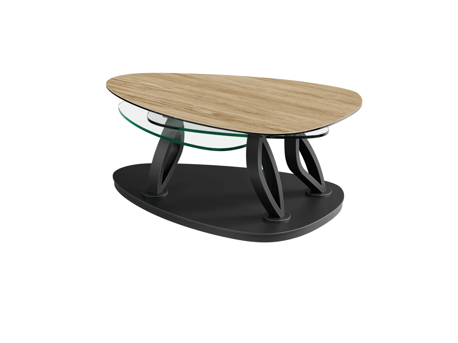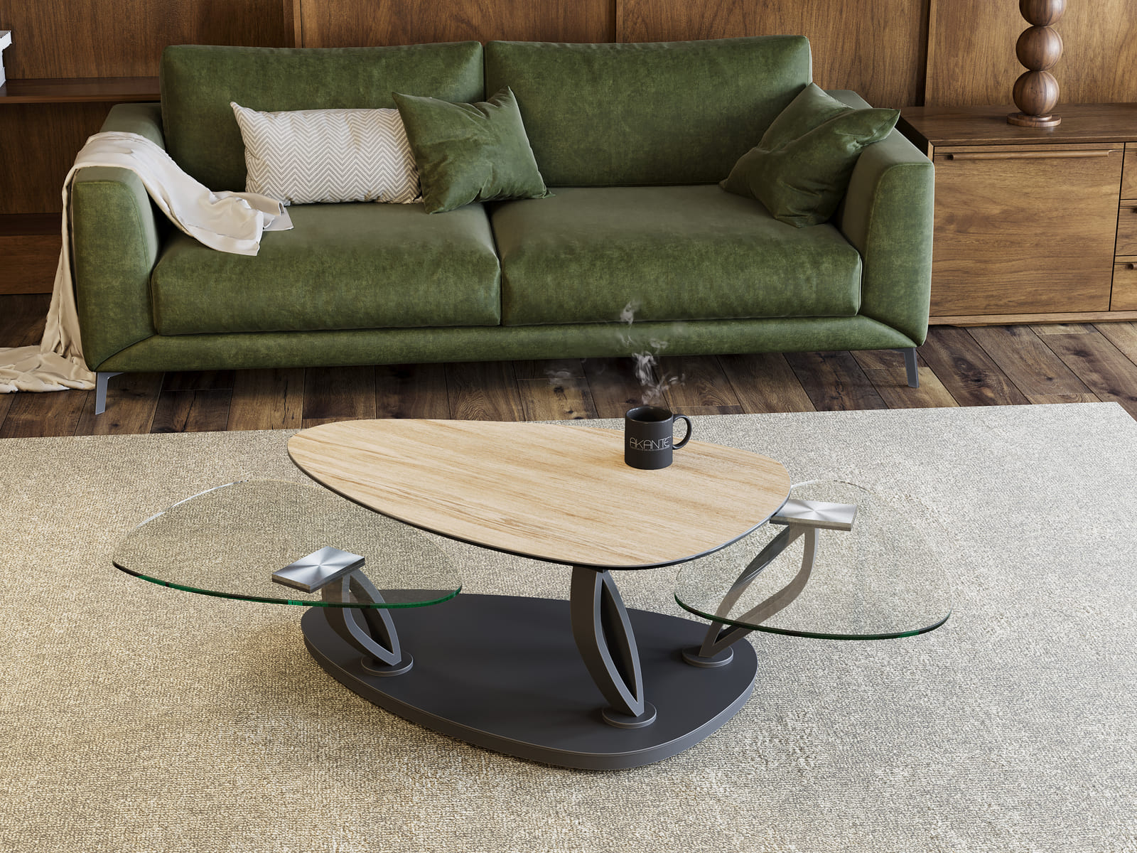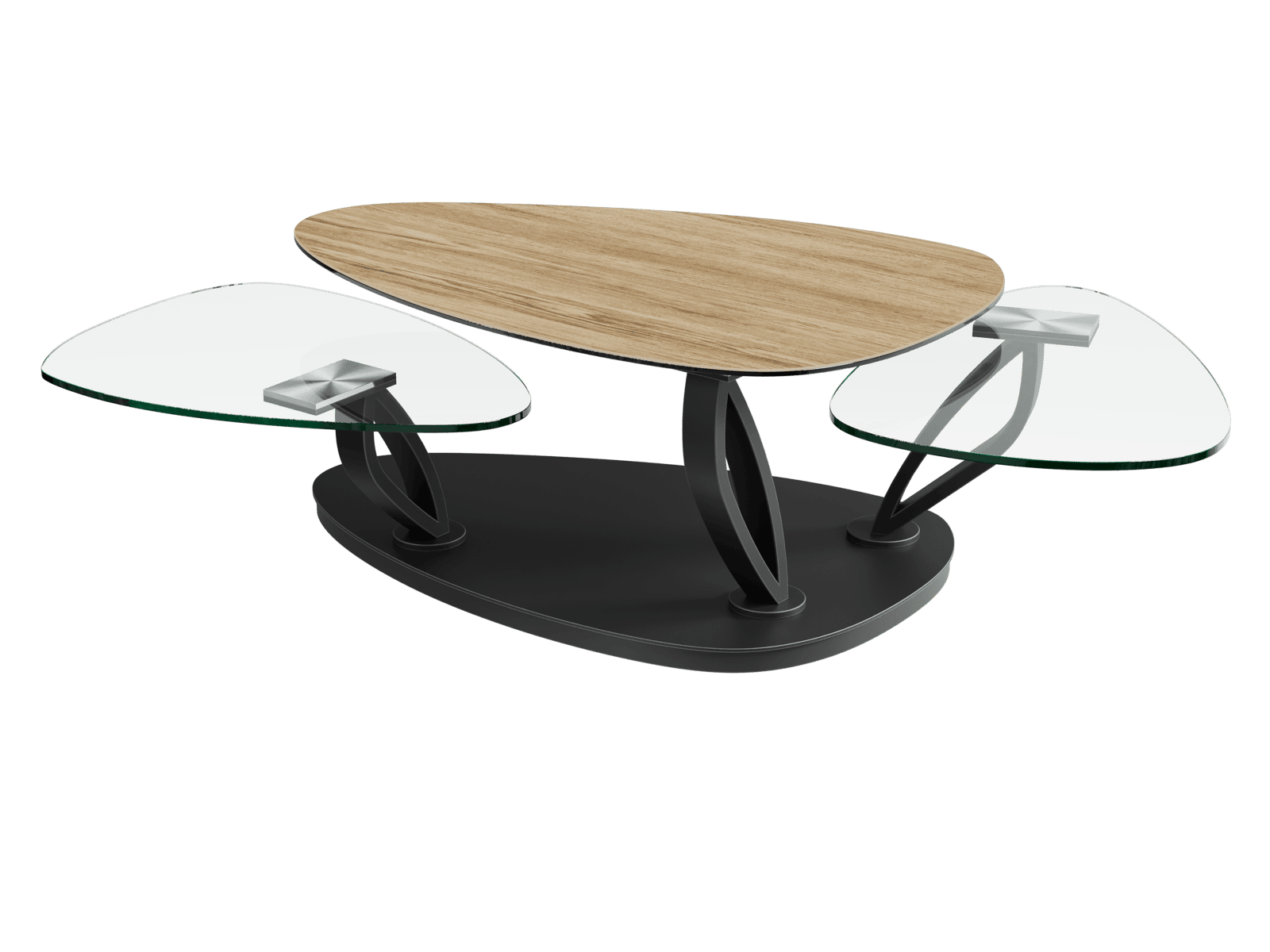 Pour un intérieur tendance et cosy, découvrez la table basse Magnolia. Modulable, ses plateaux organiques en forme de pétale pivotent, ce qui vous permet d’ajuster la surface selon vos besoins. Le plateau supérieur est en céramique Chêne Clair de 3 mm, collée sur un verre de 6 mm. Sa teinte douce et chaleureuse ajoute une touche d’authenticité à un intérieur. Les deux plateaux inférieurs sont en verre trempé de 10 mm, ils permettent d’apporter de la luminosité et de la transparence. La structure est ajourée, conçue en acier laqué noir mat, sa silhouette contemporaine se marie parfaitement à l’ensemble des matériaux utilisés. Magnolia mesure : 100 x 65 cm fermée et 155 x 71 cm déployée.