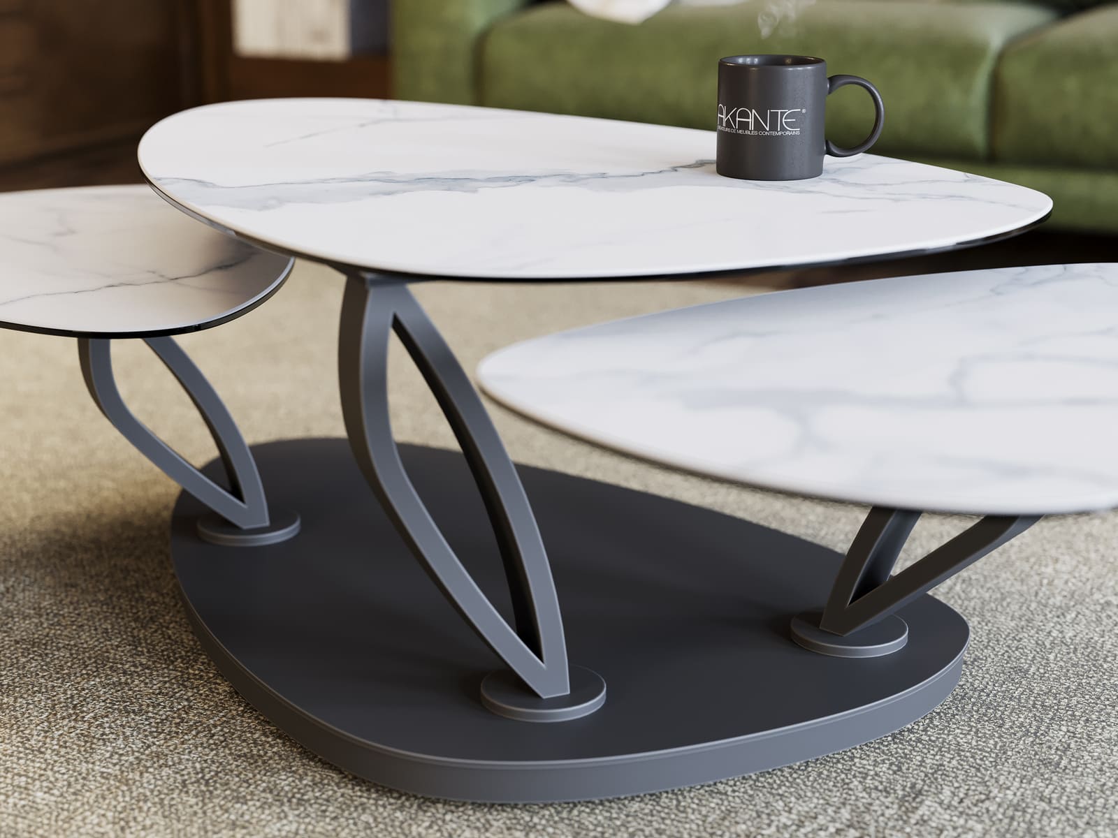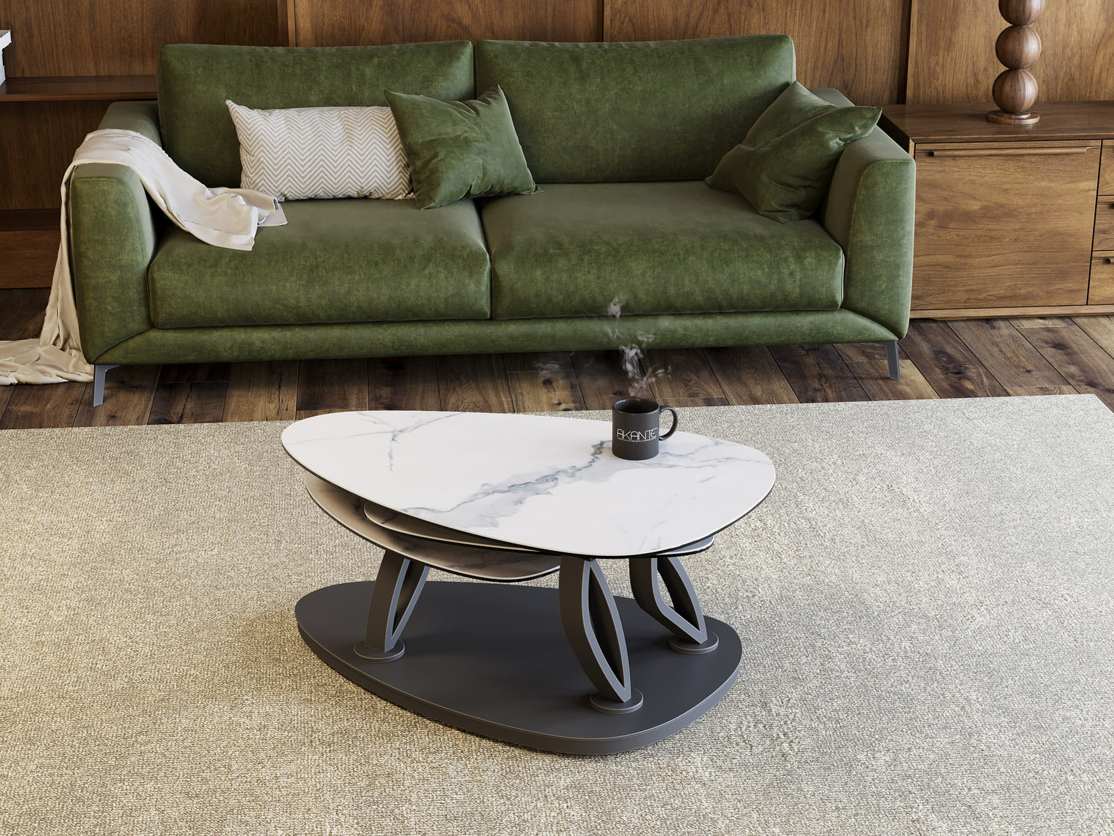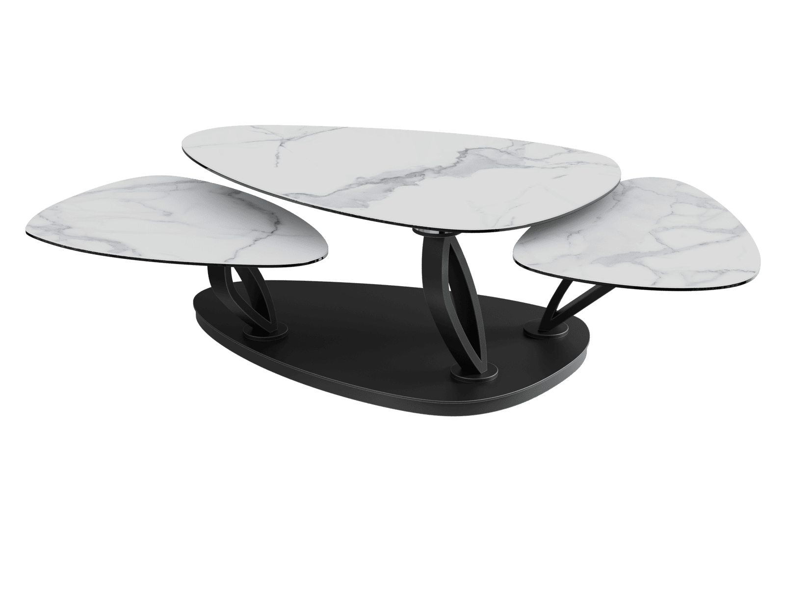 Vous souhaitez ajouter une touche lumineuse dans votre salon ? Découvrez Magnolias en finition Marbre Mat, une table basse élégante et accueillante. Dotée de trois plateaux pivotants (conçus en céramique de 3 mm, collée sur 6 mm de verre), Magnolias vous permet de recevoir vos convives en toute sérénité. En effet, d’une simple rotation, atteignez une surface de 1,55 mètre de long et 71 cm de large. Sa structure ajourée est conçue en acier laqué noir mat. Ce modèle possède des roulettes pour faciliter son déplacement.
