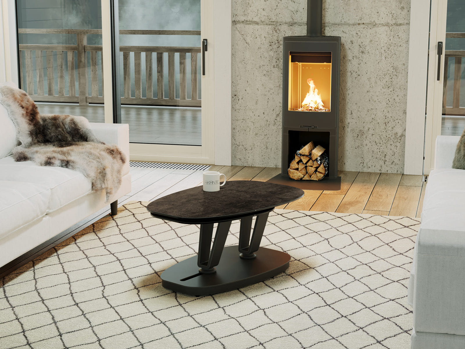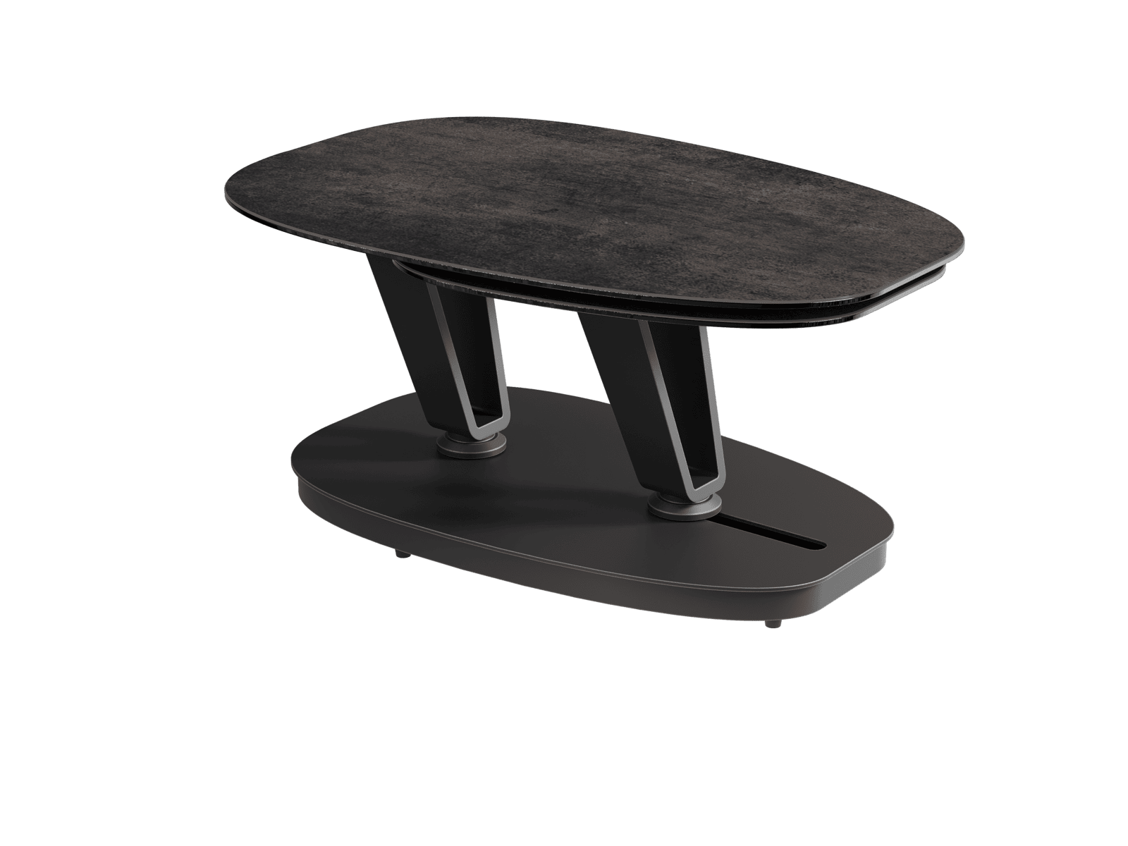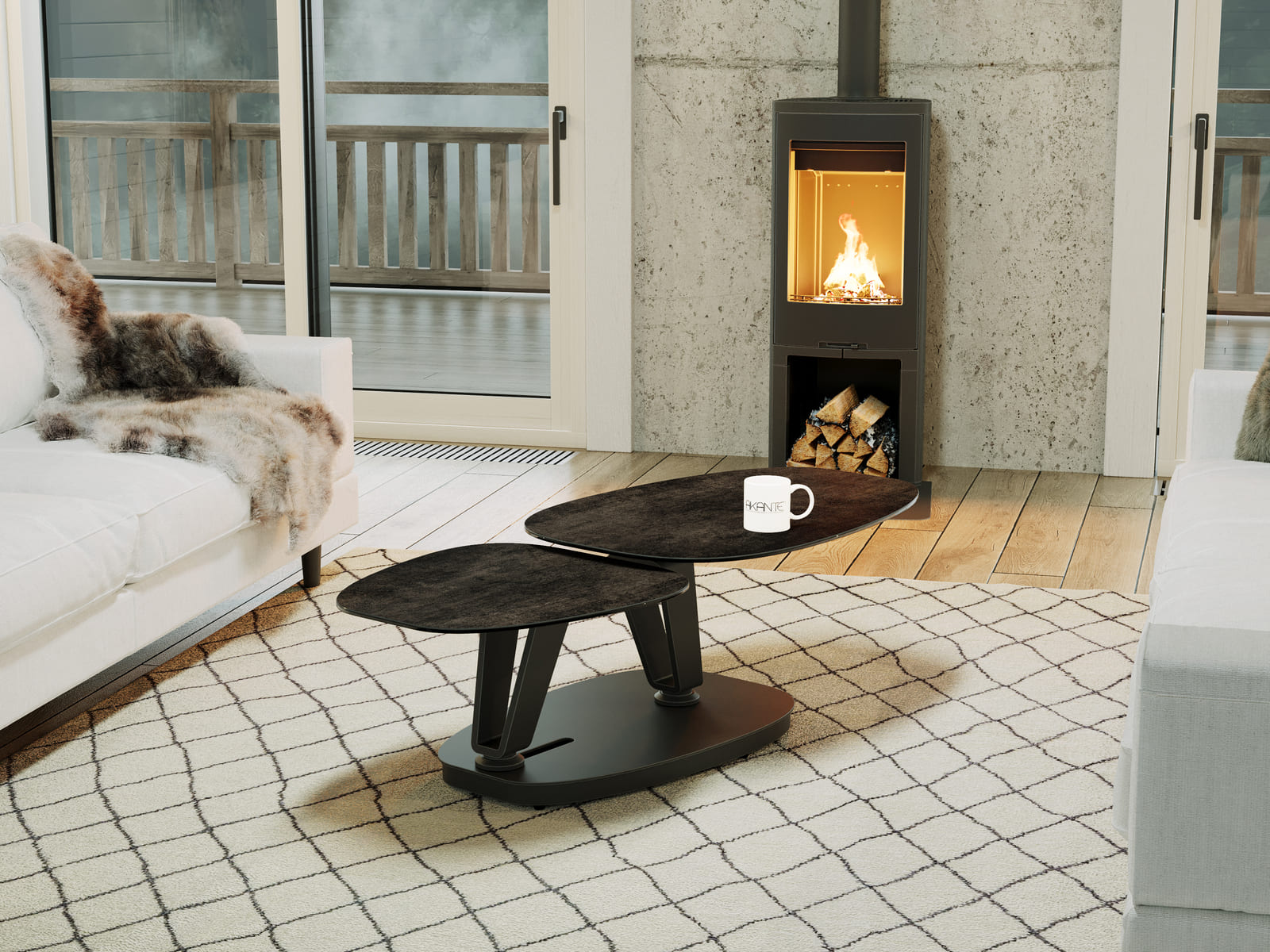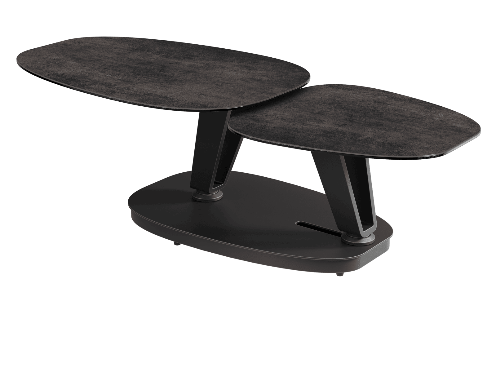La céramique Acier sublime le design élégant de la table basse Lotus. Dotée de deux plateaux mobiles en céramique de 3 mm, collée sur un verre de 6 mm, cette table allie fonctionnalité et esthétisme. Le premier plateau pivote sur lui-même, tandis que le second coulisse grâce à une glissière. Fermée, Lotus mesure : 90 x 60 x 42 cm. Ouverte, Lotus mesure : 148,5 x 60 x 42 cm. Sa structure est en acier laqué noir mat.