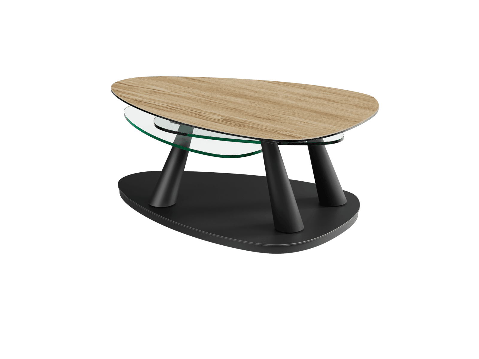 La table basse Camelia s’intègre parfaitement dans un salon contemporain. Son petit plus ? Une structure conique qui permet d’ajuster selon vos envies la position de ses deux plateaux inférieurs, conçus en verre trempé de 10 mm. Le plateau principal est fixe, il est conçu en céramique Chêne Clair de 3 mm, collée sur un verre de 6 mm. Fermée, la table basse Camelia mesure 100 x 65 cm. Ouverte, elle atteint 155 x 71 cm. Sa structure en acier laqué noir mat est dotée de roulettes pour faciliter son déplacement.