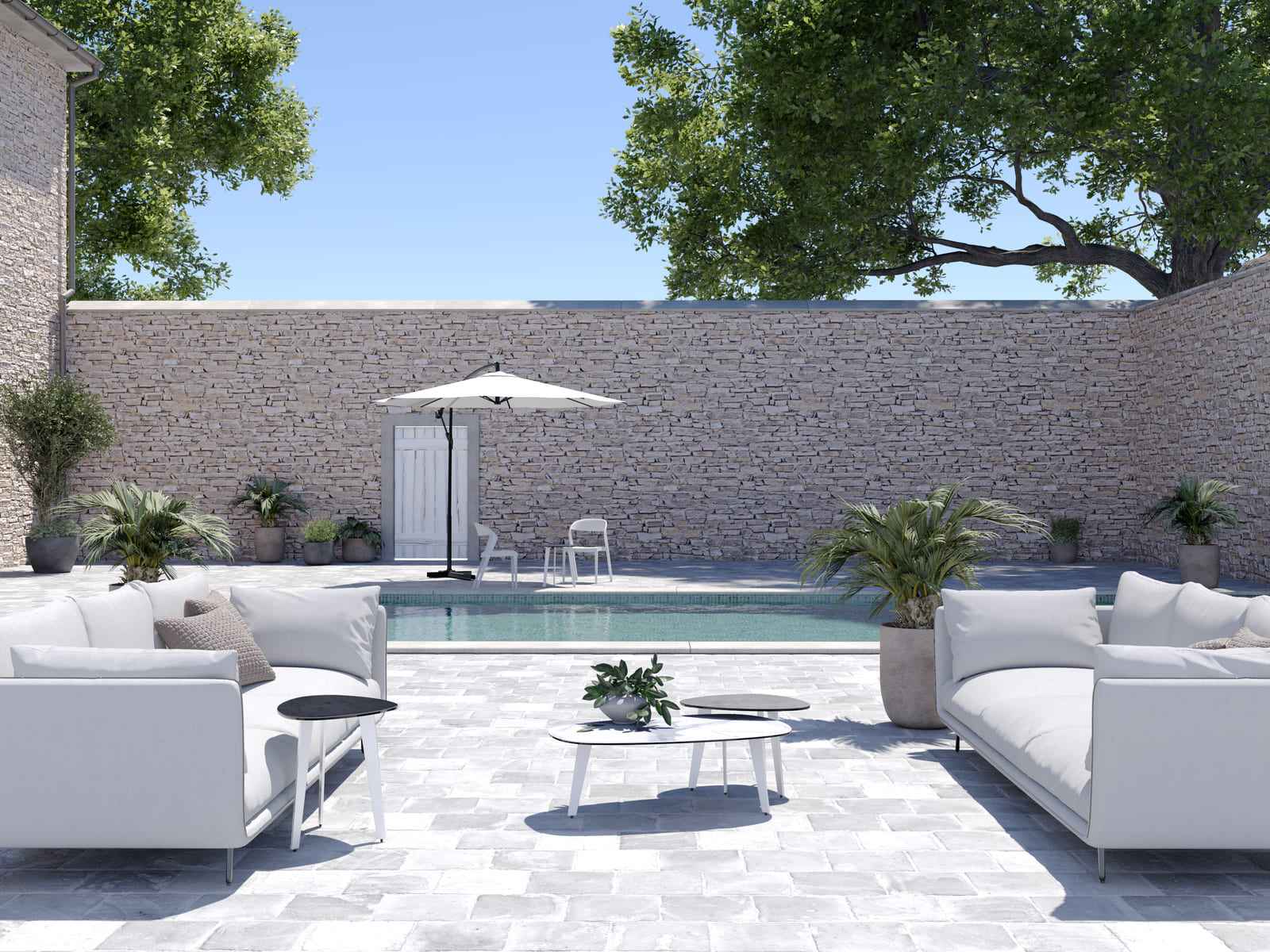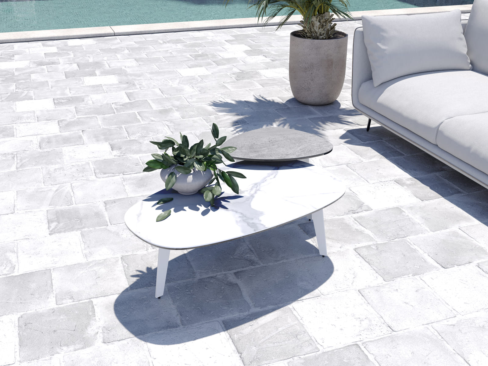 Ajoutez de la luminosité et de la modernité à votre jardin avec la table basse Galice Outdoor. C’est l’indispensable de votre jardin, sa céramique marbre complètera votre décor extérieur avec délicatesse. Elle mesure 3 mm d’épaisseur et est collée sur un vitrage de 6 mm. Sa longévité sera garantie. Jouez avec ses courbes rondes et associez-la avec les bouts de canapés Galet Outdoor. Son piètement blanc harmonisera l’ensemble. Il résistera à tous les temps grâce à sa composition 100% aluminium.