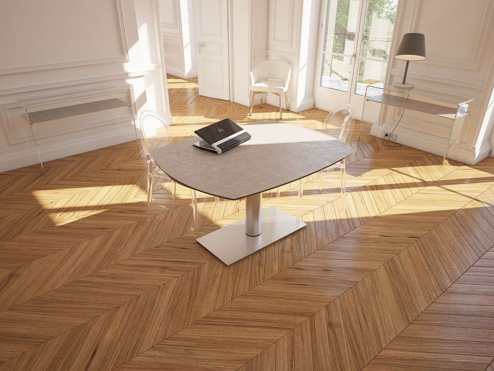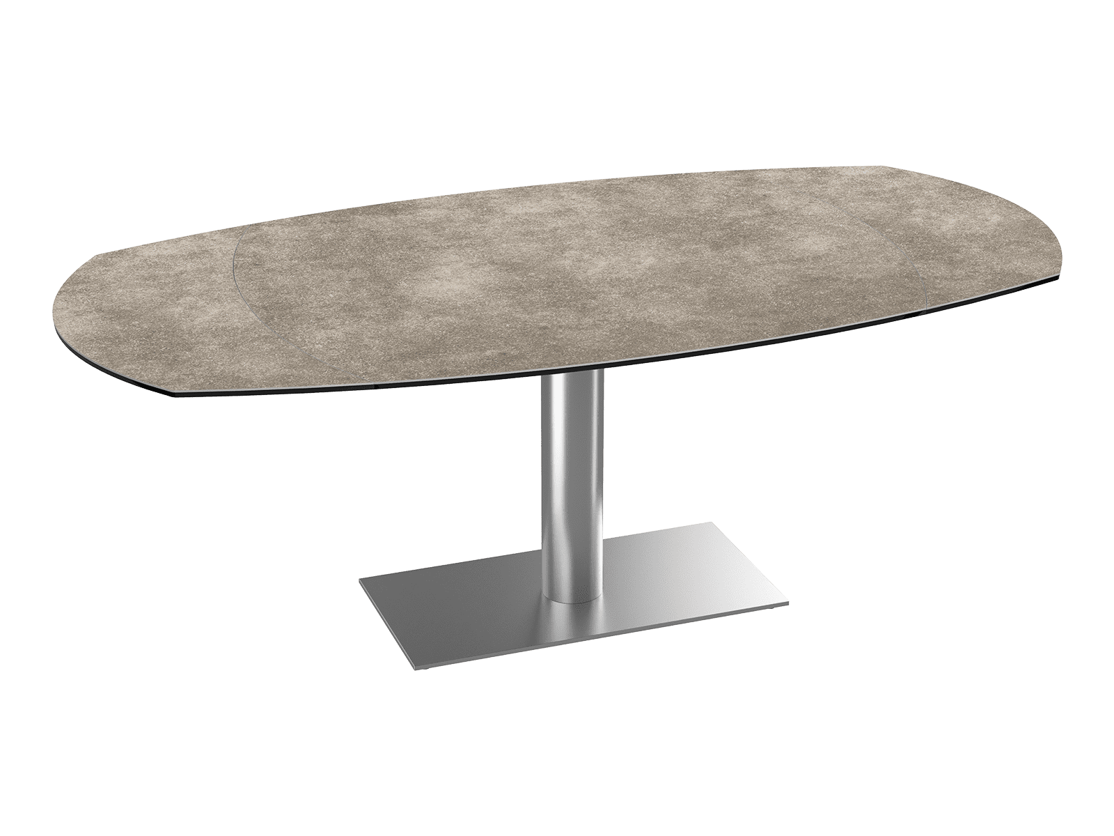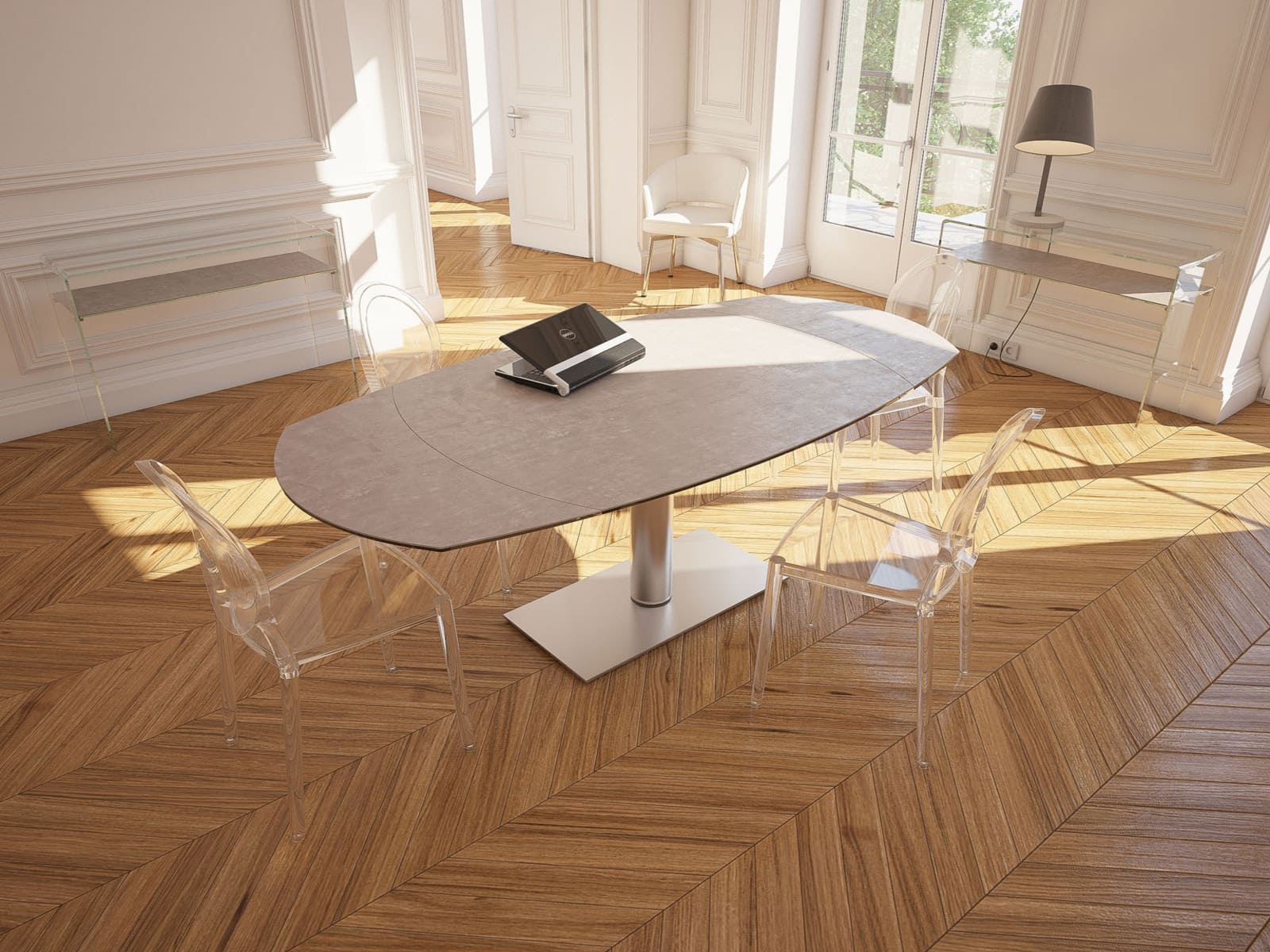 Voici la table de repas Artica. Elle possède deux rallonges, qui se placent automatiquement en actionnant la tige en dessous du plateau. Une fois ouverte elle s’étendra à 200cm. Son coloris de céramique argile associé à sa base en acier oxydable brossé lui prête un aspect moderneet classique. Son plateau est collé sur un verre de 8mm.