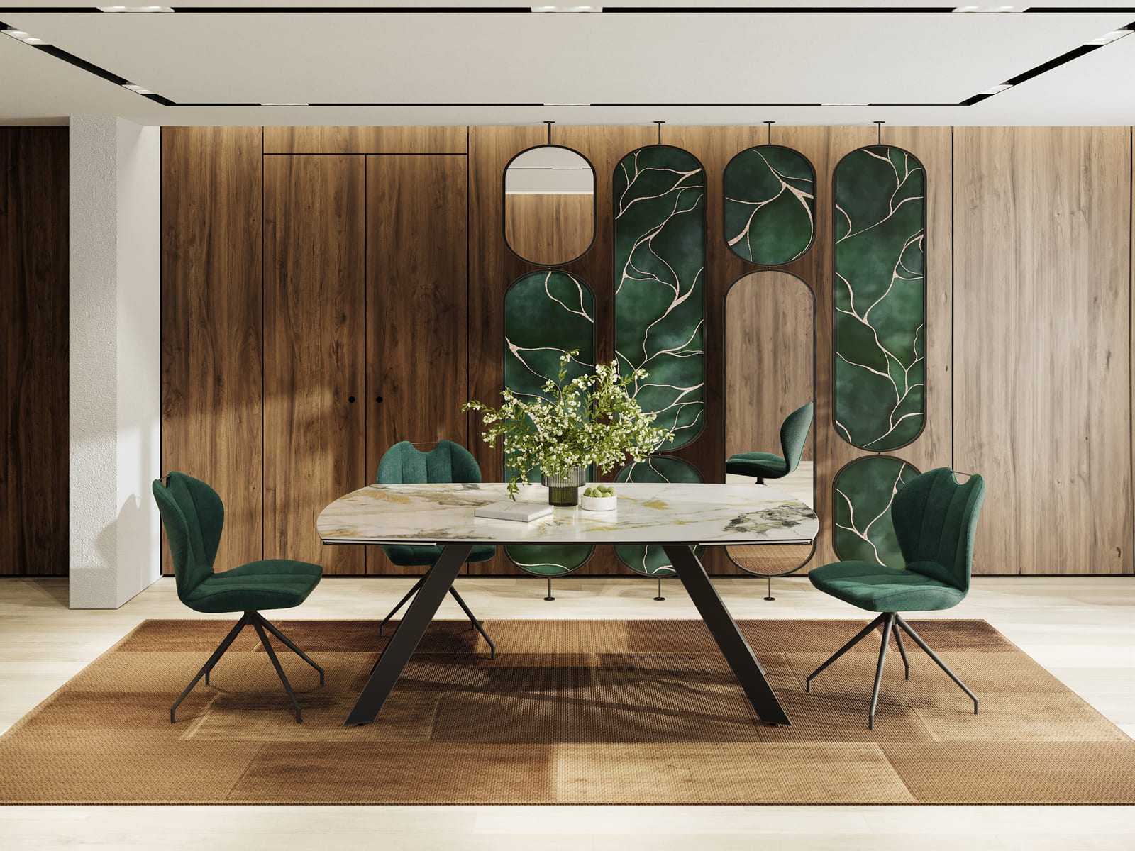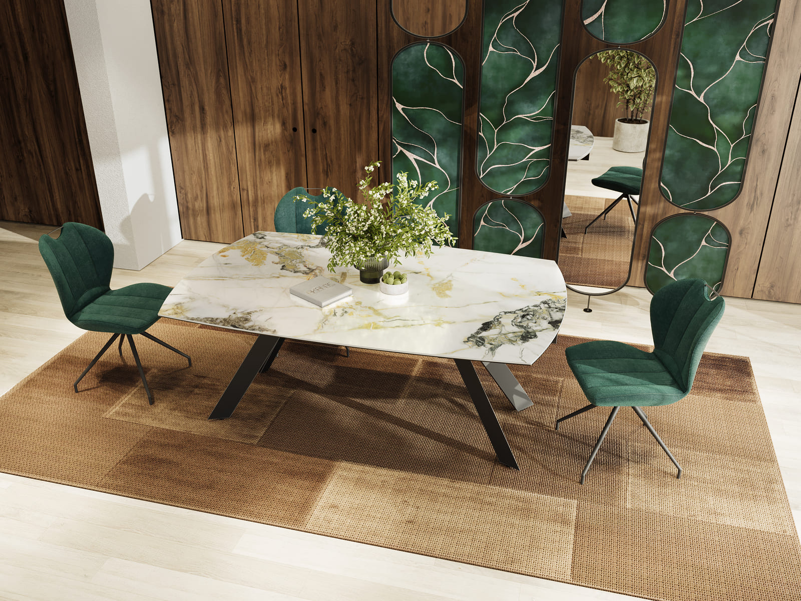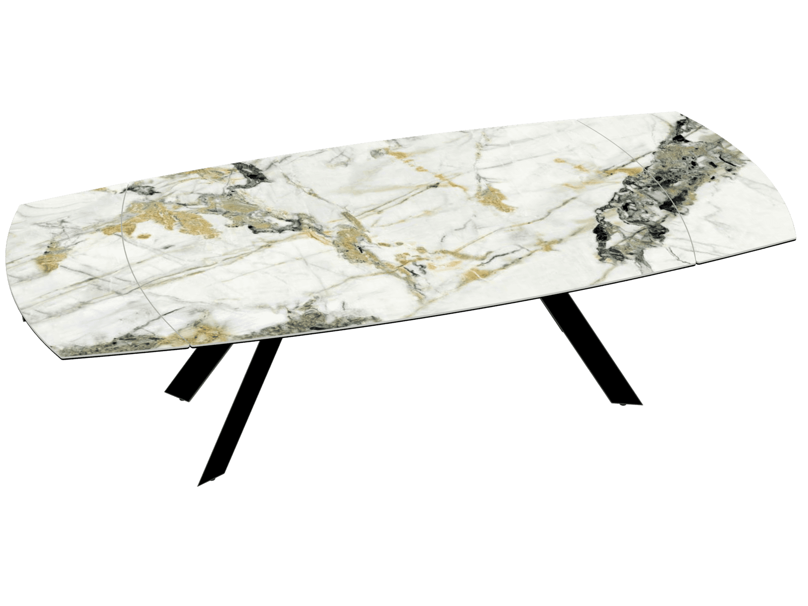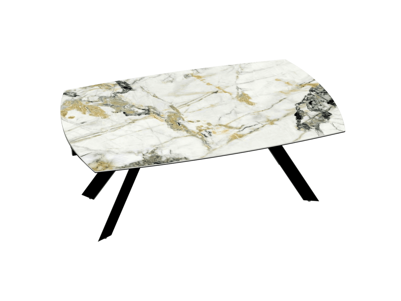 Conviviale et modulable, la table de repas Missouri vous plaira à coup sûr ! Ce modèle est conçu en céramique Marbre Doro de 6 mm, collée sur un verre de 8 mm. Missouri peut accueillir jusqu’à 12 convives. En effet, son plateau rectangulaire est doté de deux rallonges latérales de 40 cm. Passez d’une longueur de plateau de 1,90 m à 2,70 m sur une largeur de 1,20 m. Cette table trouvera sa place dans un intérieur sobre et épuré. Ses pieds sont en acier laqué noir mat.