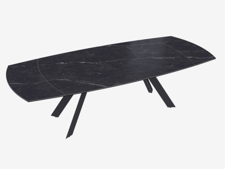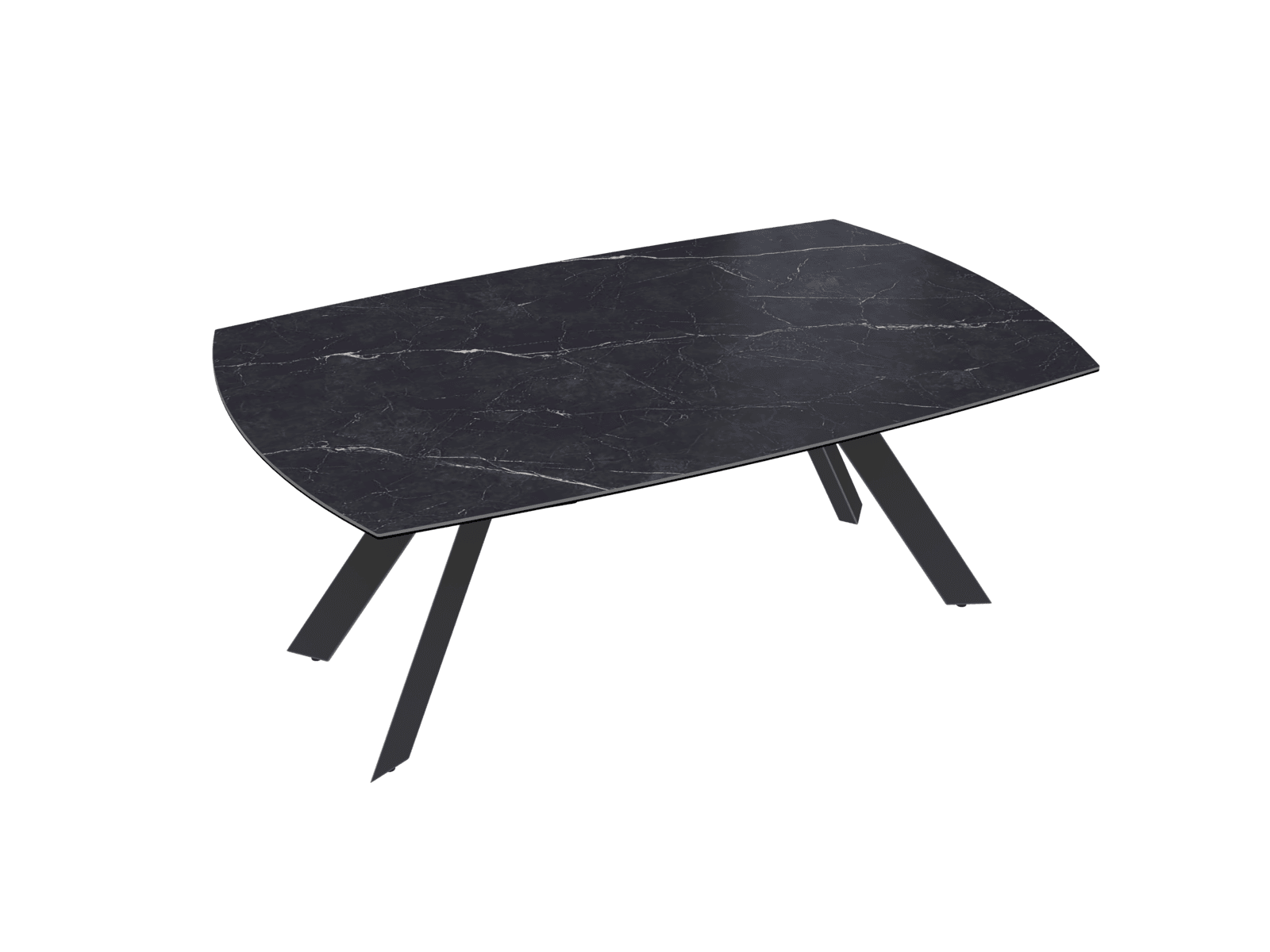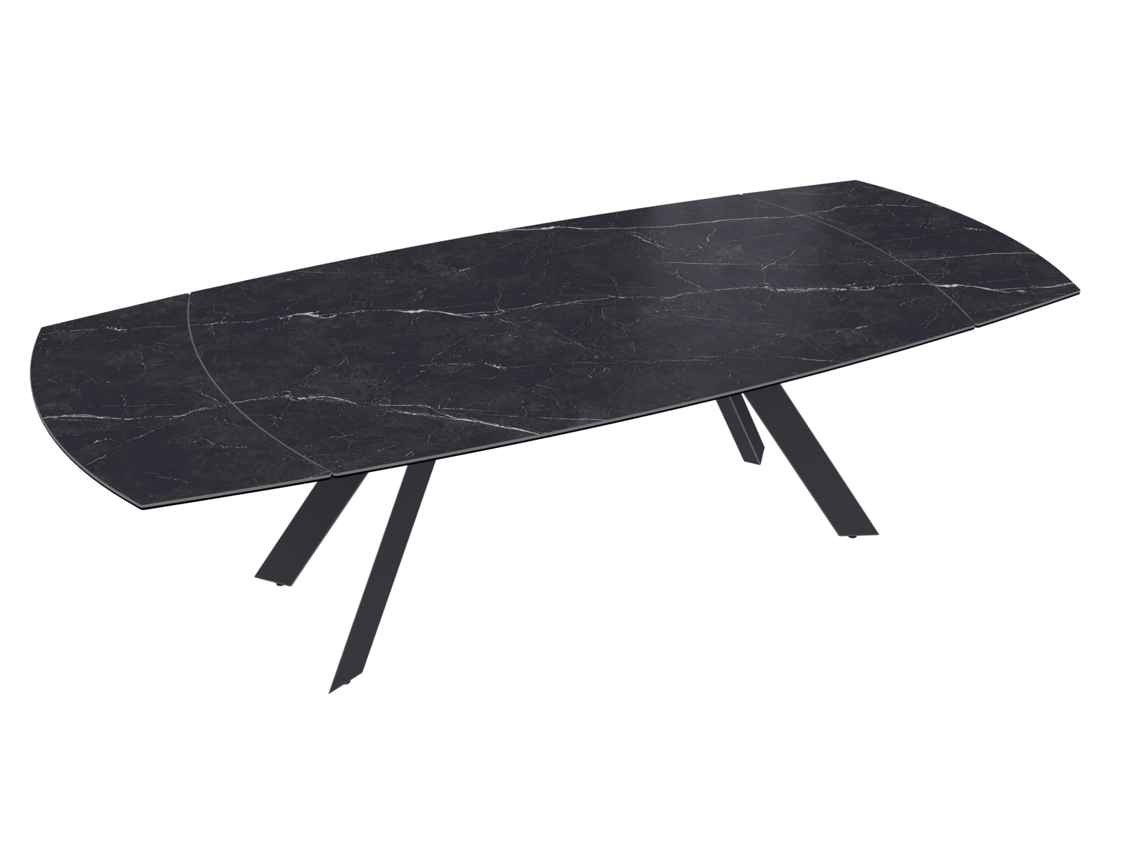 Fonctionnalité et modernité s’allient avec la table de repas Missouri. Idéale pour accueillir jusqu’à 12 convives, ce modèle convivial possède deux rallonges de 40 cm. La surface du plateau passe de 1,90 x 1,20 m à 2,70 x 1,20 m. La céramique Marbre Marquina de 6 mm, collée sur un verre de 8 mm s’associe parfaitement au piétement en acier laqué noir mat.