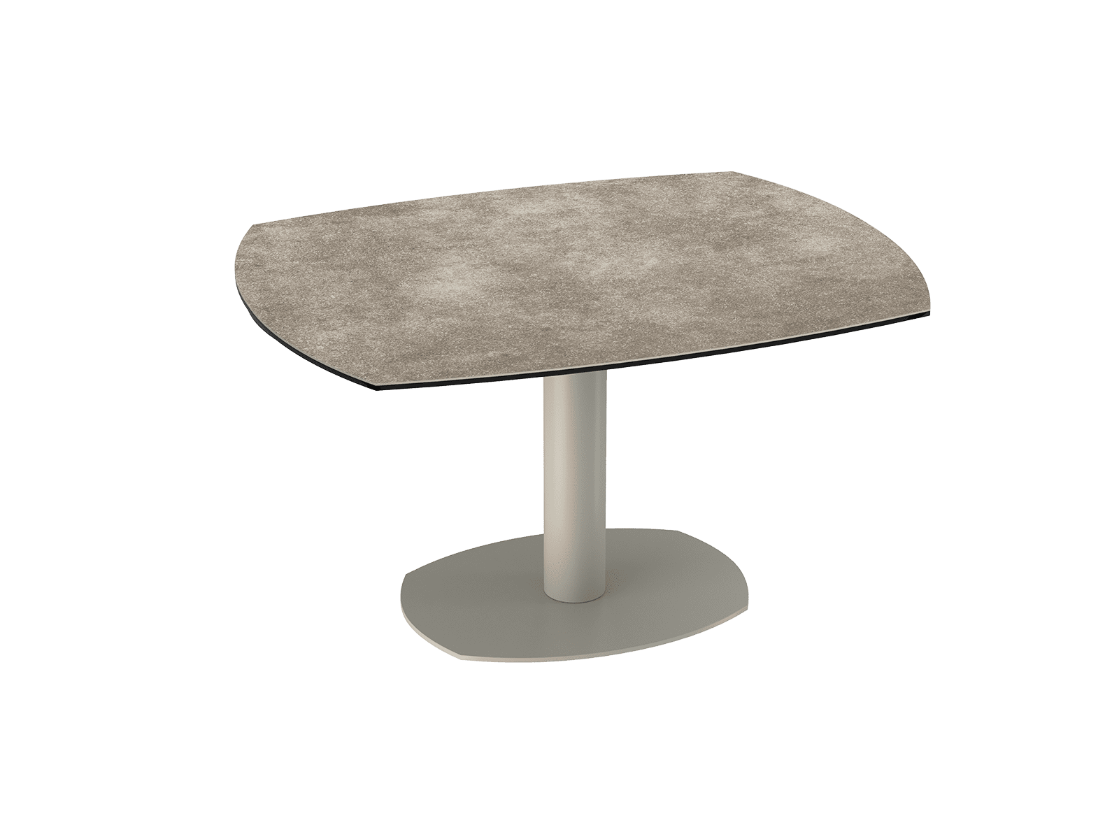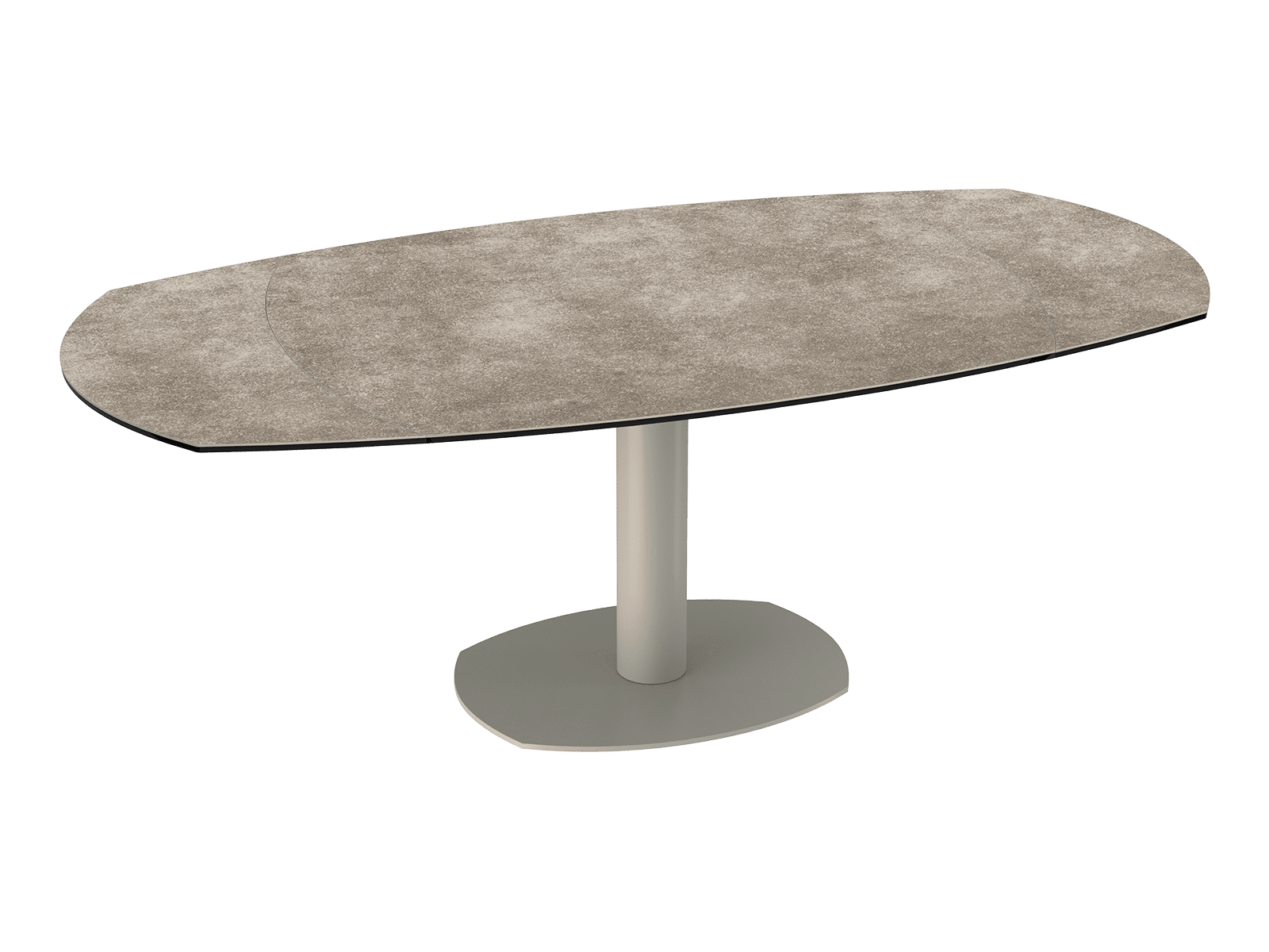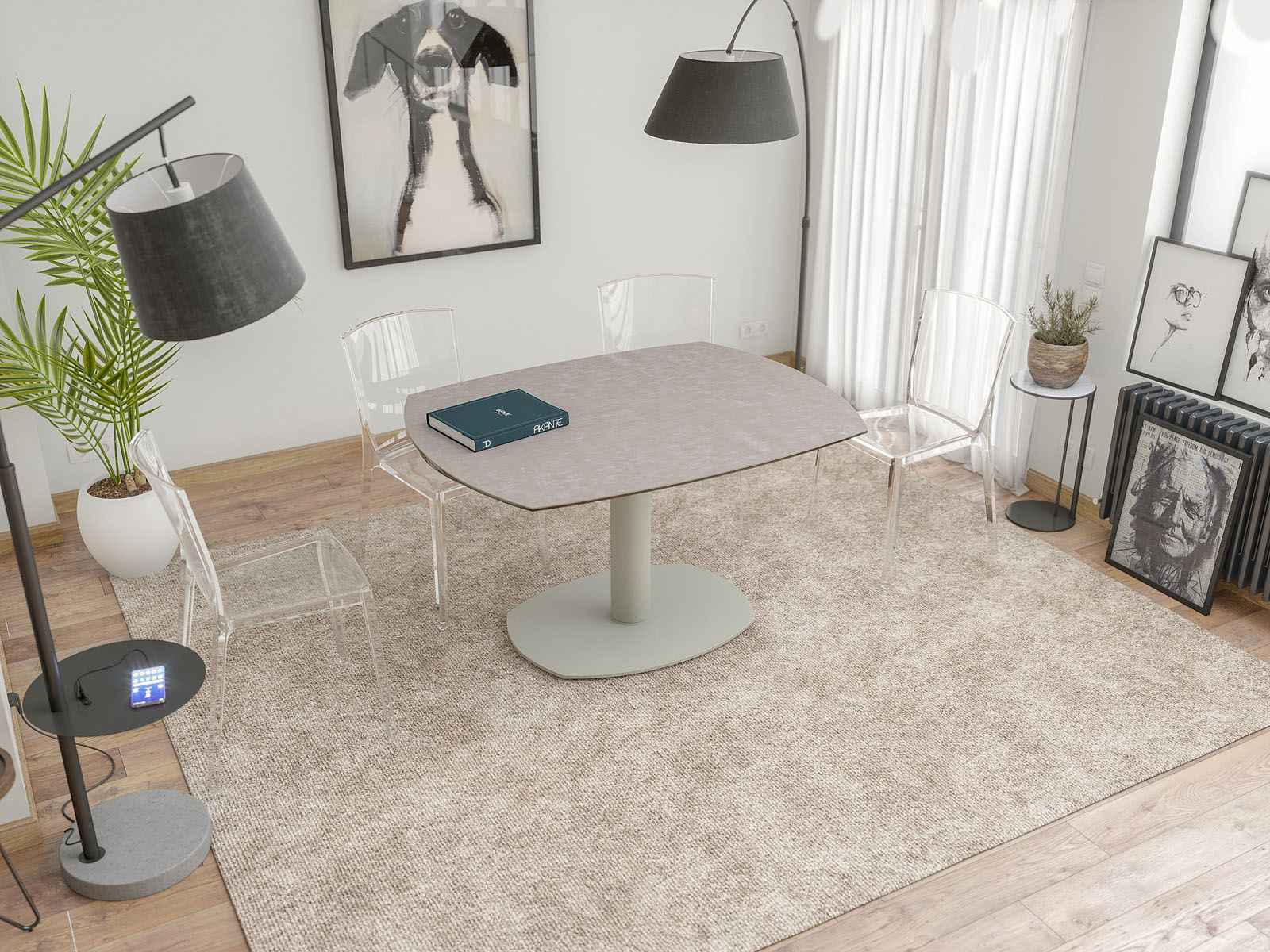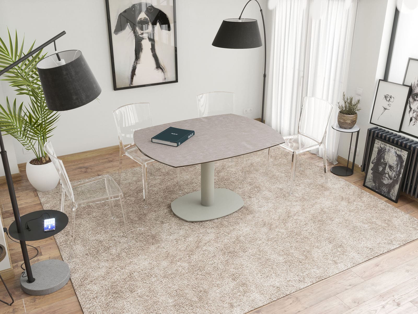 Voici la table de repas Artica. Elle possède deux rallonges, qui se placent automatiquement en actionnant la tige en dessous du plateau. Ouverte, elle s’étendra a 200cm de long. Son coloris de céramique argile associé a son pied en verre, lui donne un aspect chic et sobre. Son plateau est collé sur un verre de 8mm.