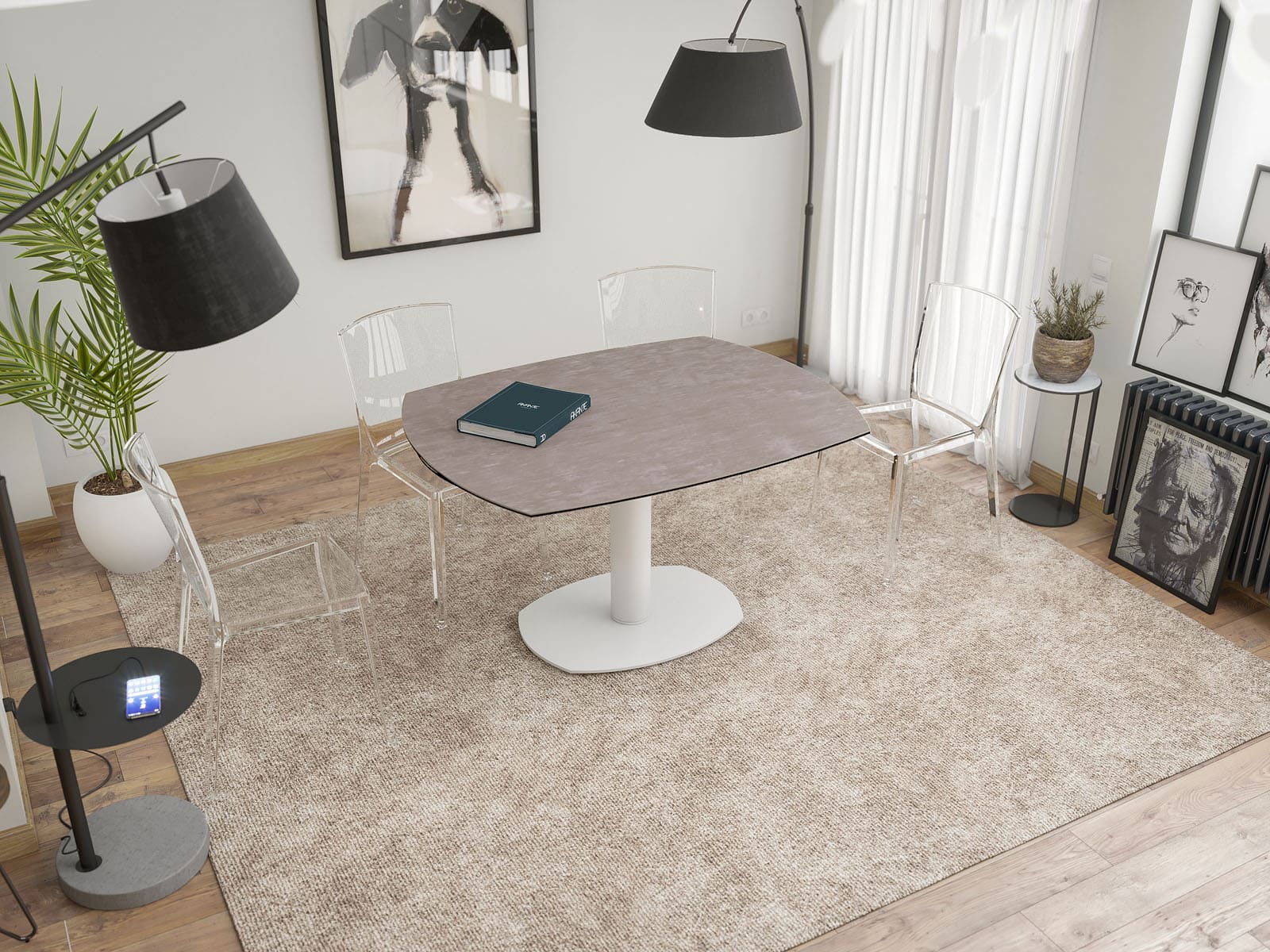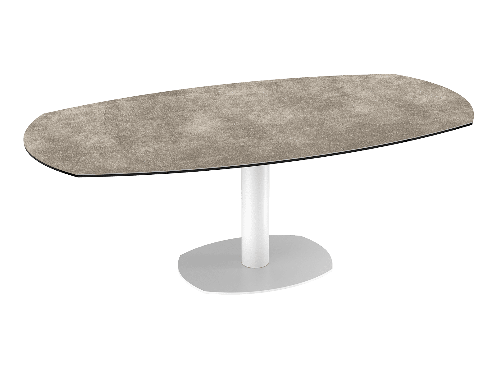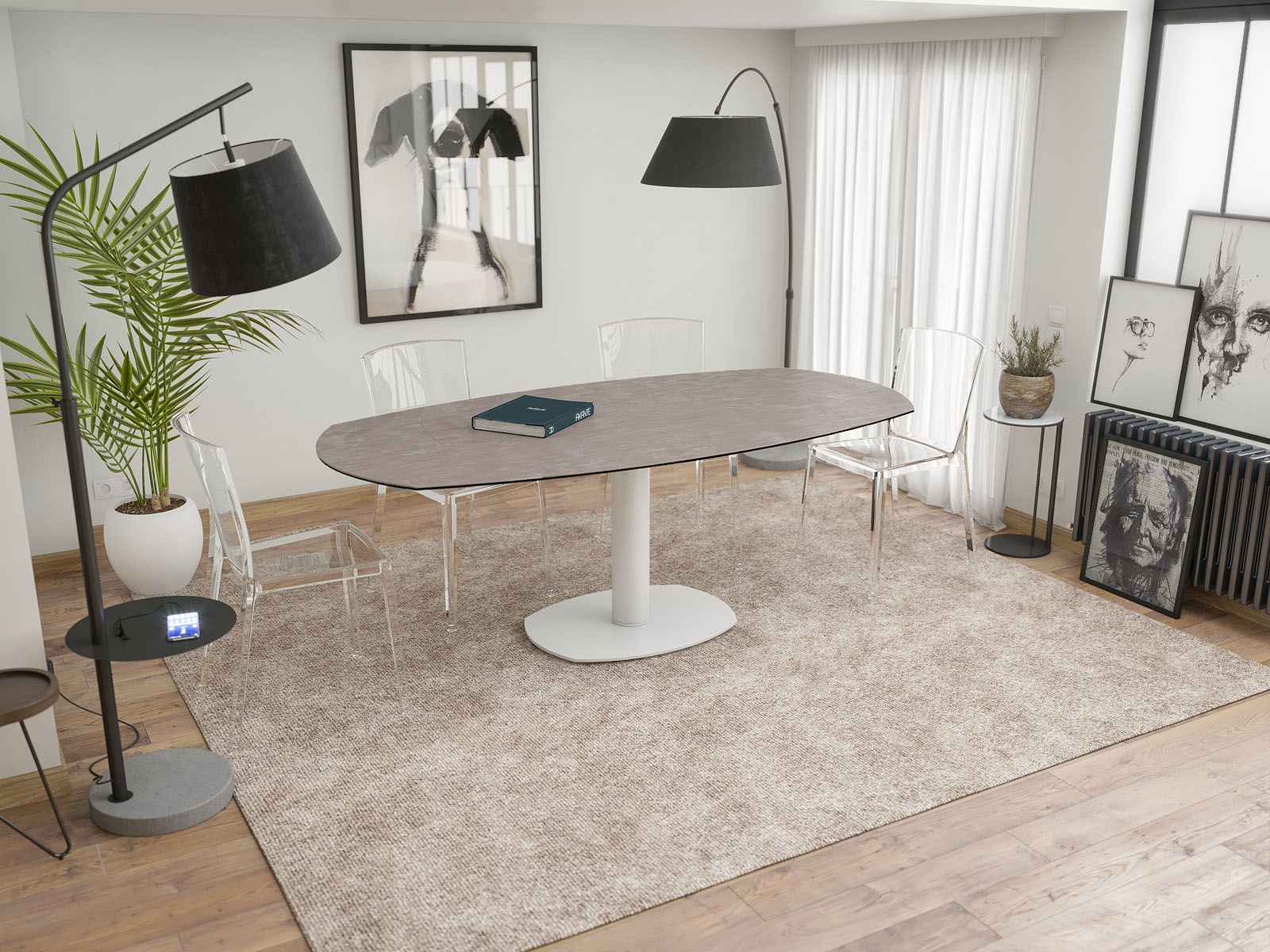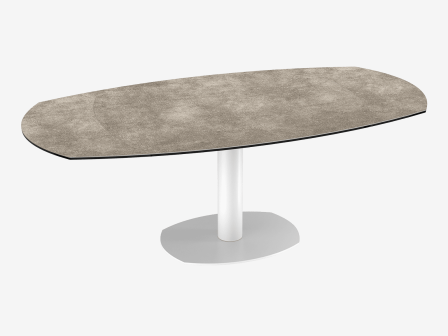 Voici la table de repas Artica. Elle possède deux rallonges, qui se placent automatiquement en actionnant la tige en dessous du plateau. Ouverte, elle s’étendra a 200cm de long. Son coloris de céramique argile associé a son pied en verre, lui donne un aspect chic et sobre. Son plateau est collé sur un verre de 8mm.