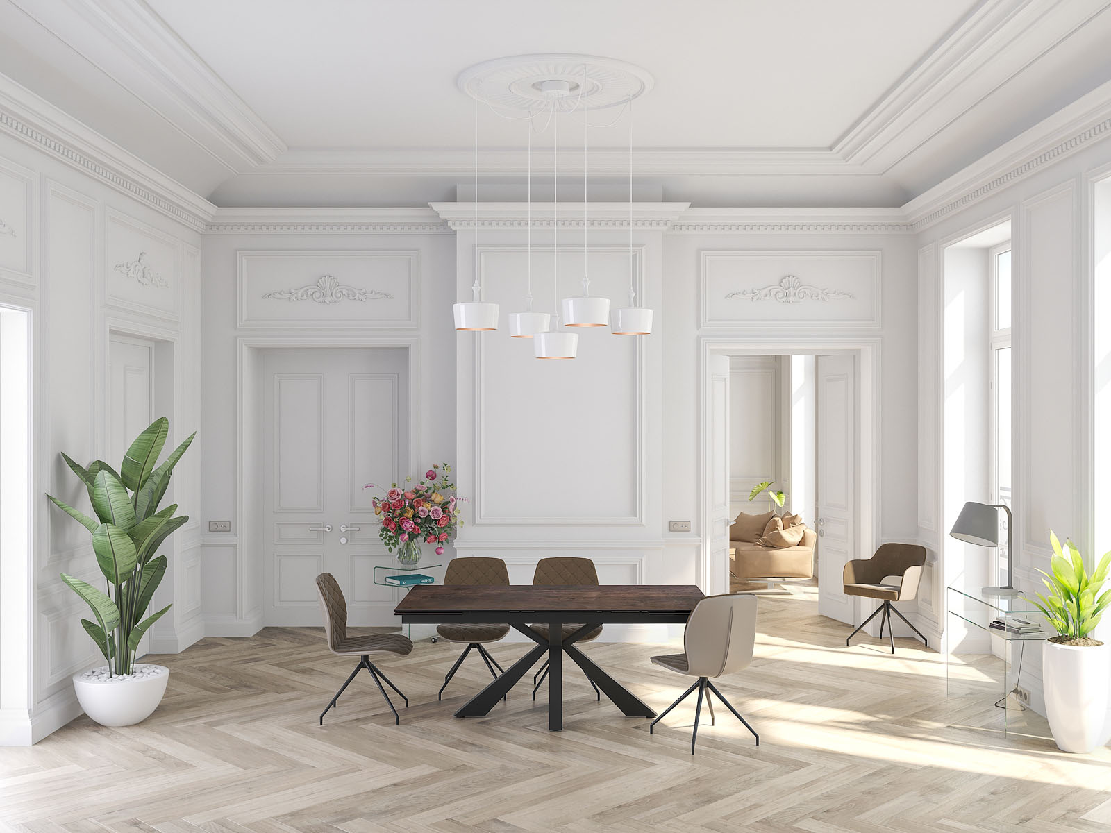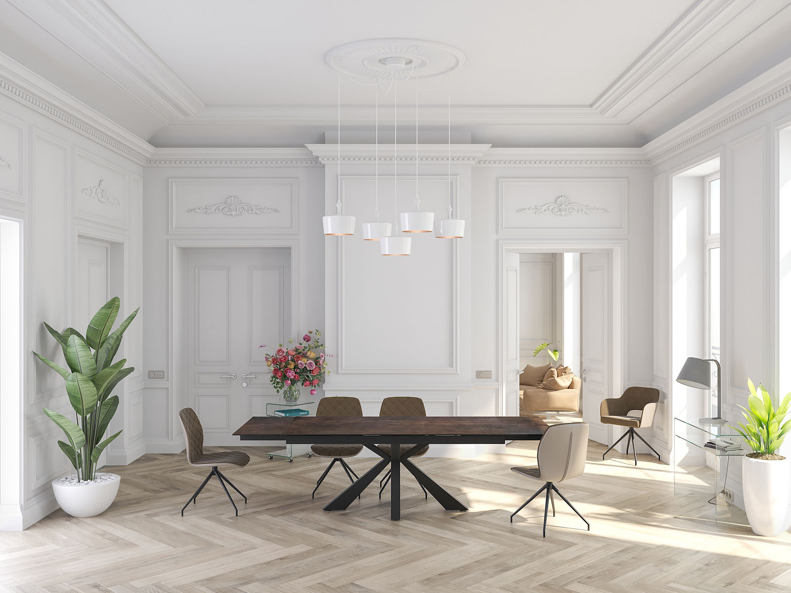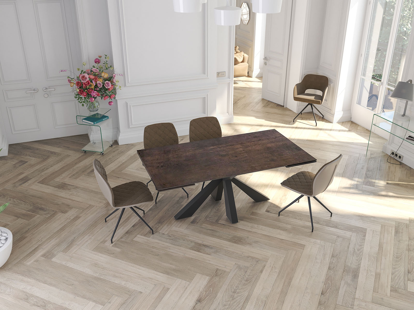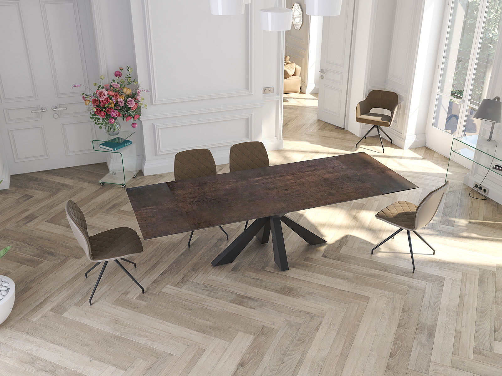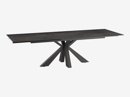 La table Ottawa de chez Akante est une table de repas familiale d’une longueur de 190 cm. Large de 100 cm, elle dispose de deux rallonges de 40 cm qui se logent sous le plateau central et que vous pouvez sortir indépendamment. La table Ottawa repose sur un piétement central au dessin original qui ne gêne pas les convives. Elle se décline en trois céramiques fabriquées en Europe : titane, argile, acier et marbrée. Toutes les céramiques sont collées sur un vitrage de 8 mm. Présentée ici avec une céramique acier