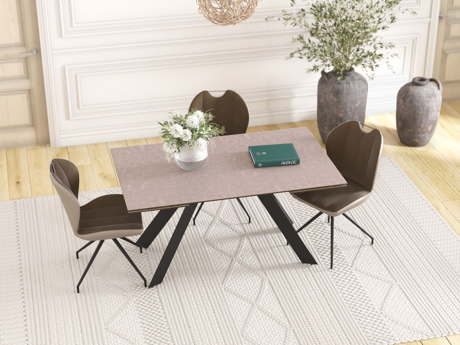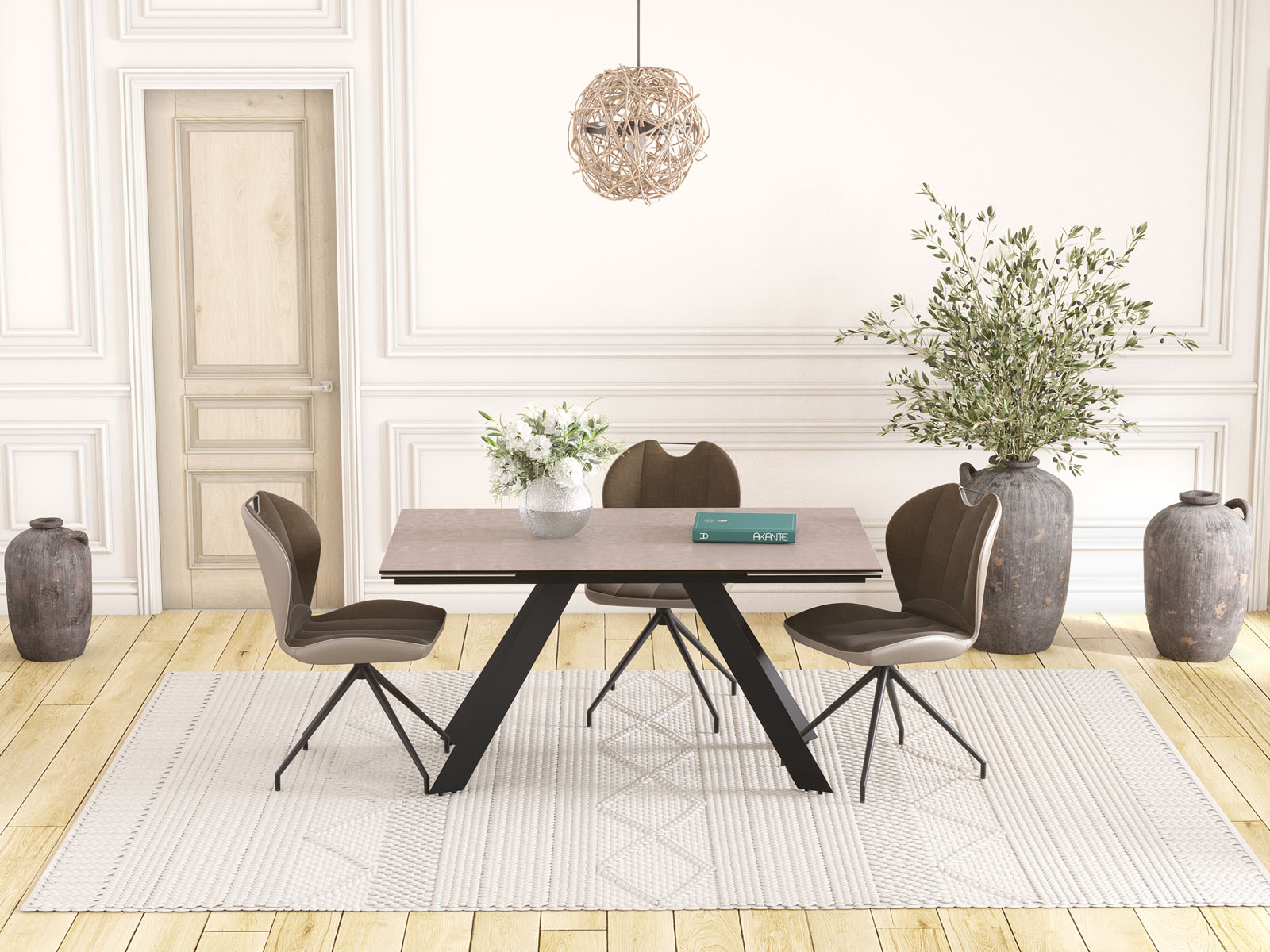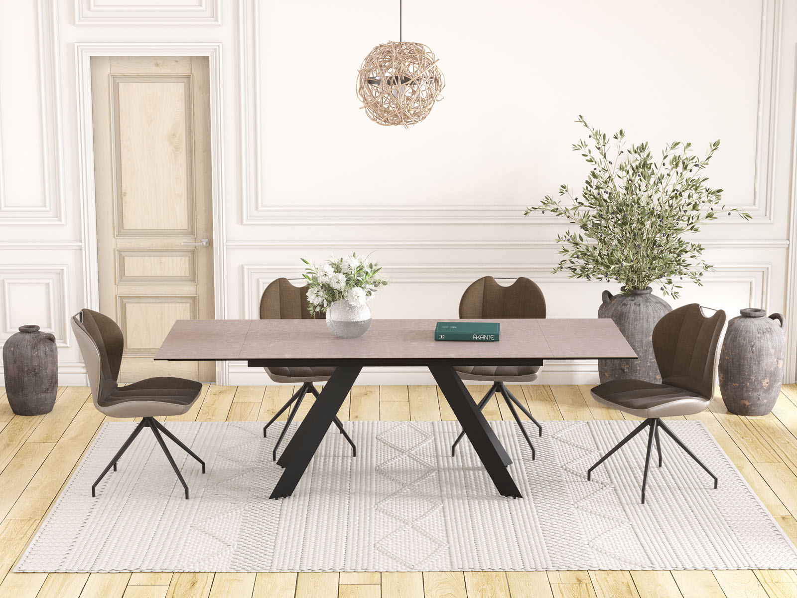 La table Ontario de chez Akante est élégante et simple. Ses pieds sont fuselés et bien proportionnés. Son plateau est en céramique de 3mm (origine Espagne) collée sur un vitrage de 8mm afin de lui donner une excellente résistance aux assauts du temps. La table de repas ONTARIO dispose de 2 rallonges de 40cm en bout qui permettent aisément d’agrandir la table. Cette table ONTARIO est disponible en différentes finitions de céramique et en deux dimensions. Présentée ici avec un plateau en céramique argile de 150cm de long. Les rallonges permettent alors d’agrandir la table à 230cm.