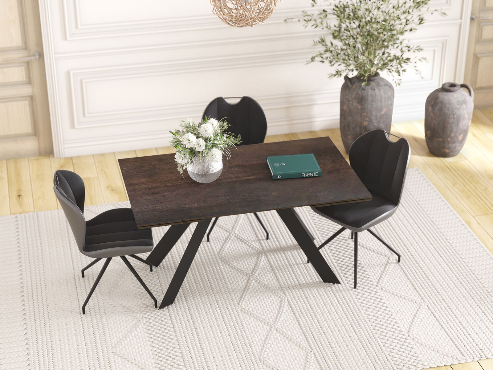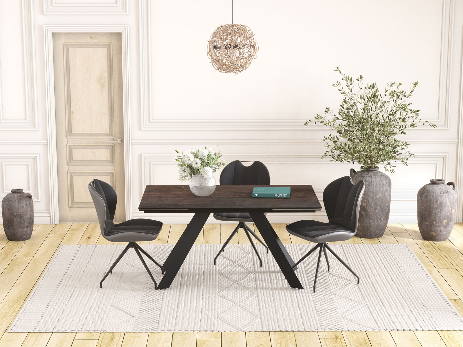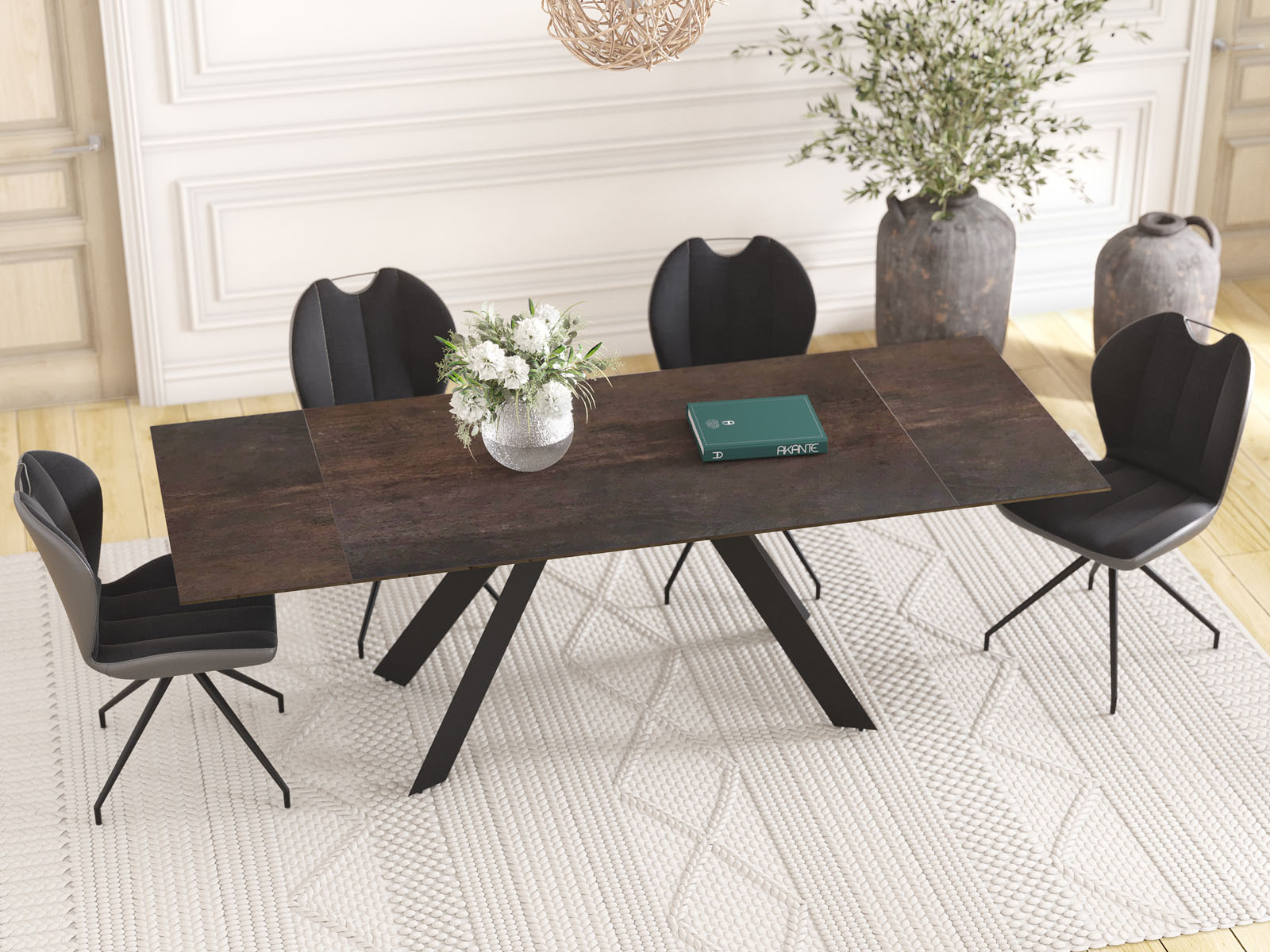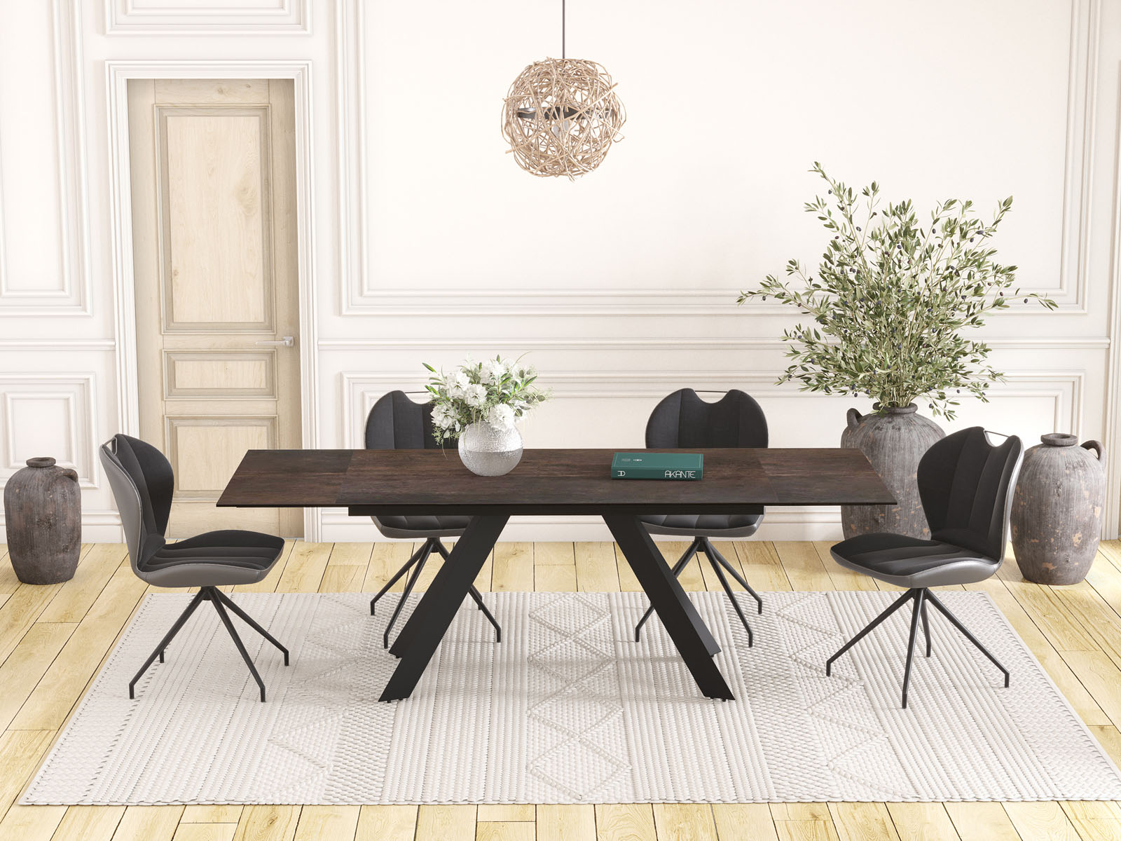 La table Ontario de chez Akante est élégante et simple. Ses pieds sont fuselés et bien proportionnés. Son plateau est en céramique de 3mm (origine Espagne) collée sur un vitrage de 8mm afin de lui donner une excellente résistance aux assauts du temps. La table de repas ONTARIO dispose de 2 rallonges de 40cm en bout qui permettent aisément d’agrandir la table. Cette table ONTARIO est disponible en différentes finitions de céramique et en deux dimensions. Présentée ici avec un plateau en céramique acier de 150cm de long. Les rallonges permettent alors d’agrandir la table à 230cm.