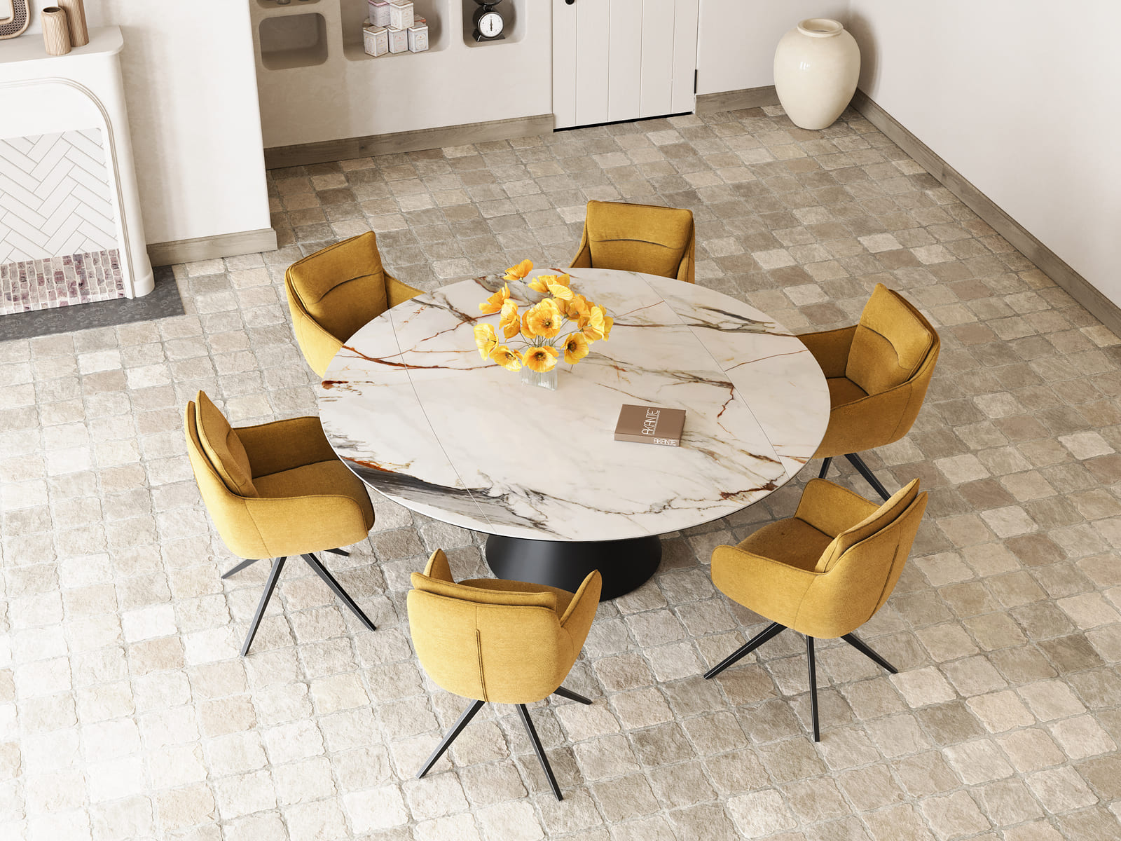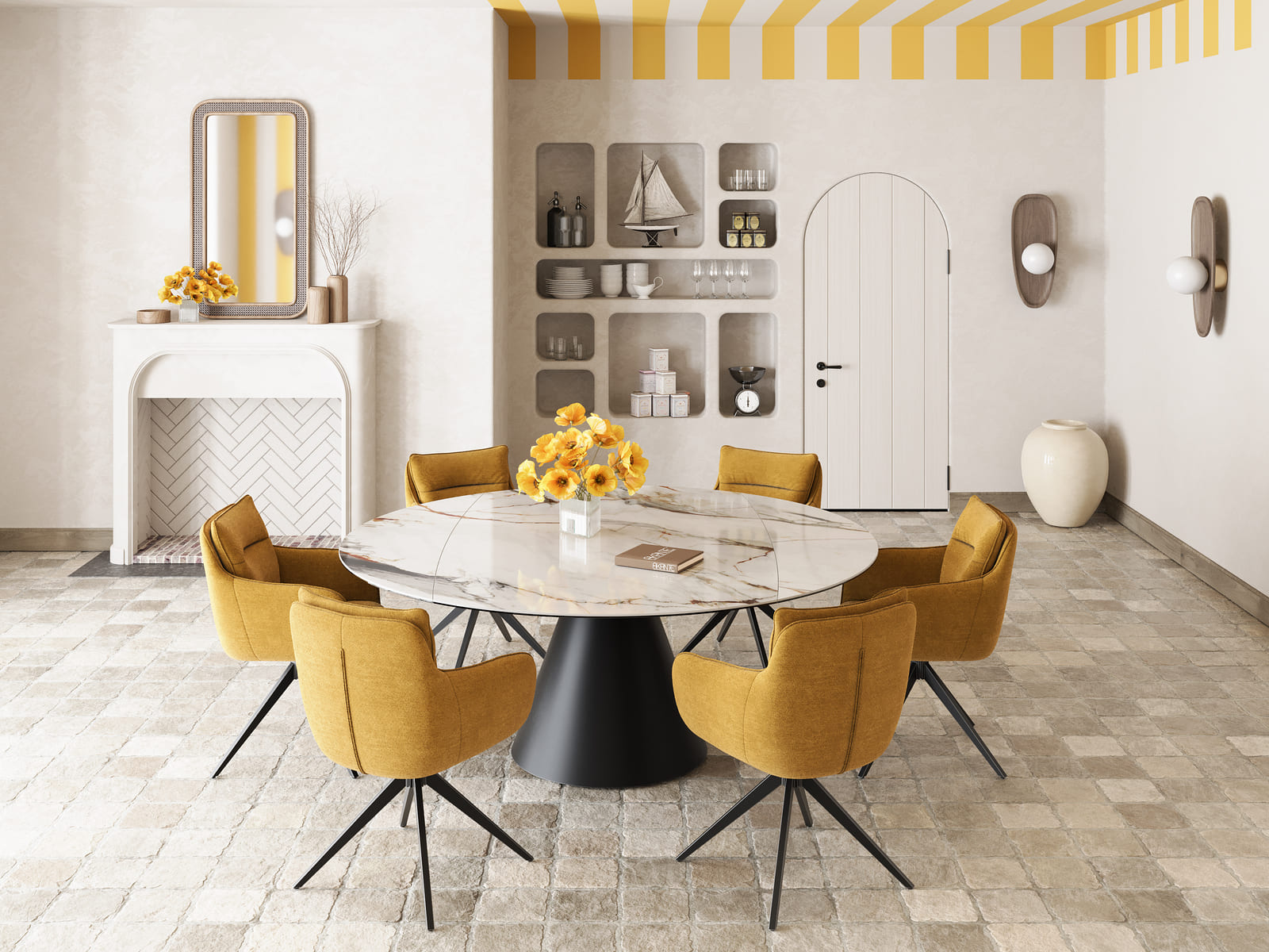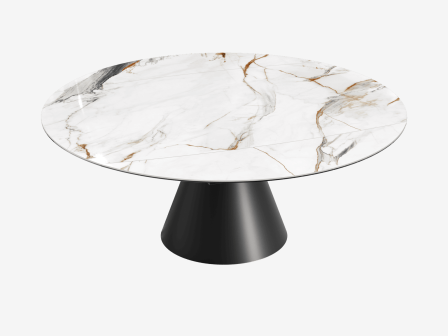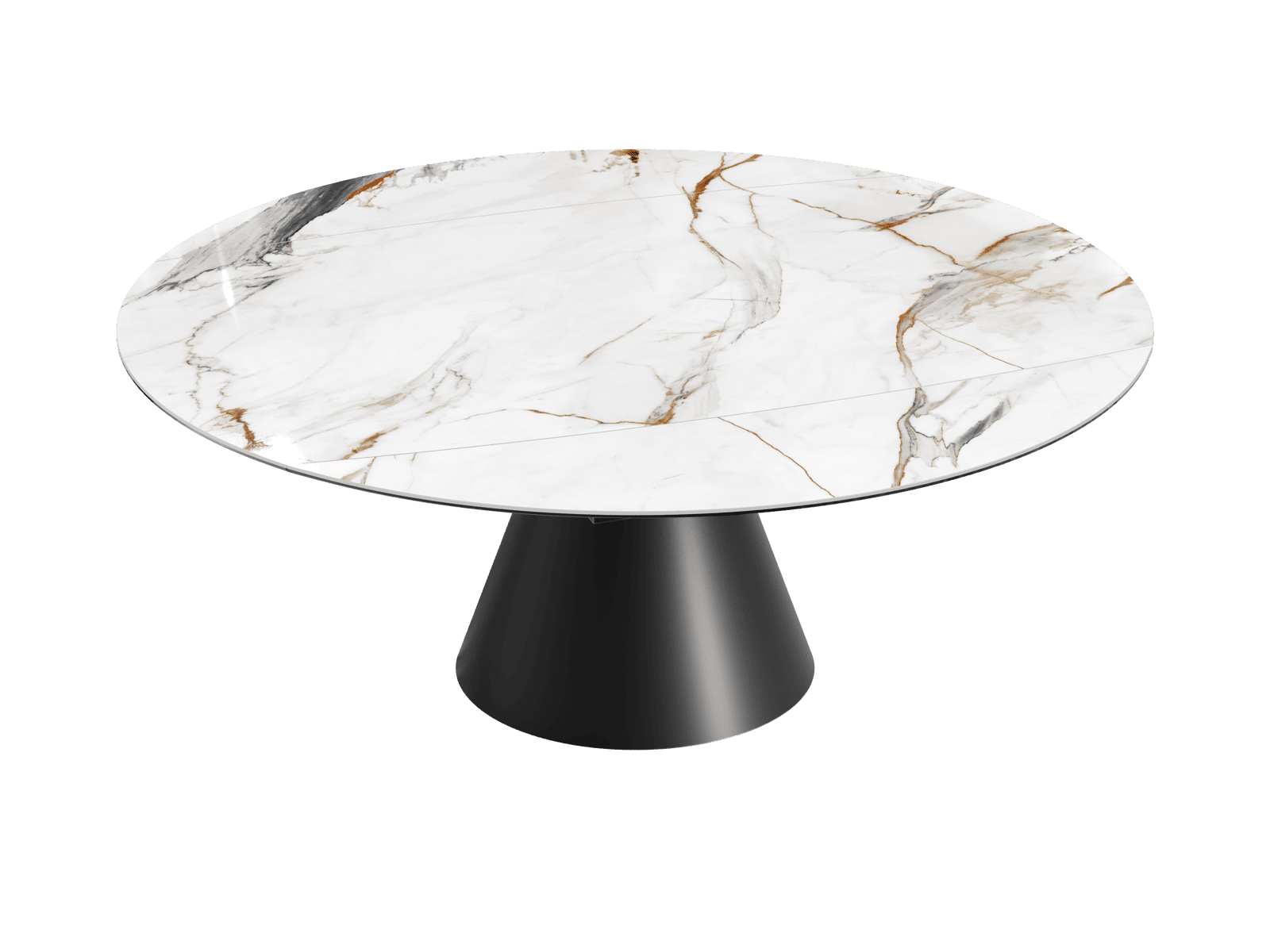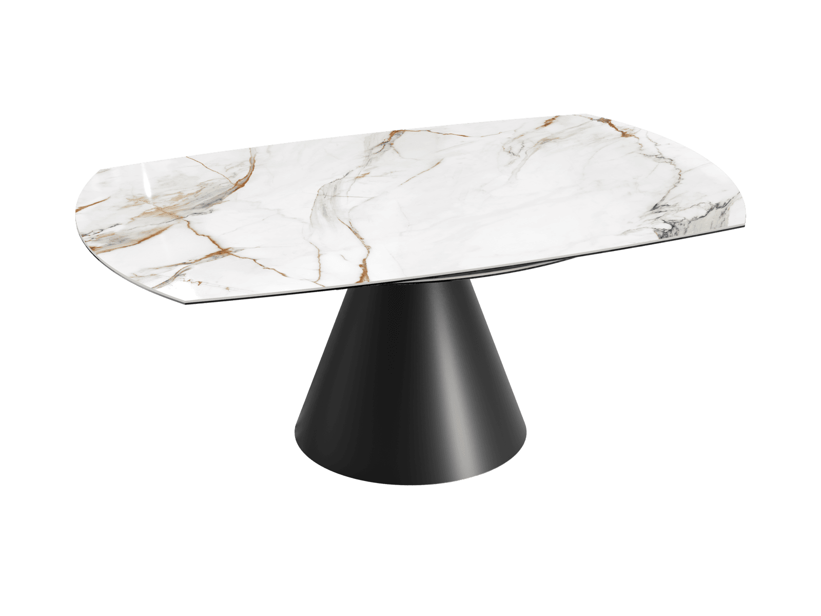La collection de table ICONE se décline désormais en format XXL avec le modèle GRANDE ICONE. Une pièce maîtresse qui surprendra vos convives. Sa particularité réside dans son plateau doté d’un mécanisme synchronisé et breveté Akante. En effet, d’un simple geste de la main, ce plateau de 115 x 190 cm se transforme en un plateau rond de 190 cm grâce à deux rallonges intégrées de 37,5 cm. Sa surface est conçue en céramique Marbre Fiorentino de 6 mm collée sur un verre de 8 mm. Son piétement en forme conique est en acier laqué noir mat.