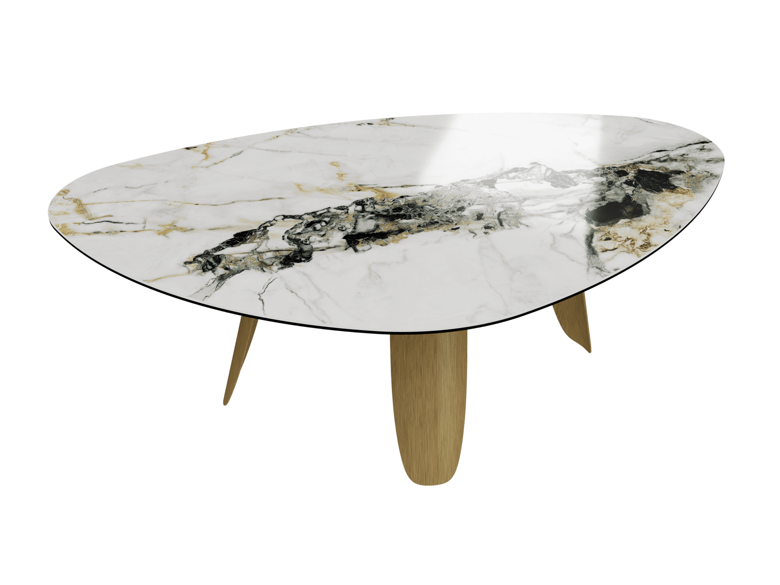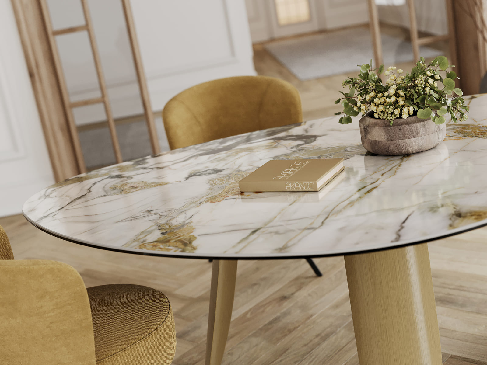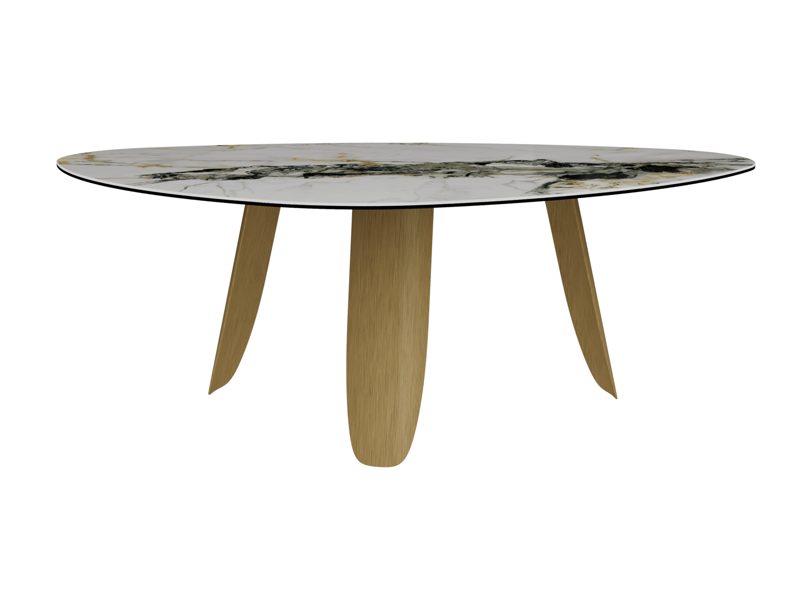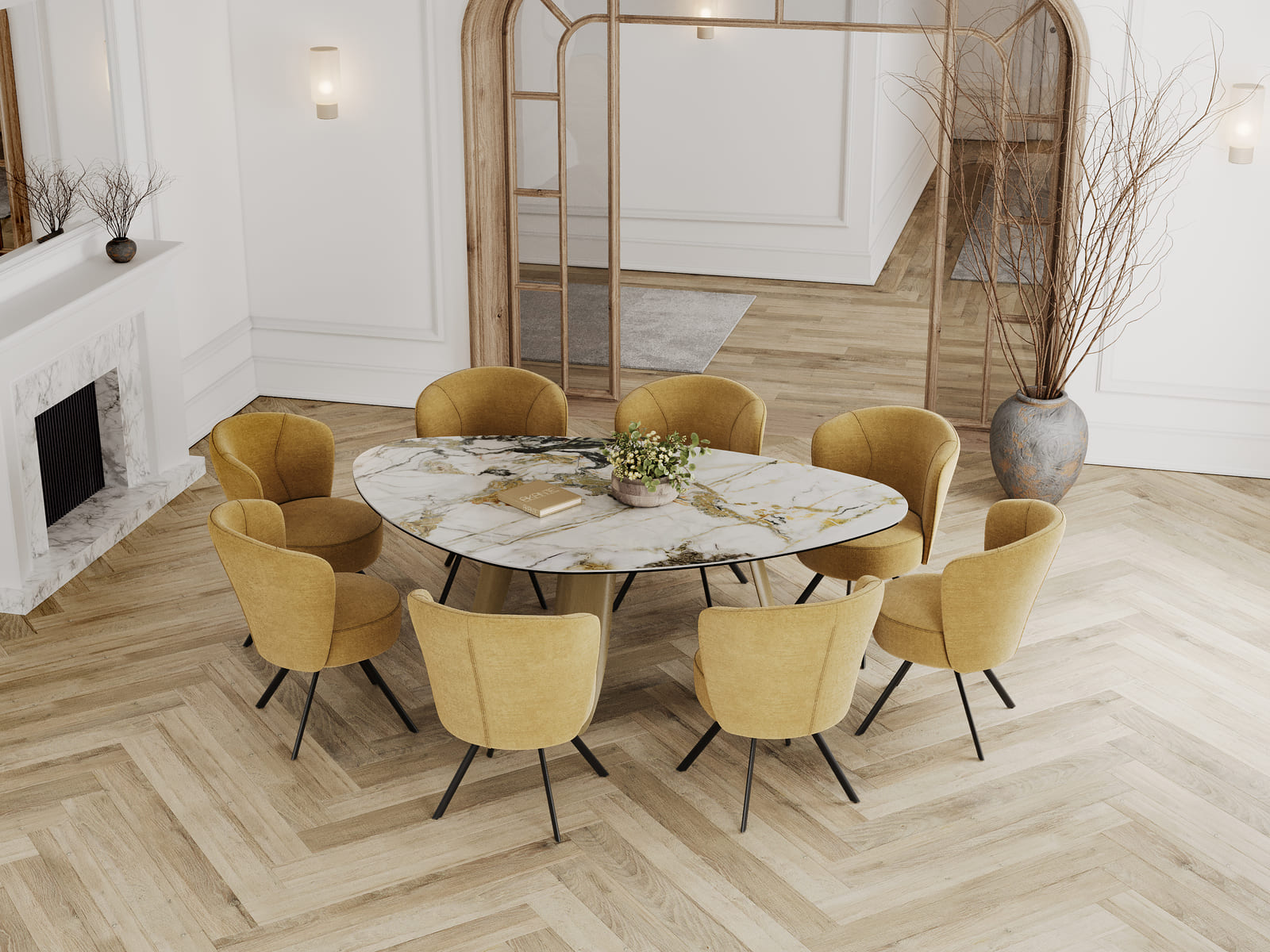 Laissez-vous séduire par la collection Bonifacio, élégante et contemporaine. Cette table de repas se distingue par son plateau organique, sublimé par les veinures ocre de la céramique Marbre Doro. Le plateau est conçu en céramique de 6 mm collée sur 8 mm de verre. Cette table mesure 2,10 m x 1,30 m, elle vous permet d’accueillir entre 6 et 8 convives. Son piétement pétale au design raffiné, crée une légèreté visuelle. Conçu en acier laqué effet bronze, il s’harmonise parfaitement avec son plateau.