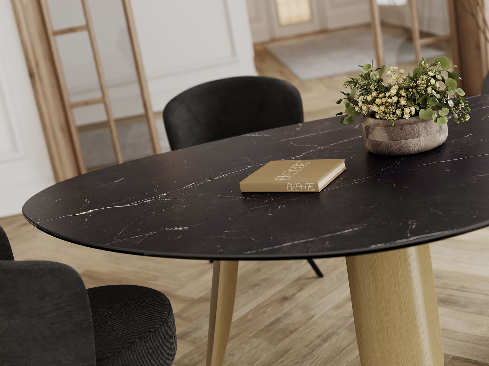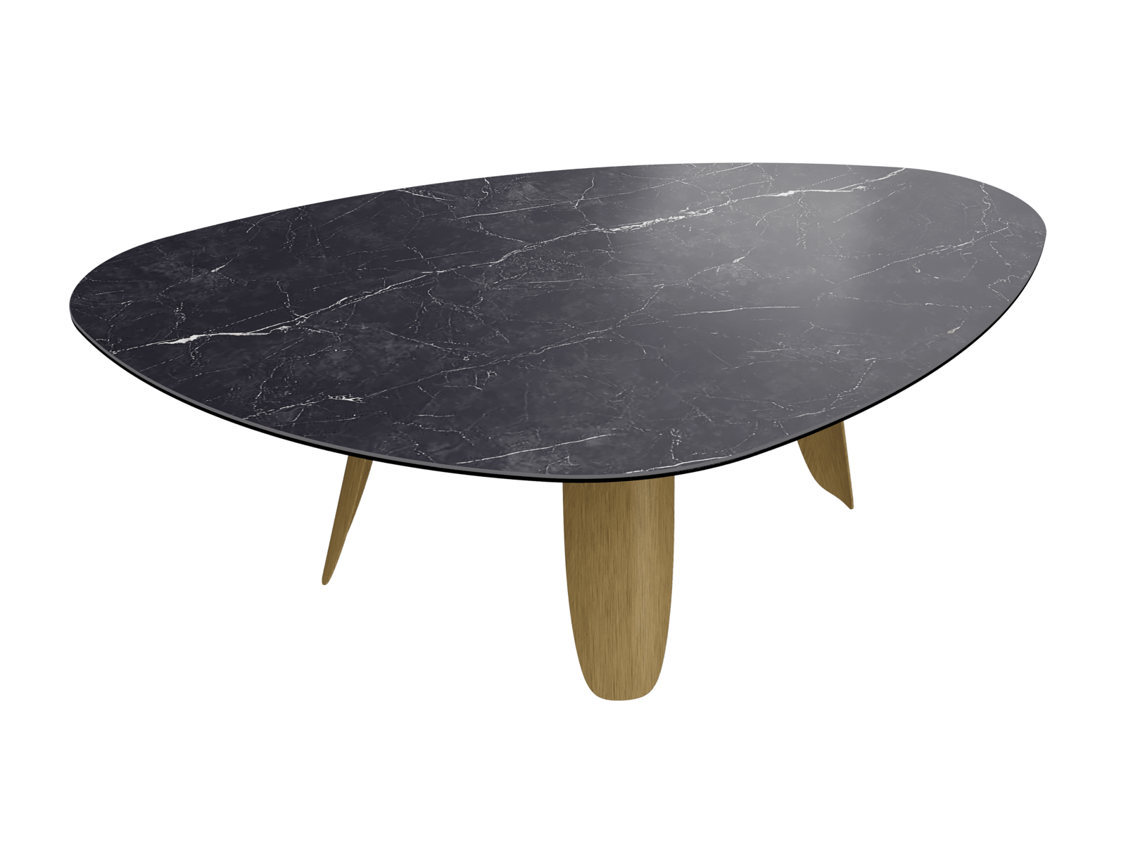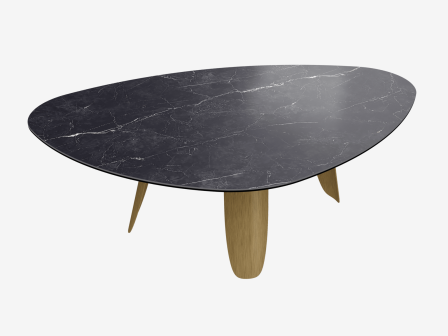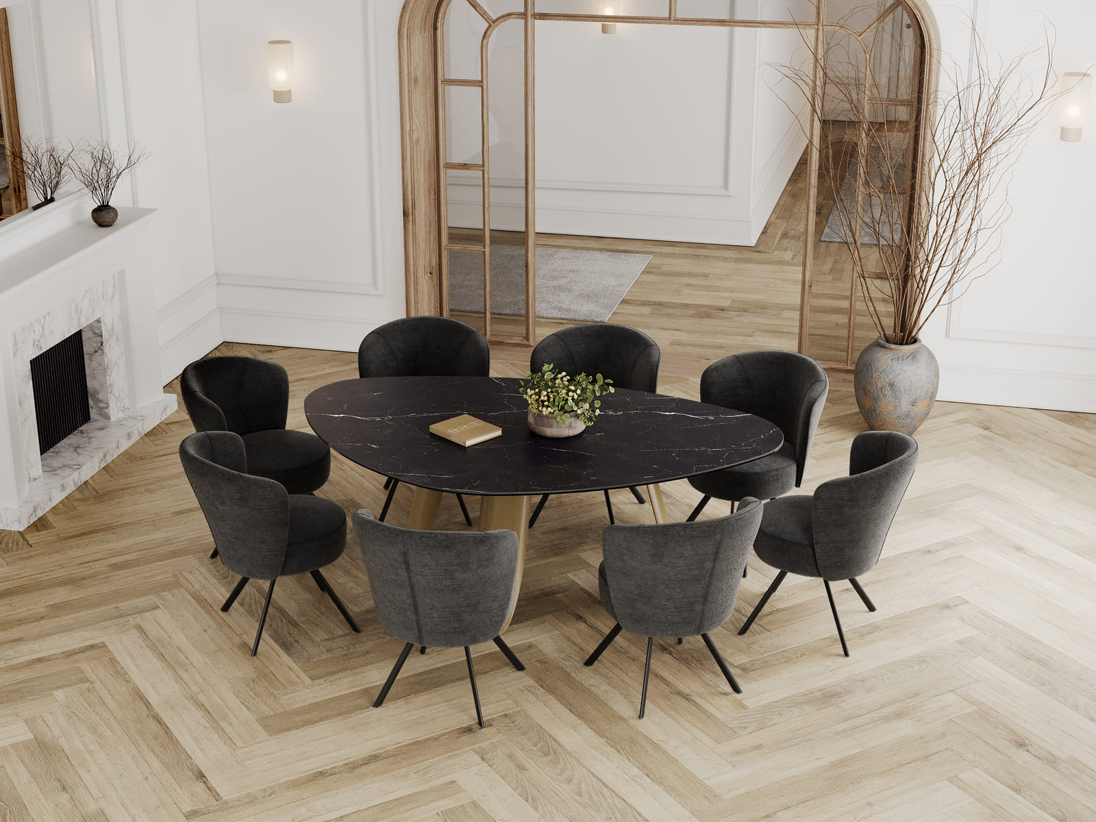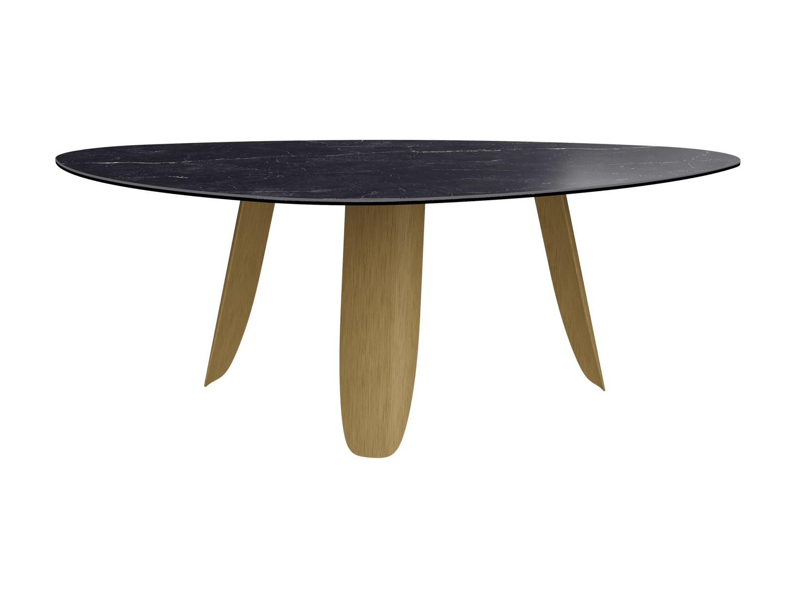 Quand l’élégance s’invite chez vous, découvrez la nouvelle collection de tables de repas : Bonifacio. Le modèle présenté ici, séduit par son plateau à la forme organique. Il est réalisé en céramique Marbre Marquina de 6 mm d’épaisseur, collée sur un verre de 8 mm. Cette table mesure 2,10 m de longueur sur 1,30 m de largeur. Idéale pour accueillir entre 6 et 8 personnes. Son originalité réside dans son piétement en forme de pétale, conçu en acier laqué effet bronze.