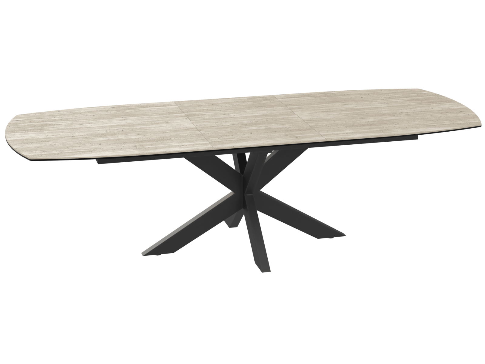 Nouveauté chez Akante : la table de repas Phoenix. Ce modèle emblématique de la marque est équipé d'une rallonge centrale de 60 cm de large. Le plateau mesure 200 cm de long lorsqu'il est fermé, et atteint une longueur de 260 cm une fois la rallonge déployée. Il est conçu en céramique Travertin de 3 mm, collée sur un verre de 8 mm. Son piètement élégant en forme d'étoile est en acier laqué noir mat.