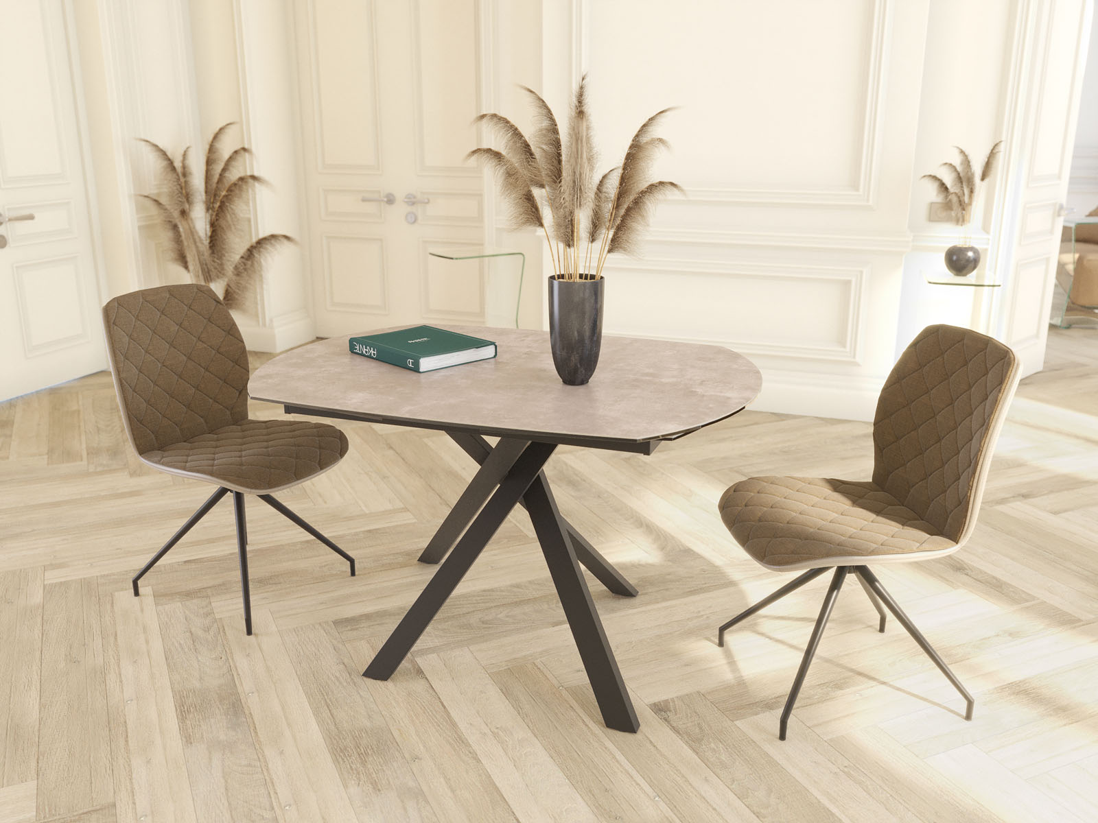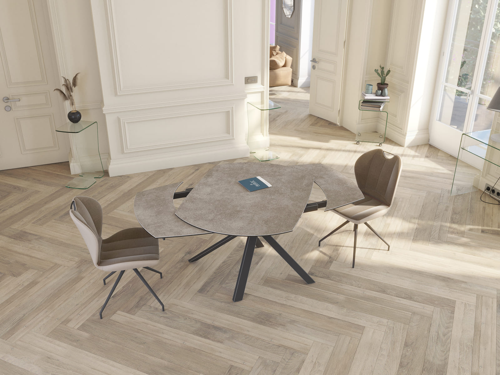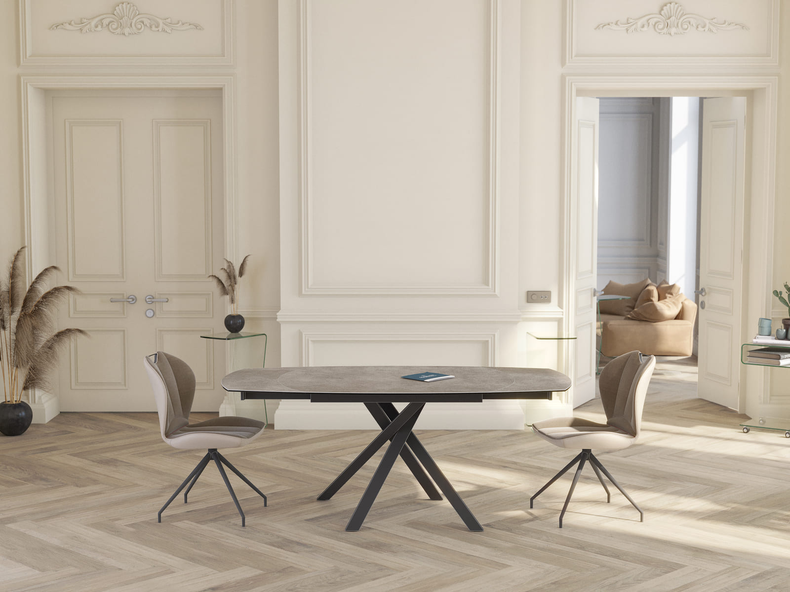 Une table de repas élégante : découvrez la célèbre table Kheops et son joli plateau en céramique argile de 120 cm de longueur. Elle est ingénieuse grâce à ses 2 rallonges dissimulées sous le plateau. Vous pouvez les faire apparaître simplement en pivotant son plateau central et donc obtenir une table de 180 cm de long. Sa céramique argile de 3 mm d’épaisseur est collée sur un verre de 8 mm, ce qui vous assure une réelle solidité mais également une touche naturelle au cœur de votre salle à manger. Son piétement en acier laqué noir mat est raffiné et lui offre une grande stabilité. La table de repas Kheops est facile d’entretien pour partager au mieux votre quotidien. Elle existe en différentes céramiques mais aussi en dimensions de 120/180 x 90 x 76 cm.