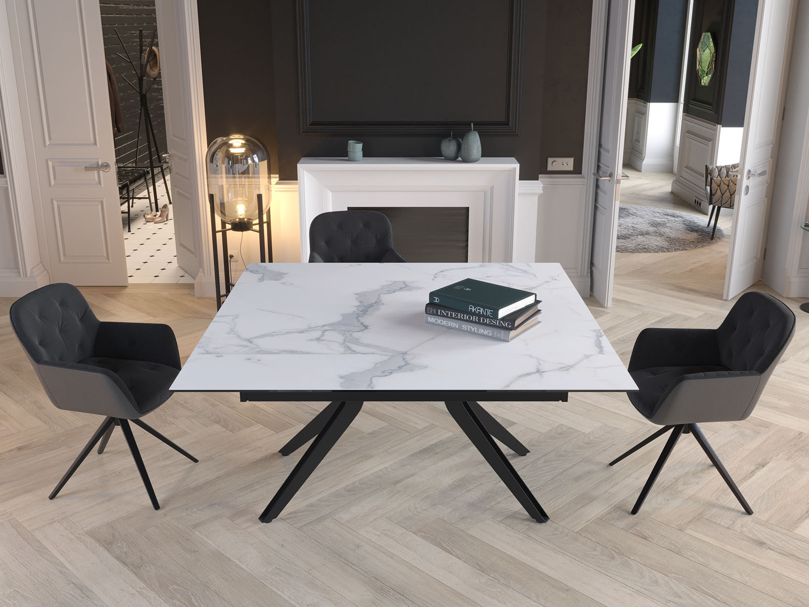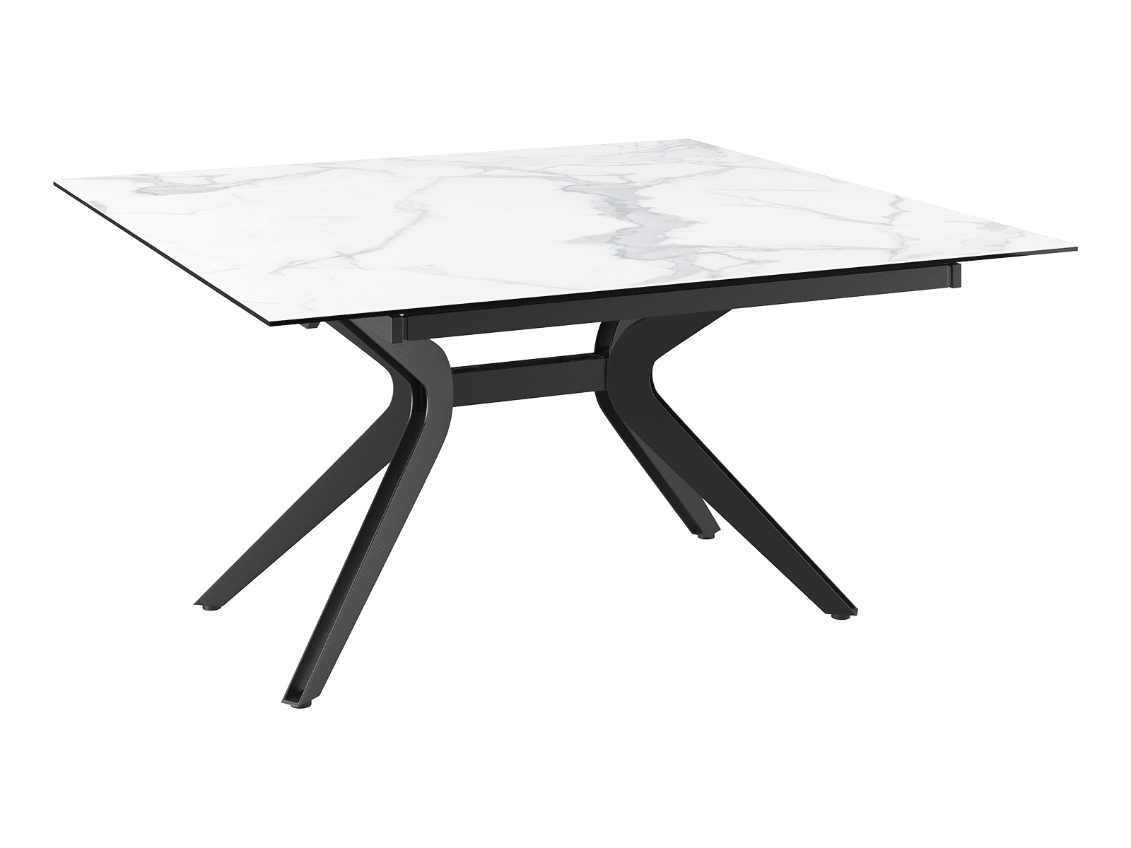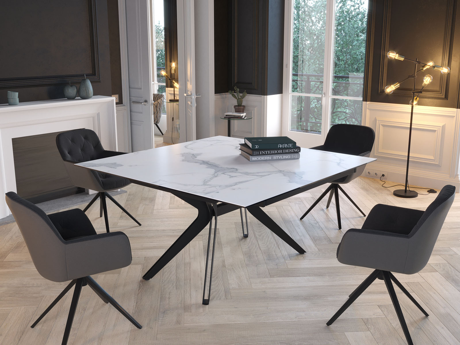 La table de repas Fascination est unique. Fermée, elle mesure 90 x 150. Elle loge sous son plateau, deux rallonges latérales. Déployée, la table mesure 150 x 150 et peut accueillir aisément jusqu'à 10 couverts. La table de repas Fascination est disponible en 5 couleurs de céramique. Son piétement en tôle découpée au laser est extrêmement travaillée. ll donne la fois une impression de légèreté et de solidité. Ici, elle est présentée en céramique marbre blanc mat.