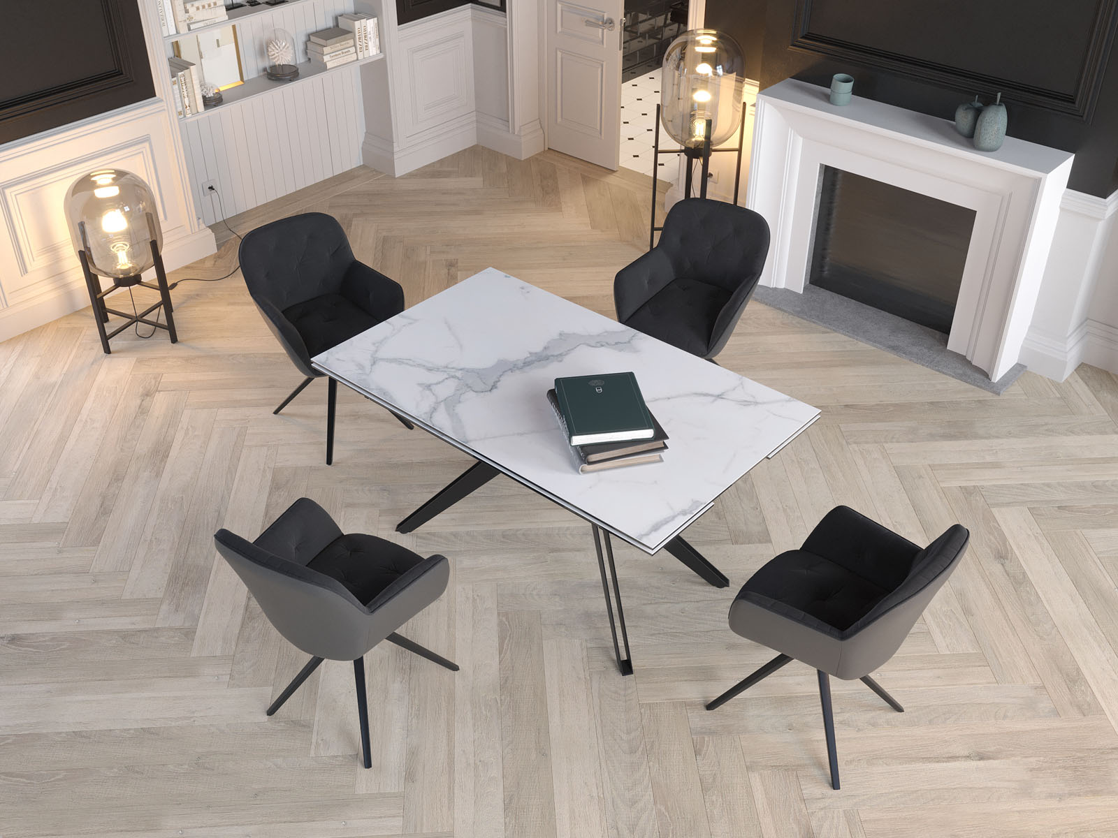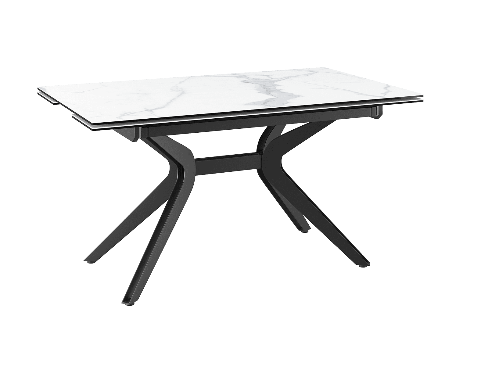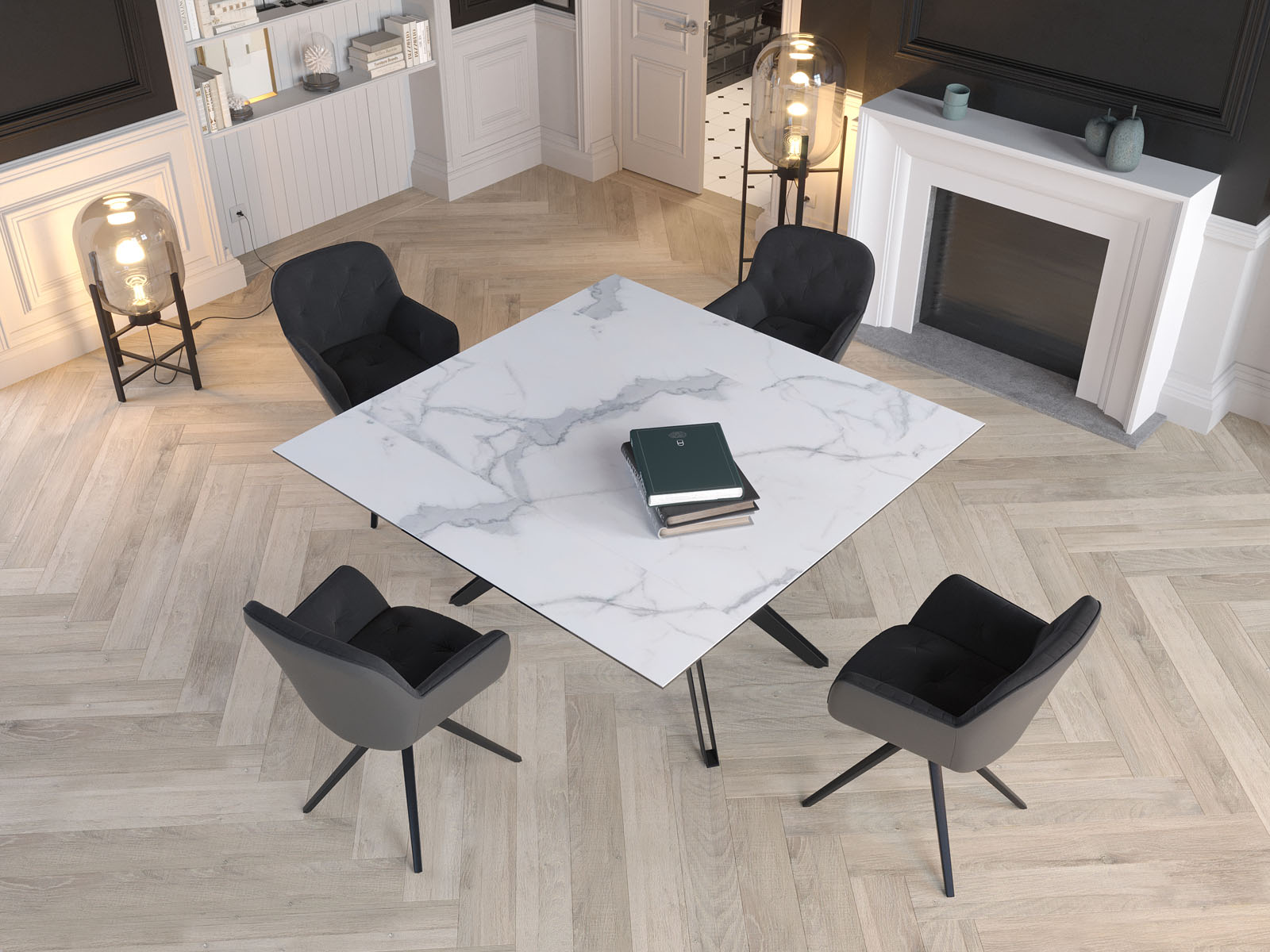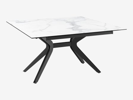 La table de repas Fascination est unique. Fermée, elle mesure 90 x 150. Elle loge sous son plateau, deux rallonges latérales. Déployée, la table mesure 150 x 150 et peut accueillir aisément jusqu'à 10 couverts. La table de repas Fascination est disponible en 5 couleurs de céramique. Son piétement en tôle découpée au laser est extrêmement travaillée. ll donne la fois une impression de légèreté et de solidité. Ici, elle est présentée en céramique marbre blanc mat.