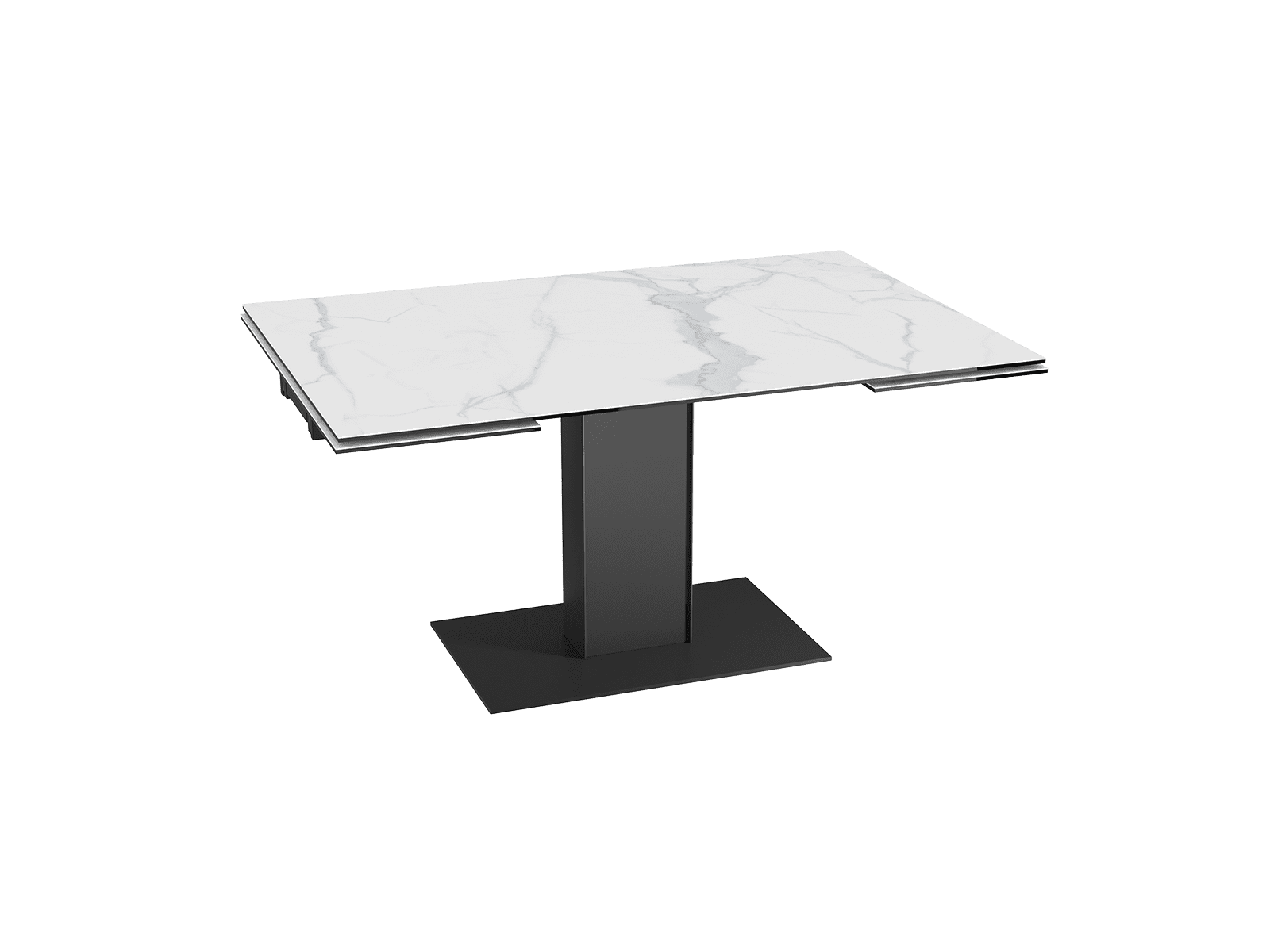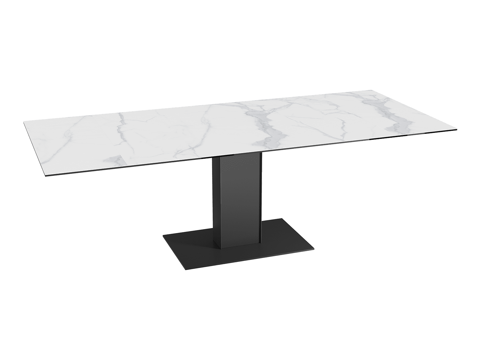 Belle table de repas composée d’un plateau en céramique marbre. La céramique fait 3 mm d’épaisseur et est collée sur un vitrage de 8 mm. La finition marbre est lumineuse et soignée grâce à ses nuances noires et blanches. Les dimensions généreuses de la table vous permettront de recevoir aisément vos amis et votre famille. Le plateau repose sur un piétement unique en acier laqué noir de 76 cm de hauteur.
