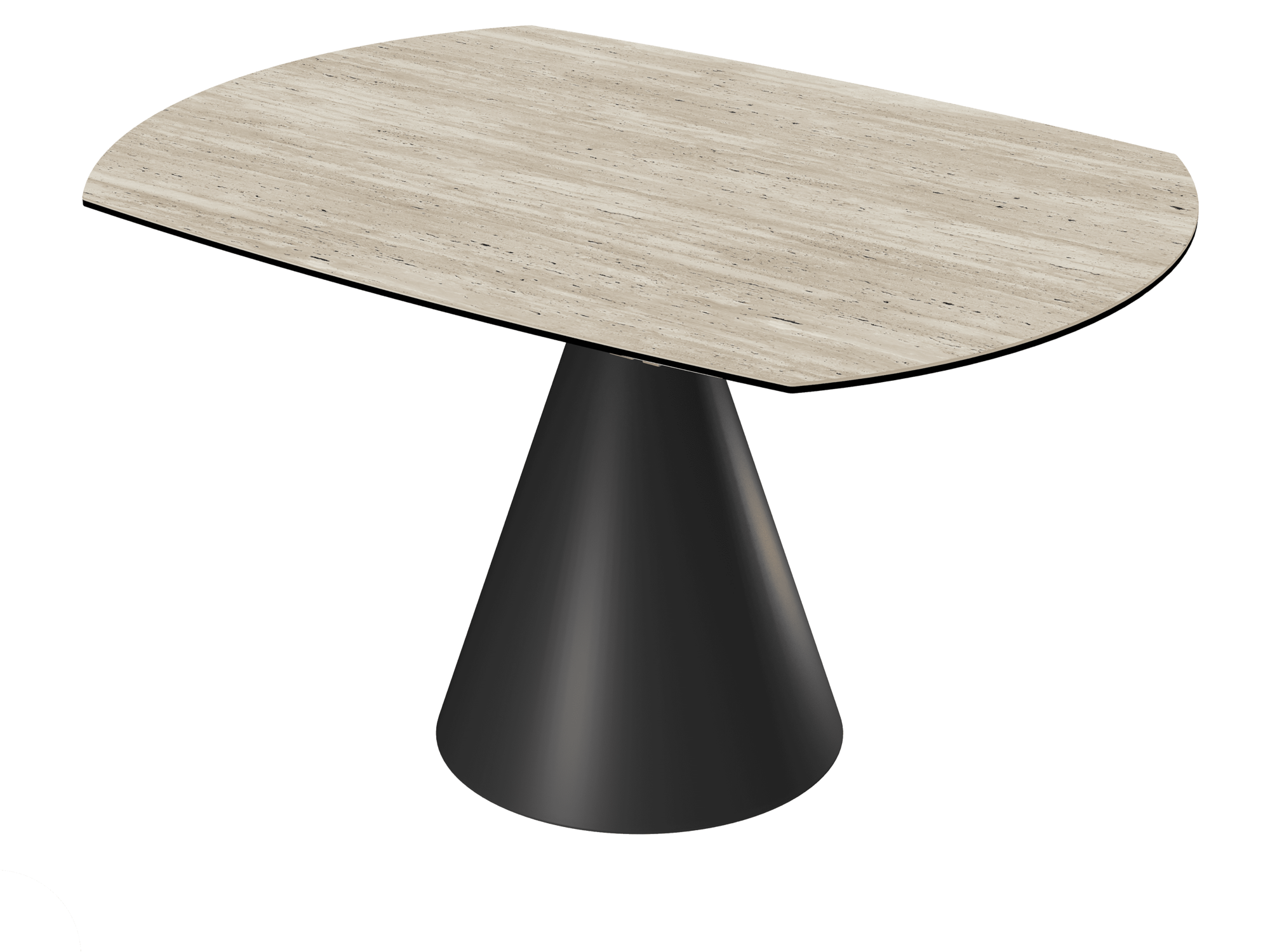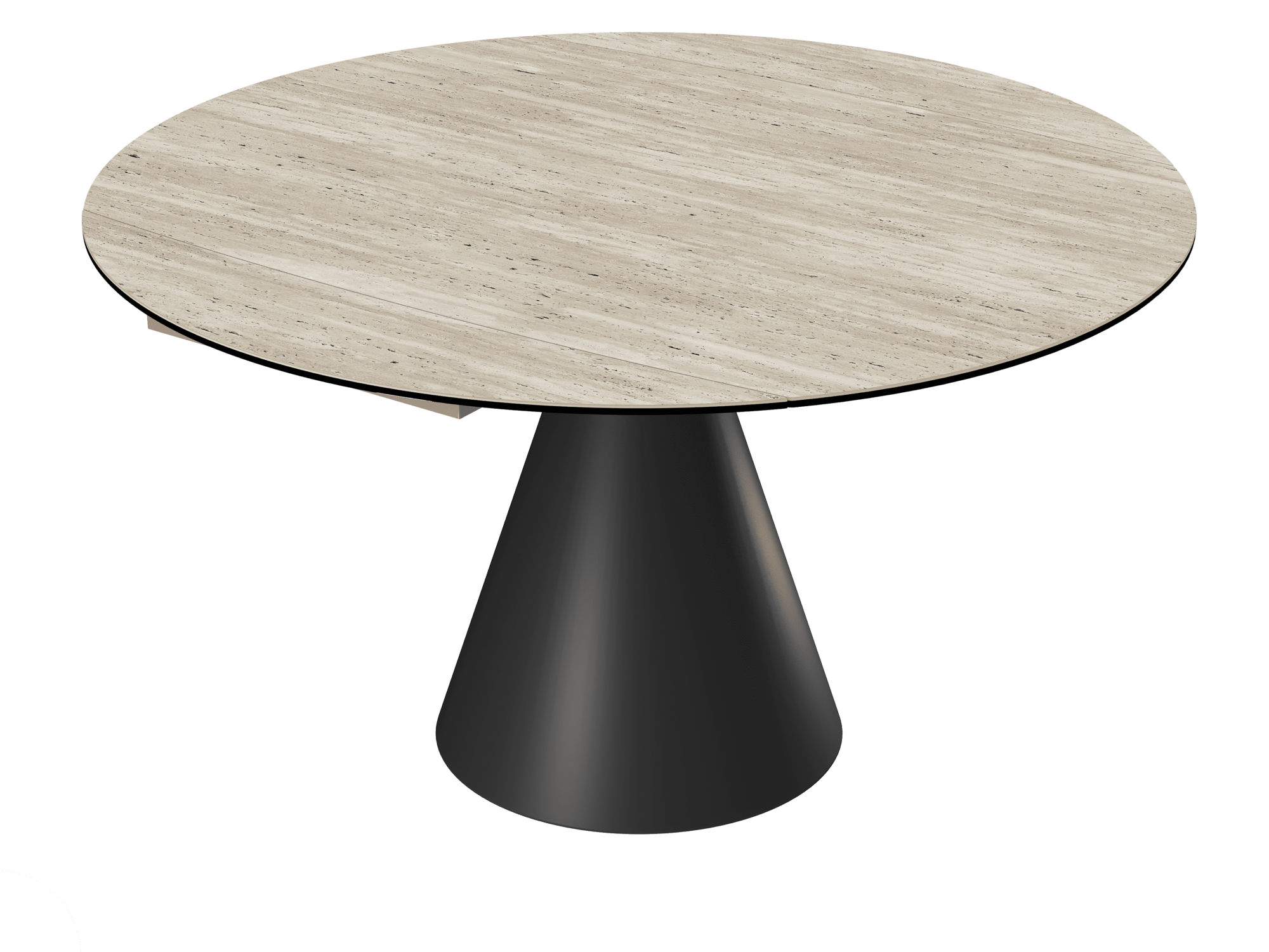 Avec son plateau en céramique finition Travertin, très en vogue actuellement, la table de repas New Icone s’intègre parfaitement dans un intérieur contemporain. Ce modèle est équipé d’un mécanisme synchronisé breveté Akante : un simple geste suffit pour faire apparaître deux rallonges de 20 cm chacune. Le plateau passe ainsi de 95 x 135 cm à un diamètre de 135 cm une fois déployé. Son piétement conique en acier laqué noir mat complète ce design élégant et moderne.