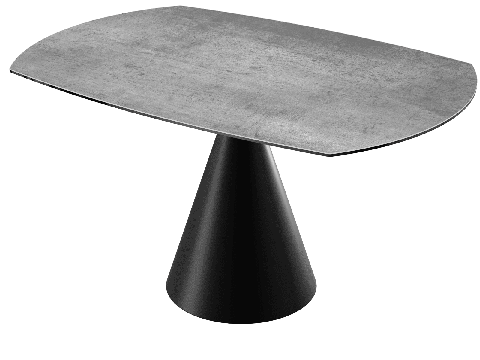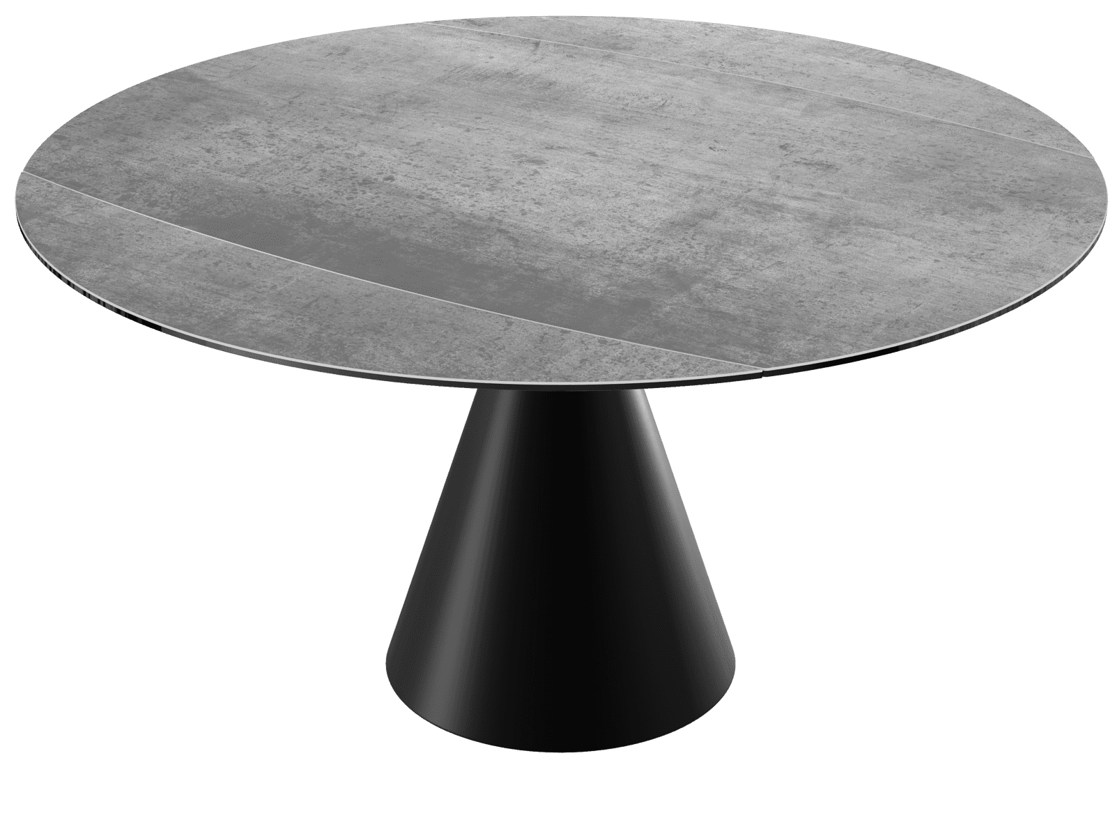 La table de repas New Icone est un incontournable chez Akante. Sa silhouette géométrique est résolument tendance actuellement. Cette collection de distingue par son plateau rond au mécanisme synchronisé breveté. En effet, un simple glissement suffit pour faire apparaitre deux rallonges latérales de 25 cm. Cette table est conçue en céramique Silver de 3 mm, collée sur un verre de 8 mm. Son plateau mesure 150 x 100 x 76 cm rallonges fermées et mesure Ø150 x 76 cm rallonges ouvertes. Son piétement conique est conçu en acier laqué noir mat.