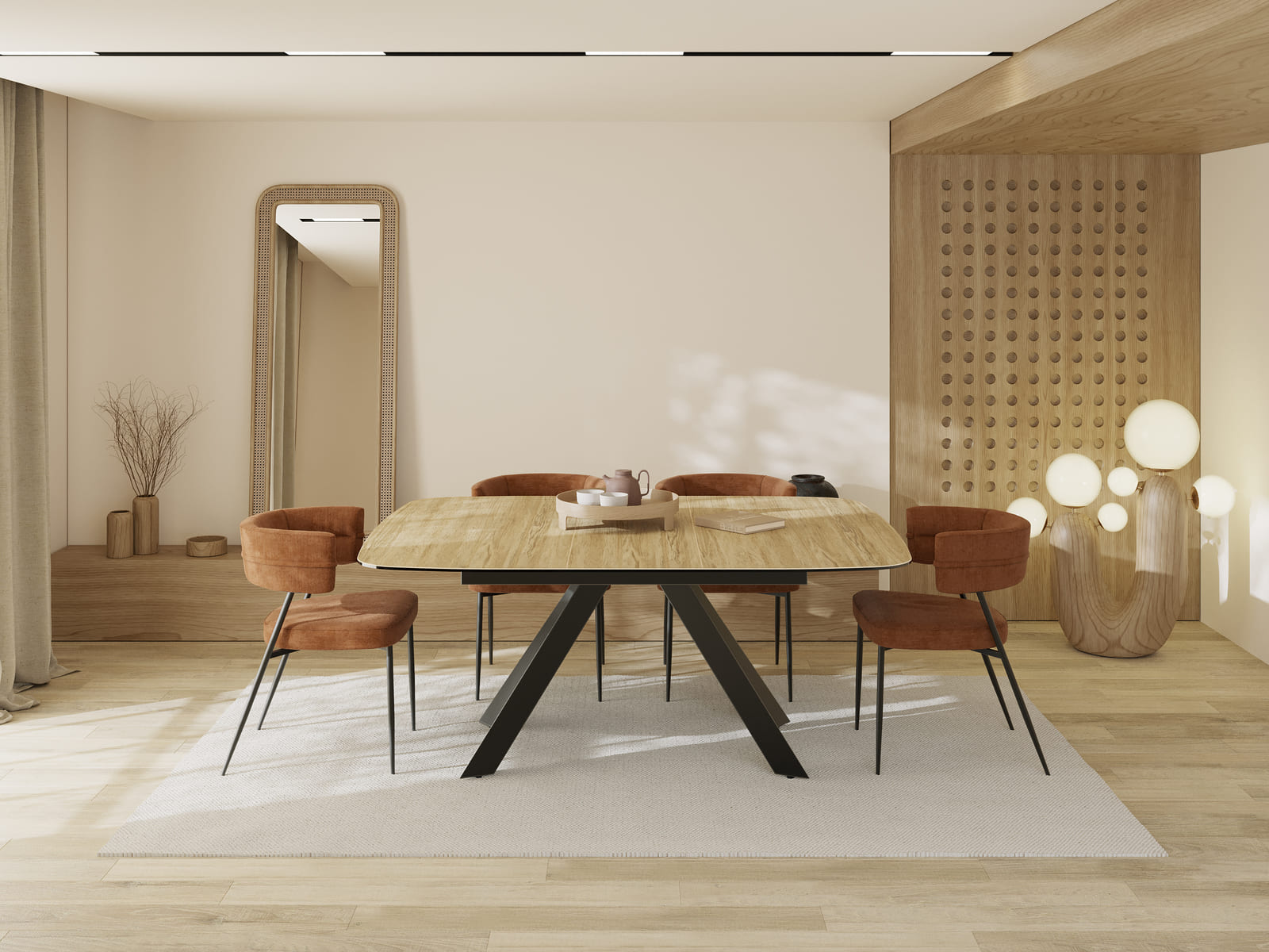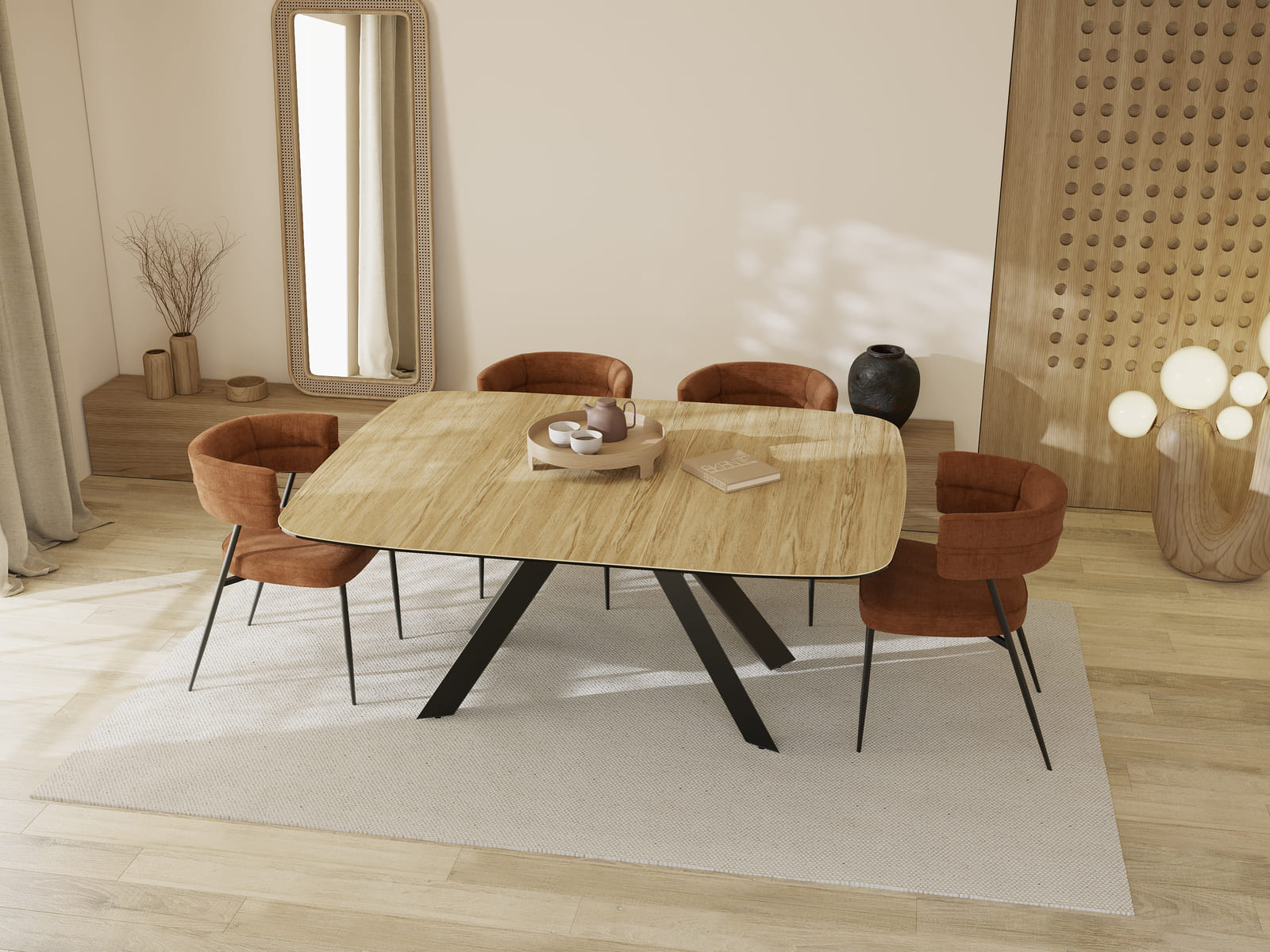 Craquez pour la nouvelle collection de tables de repas d’Akante : la table Mexico. Ce modèle se distingue par son ingénieuse rallonge centrale de 40 cm. En un geste simple, transformez son plateau carré de 135 cm en un plateau rectangulaire de 175 cm, idéal pour accueillir jusqu’à 8 convives. Cette collection offre 7 finitions de céramique, dont l’effet chêne clair sur le modèle qui vous est présenté. Sa composition est de 3 mm de céramique collée sur un verre de 8 mm. Admirez cet élégant piétement élancé, conçu en acier laqué noir mat. Mexico sera la table parfaite pour sublimer votre intérieur.