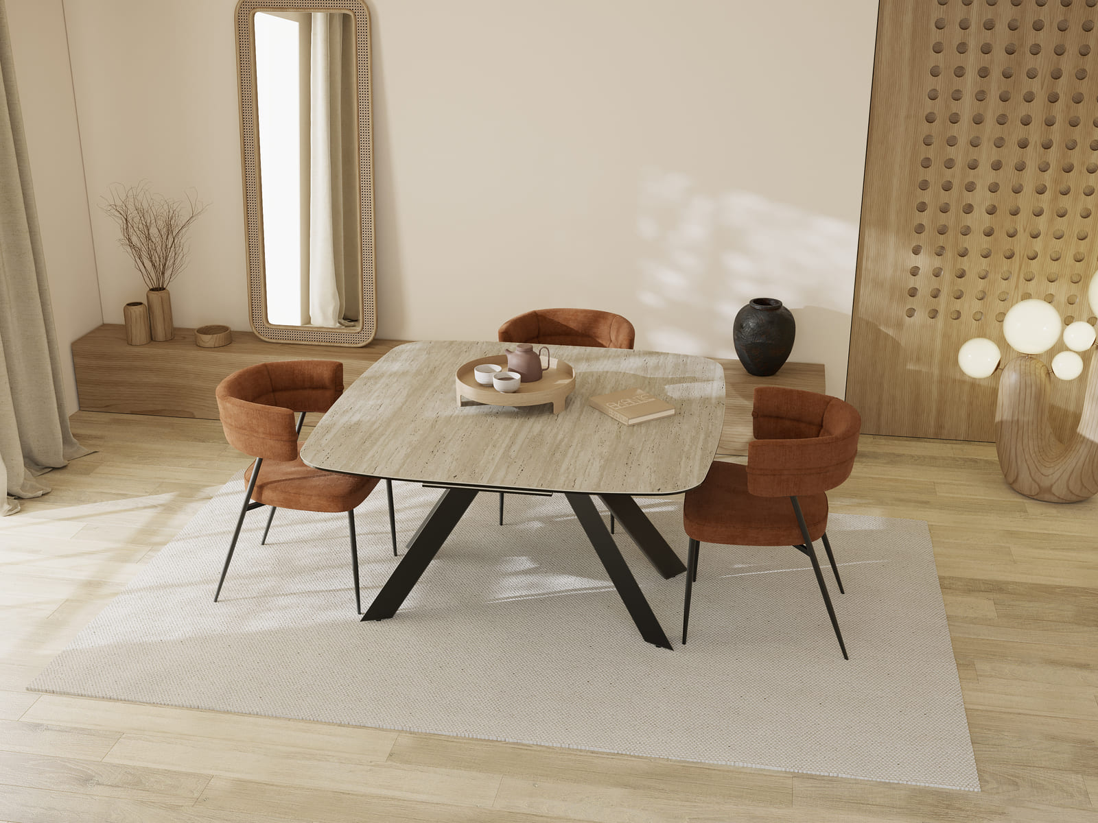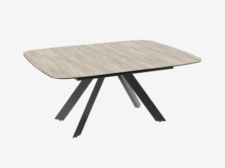 Découvrez Mexico, une table de repas contemporaine au format carré. Son plateau est doté d’une rallonge centrale qui se déploie facilement : il suffit de tirer le plateau sur le côté pour faire apparaitre l’extension de 40 cm. Passez d’un plateau carré à un plateau rectangulaire. Cette nouvelle collection est disponible en 7 finitions de céramique composé de 3 mm collée sur un verre de 8 mm. Le modèle présenté est en céramique Travertin. Son piétement est en acier laqué noir mat. Mexico mesure 175 cm de long sur 135 cm de large lorsque son extension est déployée.