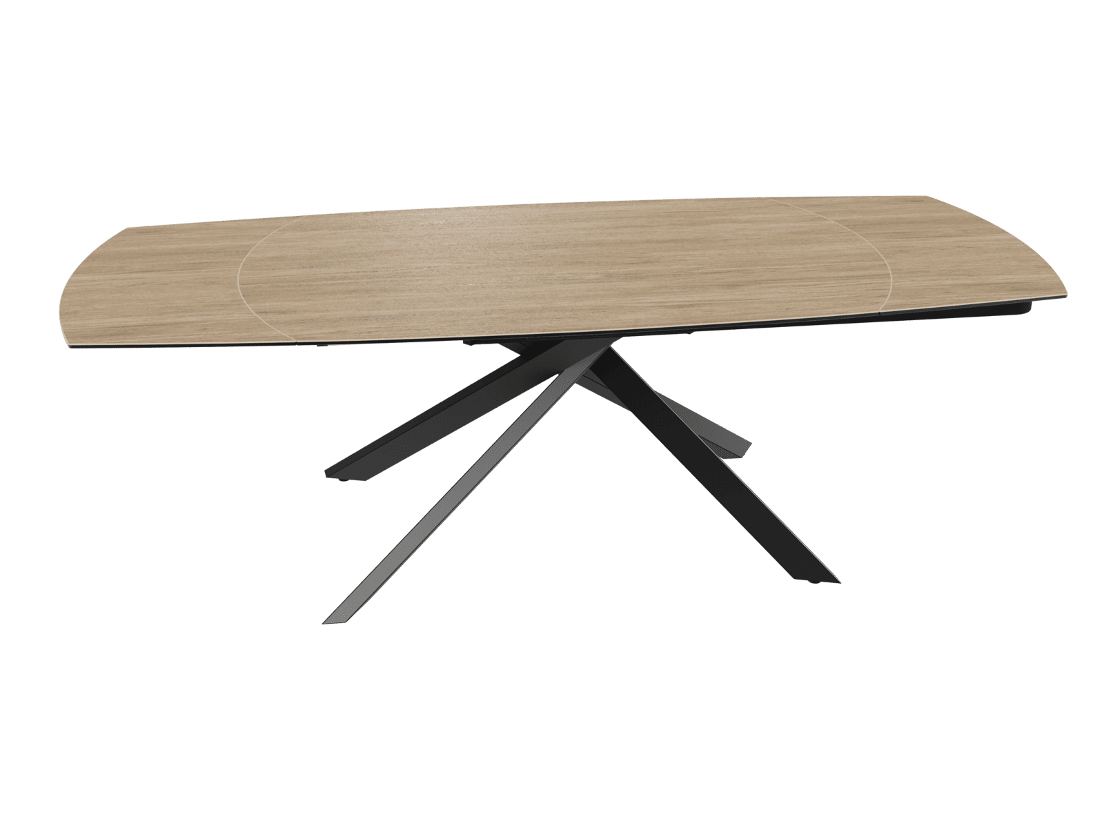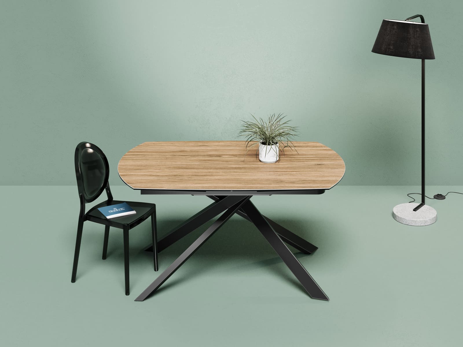 La table de repas Grande Kheops au design contemporain sera idéale pour vos prochains repas conviviaux. Ce modèle vous permet d’accueillir jusqu’à 10 convives. Son plateau est conçu en céramique Chêne Clair de 6 mm collée sur un verre de 8 mm. La table Grande Kheops mesure 1,60 m de long sur 1 m de large. Lorsque vous déployez ses deux rallonges de 40 cm, atteignez une longueur de 2,40 m. La particularité de la table Grande Kheops réside dans son mécanisme synchronisé, dans sa grande dimension de plateau et dans l’originalité de son piétement croisé conçu en acier laqué noir mat.