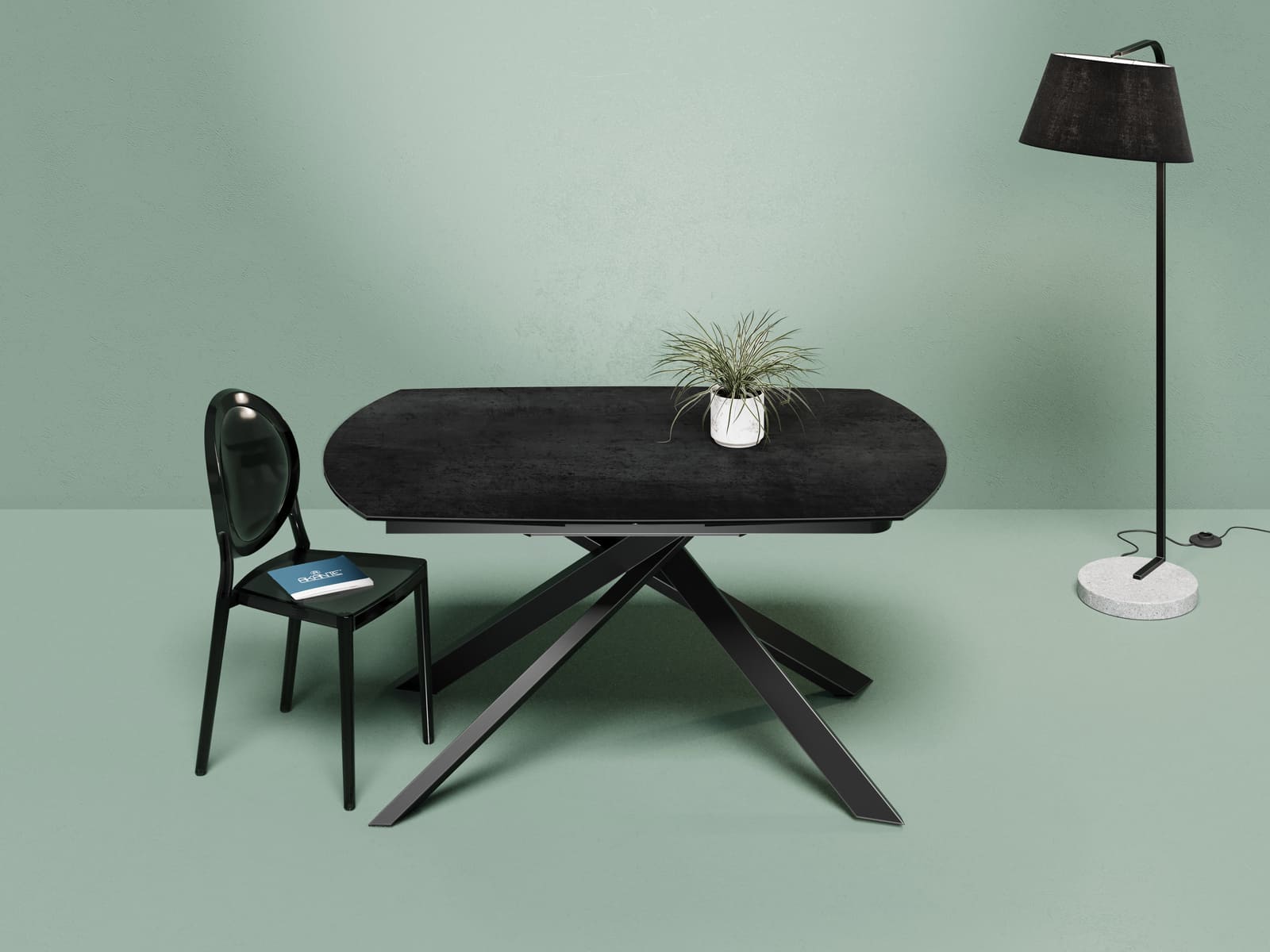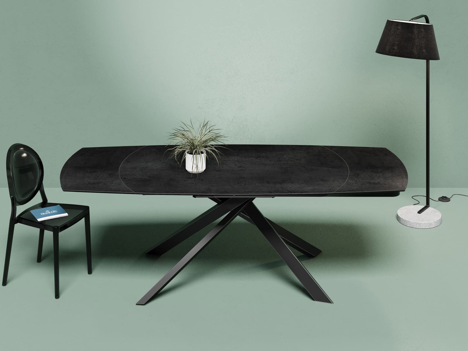 Découvrez la table de repas Grande Kheops, son ingéniosité réside dans son plateau doté d’un mécanisme synchronisé. Le principe est simple, il suffit de faire pivoter le plateau à une main pour faire apparaitre les deux rallonges latérales de 40 cm. Enfin, passez d’une surface de 1,60 x 1 mètre à une surface de 2,40 x 1 mètre. Ce modèle est conçu en céramique Titane de 3 mm collée sur un verre de 8 mm. Son piétement croisé est conçu en acier laqué noir mat, il assure la stabilité et la robustesse de l’ensemble de la structure.