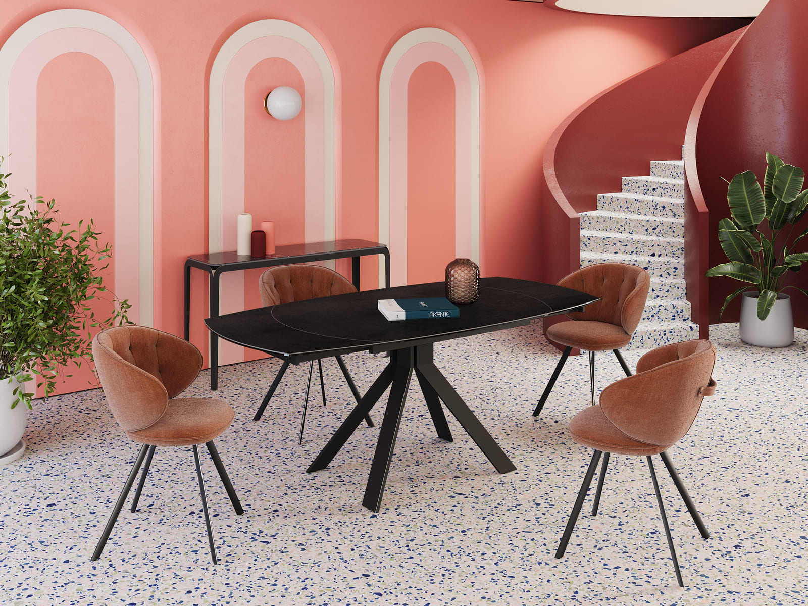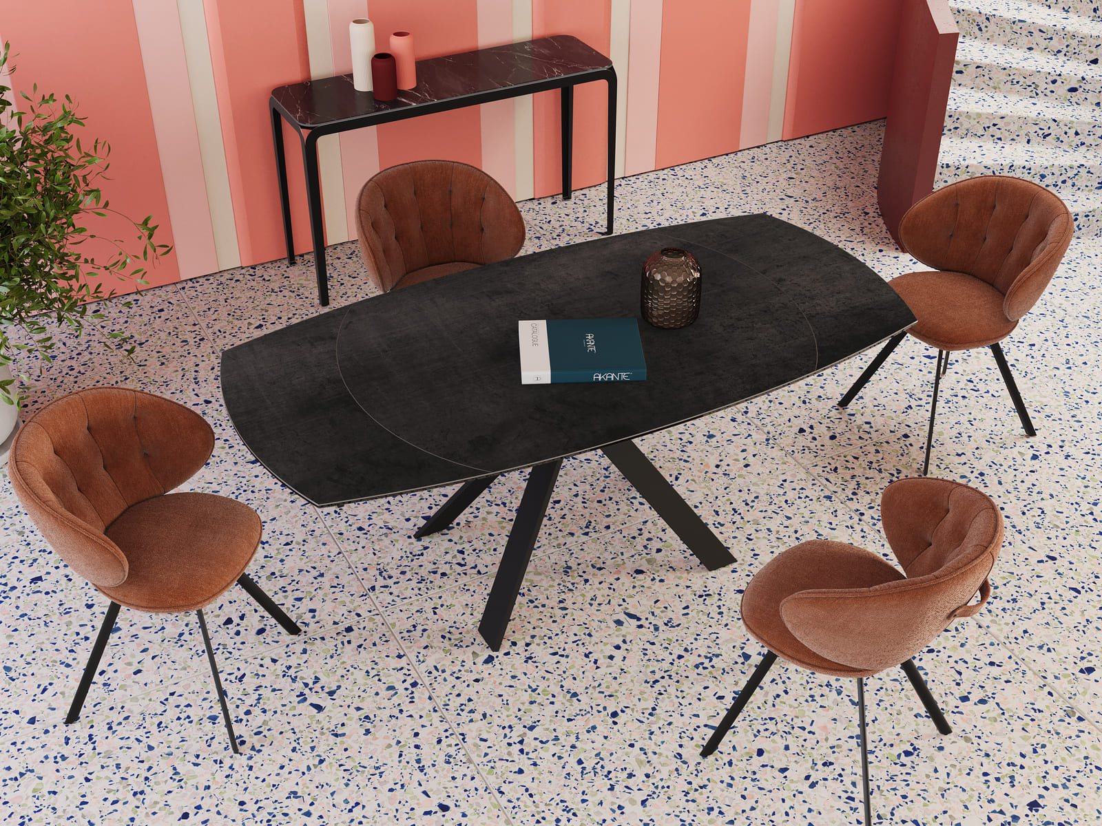 Les adeptes des coloris foncés ne vont pas résister à la table de repas Milazzo et son plateau en céramique Titane. Ses lignes métalliques et ses fonctionnalités astucieuses font de cette table une pièce unique et ergonomique. Elle se compose d’un plateau en céramique de 3 mm d’épaisseur collé sur verre de 8 mm. Ce même plateau dissimule deux rallonges latérales que vous pouvez déployer un en seul geste. Le piètement en acier laqué noir mat est moderne et raffiné. Il renforce l’esprit contemporain de cette table.