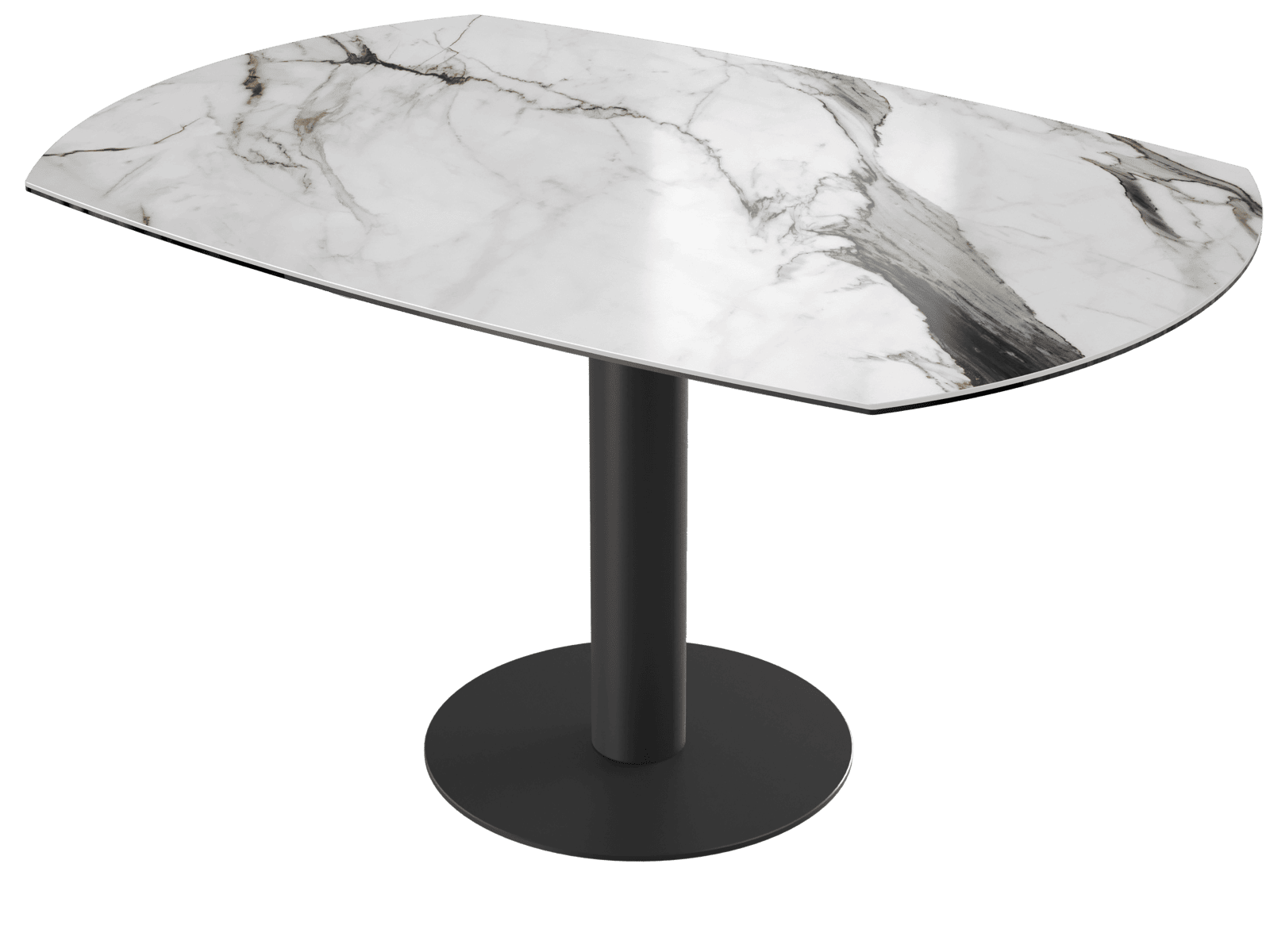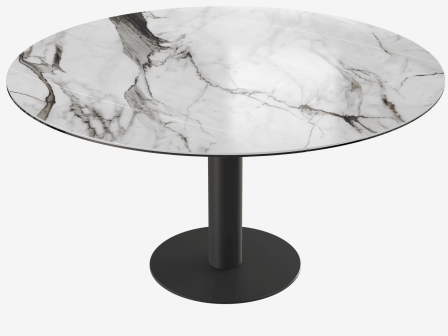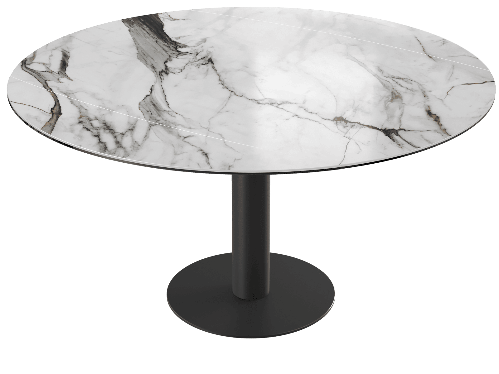 Recevez en toute élégance avec New Luna. Son plateau extensible est doté d’un mécanisme synchronisé breveté Akante. Il passe de 100 x 150 cm à 150 cm de diamètre en un simple geste. Le plateau est en céramique Marbre Fiorentino de 6 mm, collée sur un verre de 6 mm. Les veinures se prolongent parfaitement au niveau des rallonges. Son pied en acier laqué noir mat assure stabilité et modernité. Parfaite pour les repas du quotidien comme pour les grandes occasions, elle vous permet d’accueillir 6 à 8 convives. Son design est raffiné et son système d’extension est fluide, elle deviendra la pièce maîtresse de votre salle à manger.