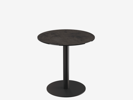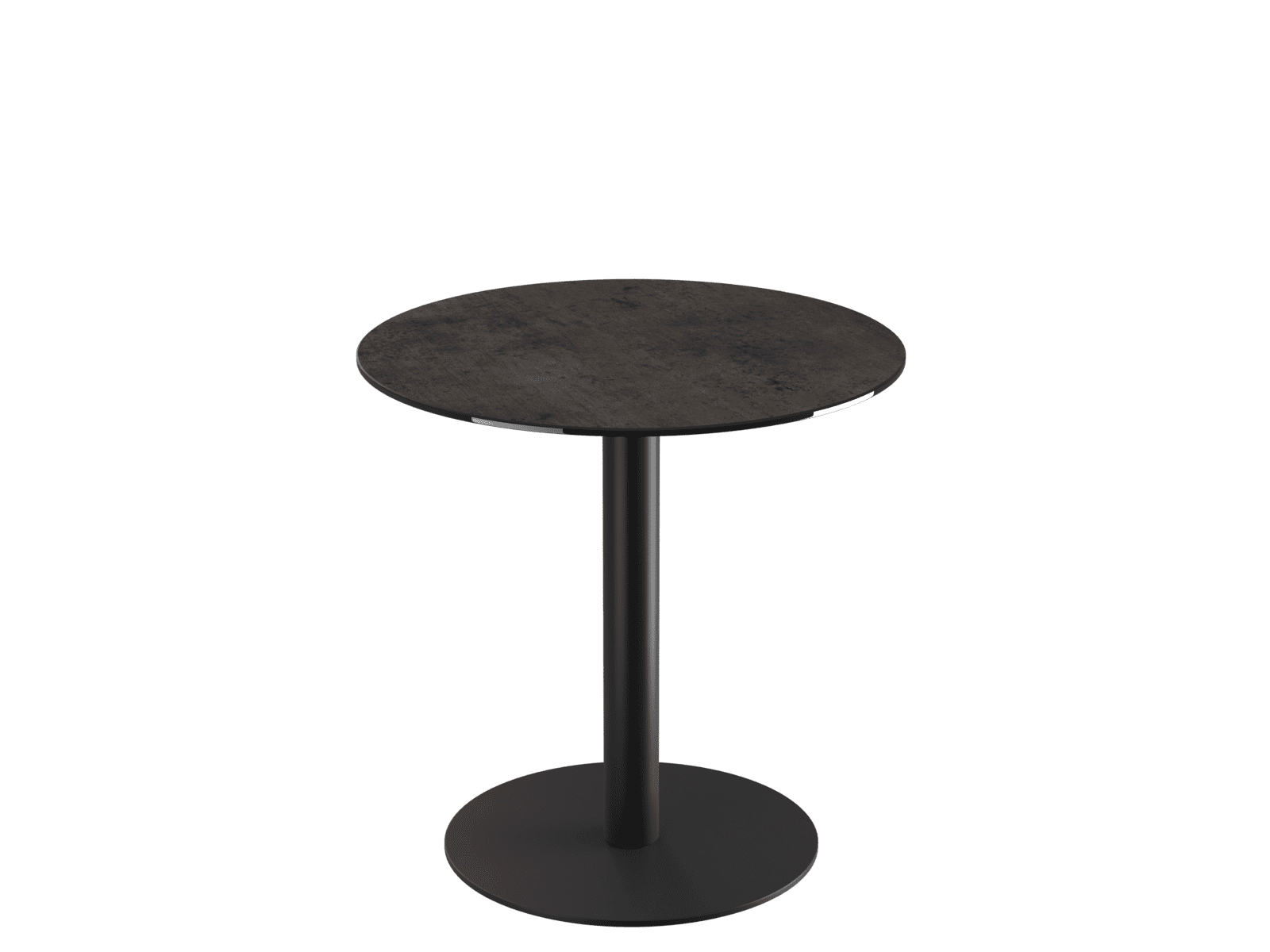 Orlando est une table de repas de 75 cm de hauteur avec un plateau en céramique acier de 3 mm collée sur un verre de 8 mm. Son diamètre est de 75 cm. Son piétement est en acier laqué noir mat.