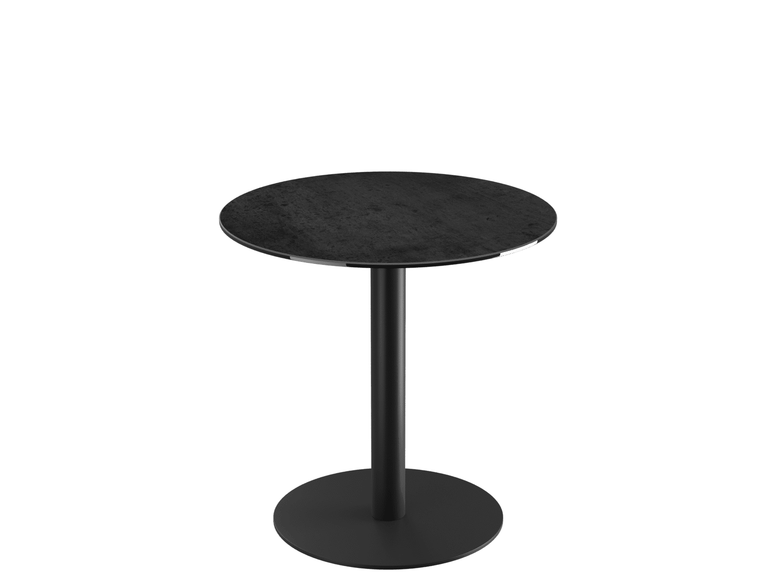 Orlando est une table de repas de 75 cm de hauteur avec un plateau en céramique titane de 3 mm collé sur un verre de 8 mm. Son diamètre est de 75 cm. Son piétement est en acier laqué noir mat.