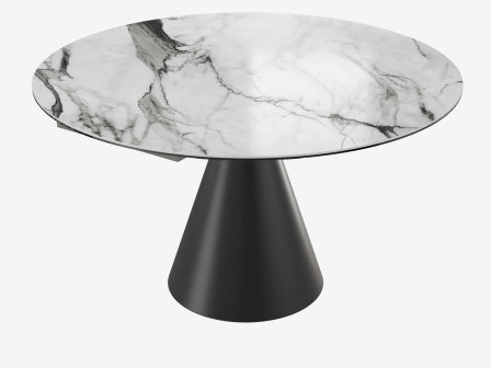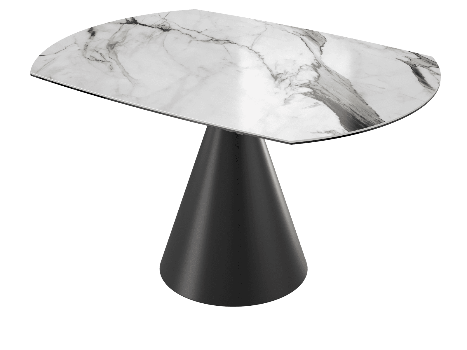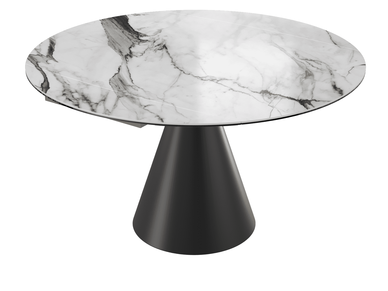 Pour vos dîners en famille ou entre amis, découvrez la table de repas New Icone. D’un design sobre et contemporain, cette table ronde apportera une touche de convivialité à votre intérieur. Son plateau est doté d’un mécanisme synchronisé breveté Akante. En un glissement sur la droite, deux rallonges latérales de 20 cm apparaissent. New Icone mesure 95 x 135 x H77 cm rallonges fermées et mesure Ø135 x H75 cm rallonges ouvertes. Ce modèle est conçu en céramique Marbre Fiorentino de 6 mm, collée sur un verre de 6 mm. Son piétement original est doté d’une forme conique, il est conçu en acier laqué noir mat.
