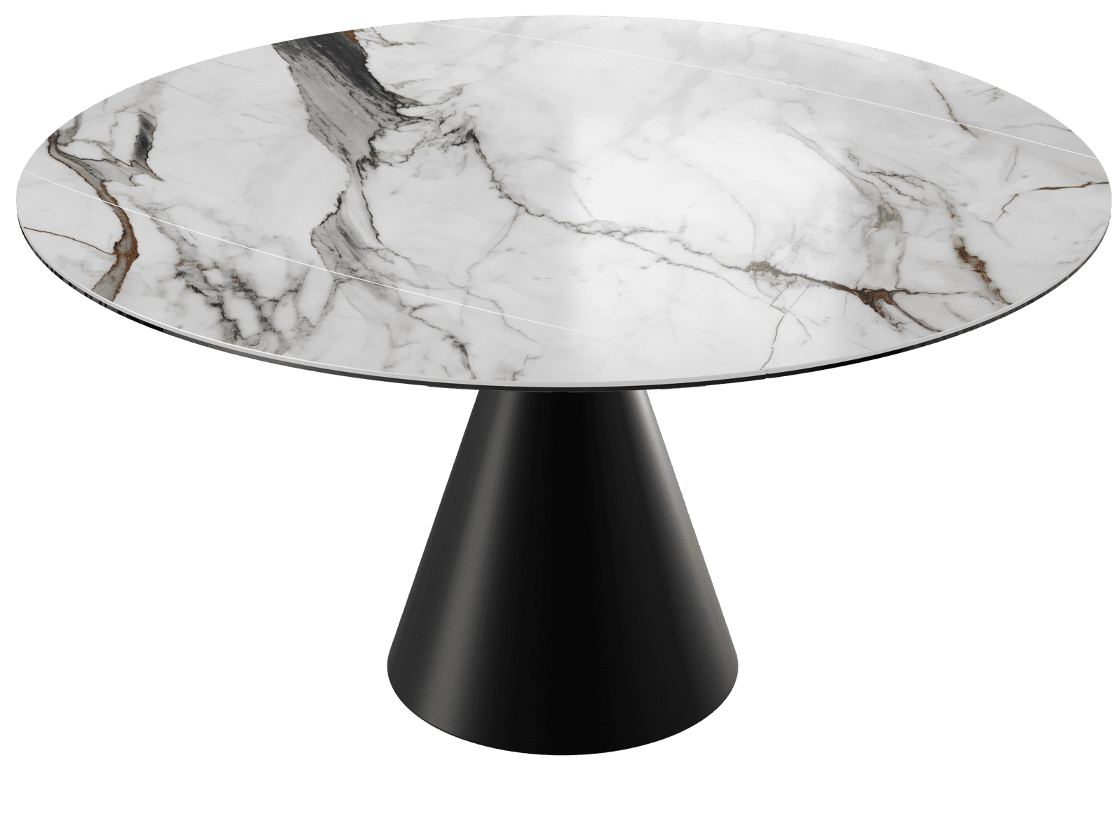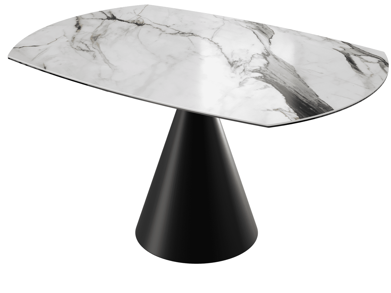 Des courbes harmonieuses pour un design contemporain, découvrez la table de repas New Icone. Ce modèle incontournable est doté d’un mécanisme synchronisé et breveté Akante. Son principe est simple, il vous suffit de glisser le plateau sur la droite pour révéler deux rallonges latérales de 25 cm. Enfin, passez d’une surface de 100 x 150 cm à une surface ronde de 150 cm de diamètre. Son plateau est conçu en céramique Marbre Fiorentino de 6 mm, collée sur un verre de 6 mm. Son piétement au style vintage affirmé est conçu en forme de cône, il est en acier laqué noir mat. Pour l’entretien de la table : nettoyer avec un chiffon humide la surface et bien sécher avec un chiffon sec.