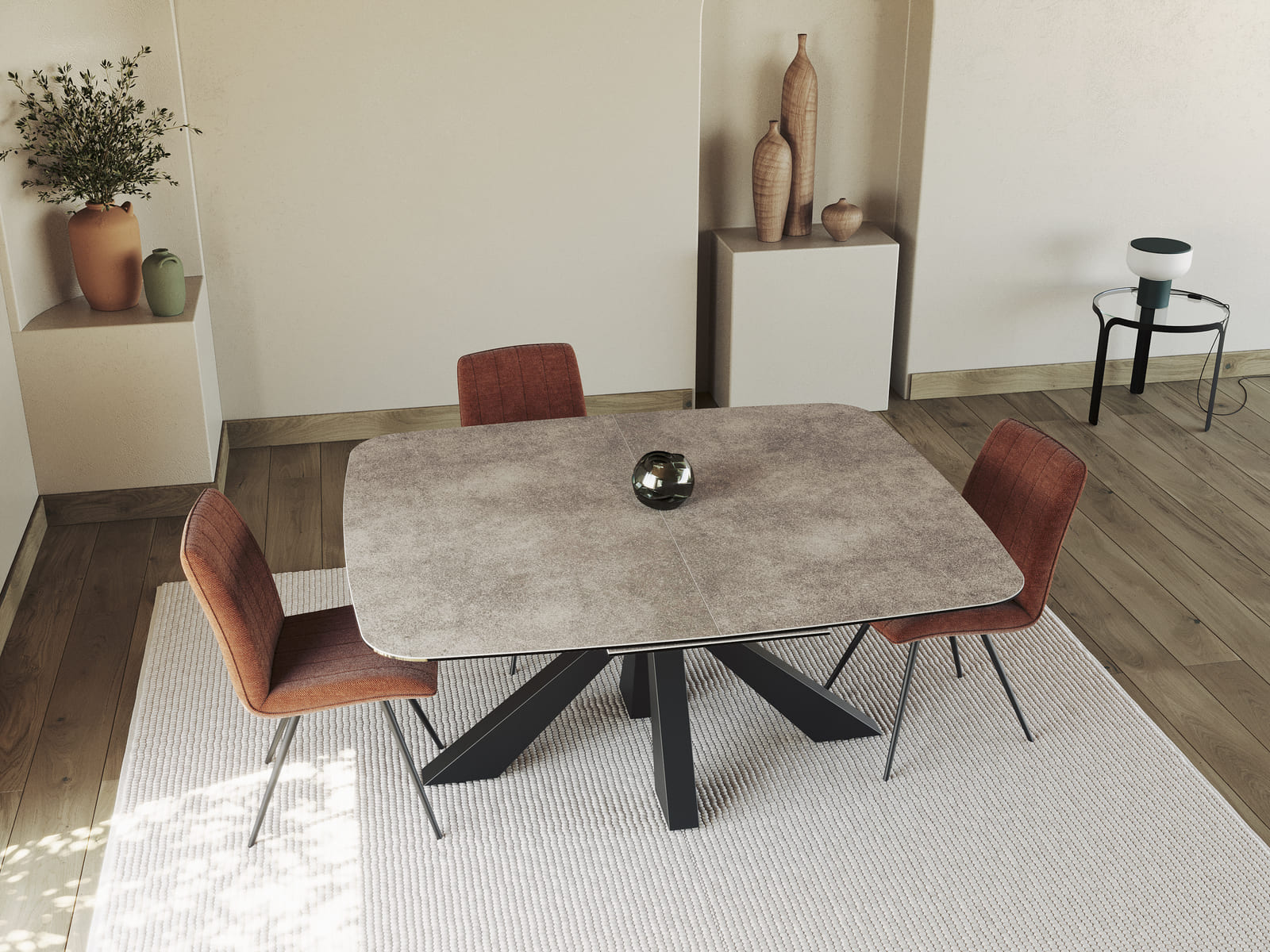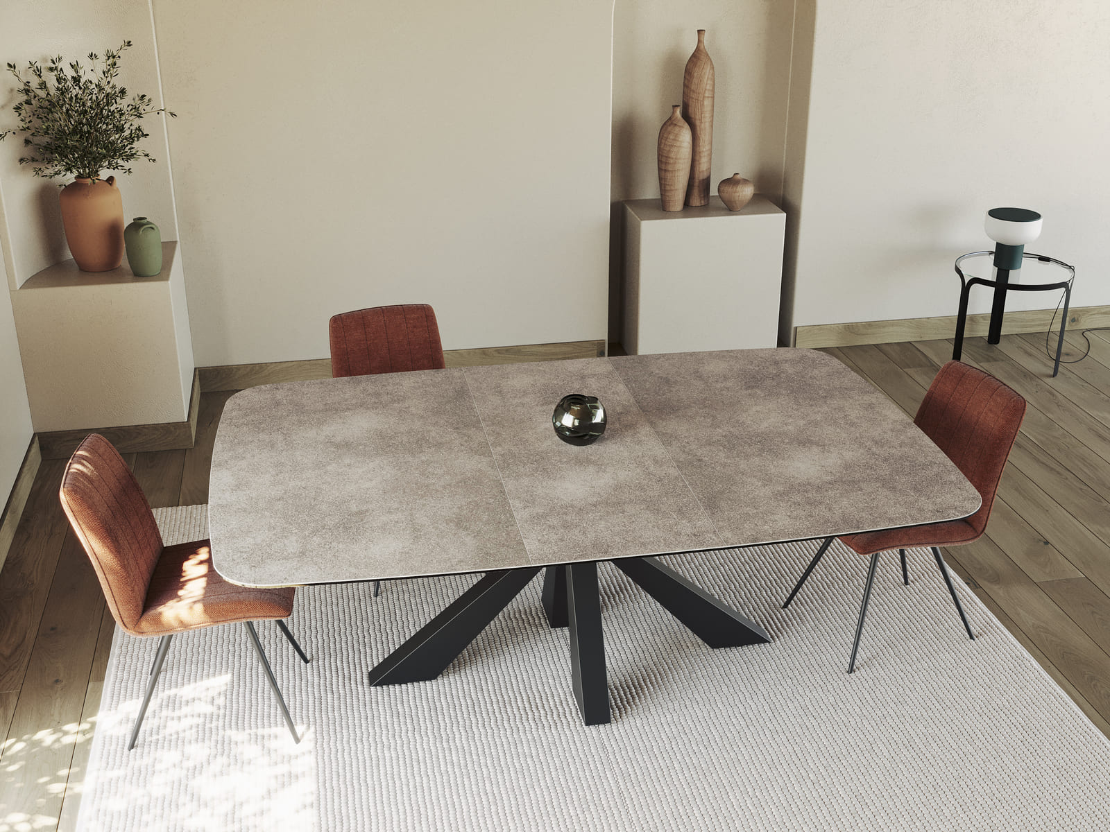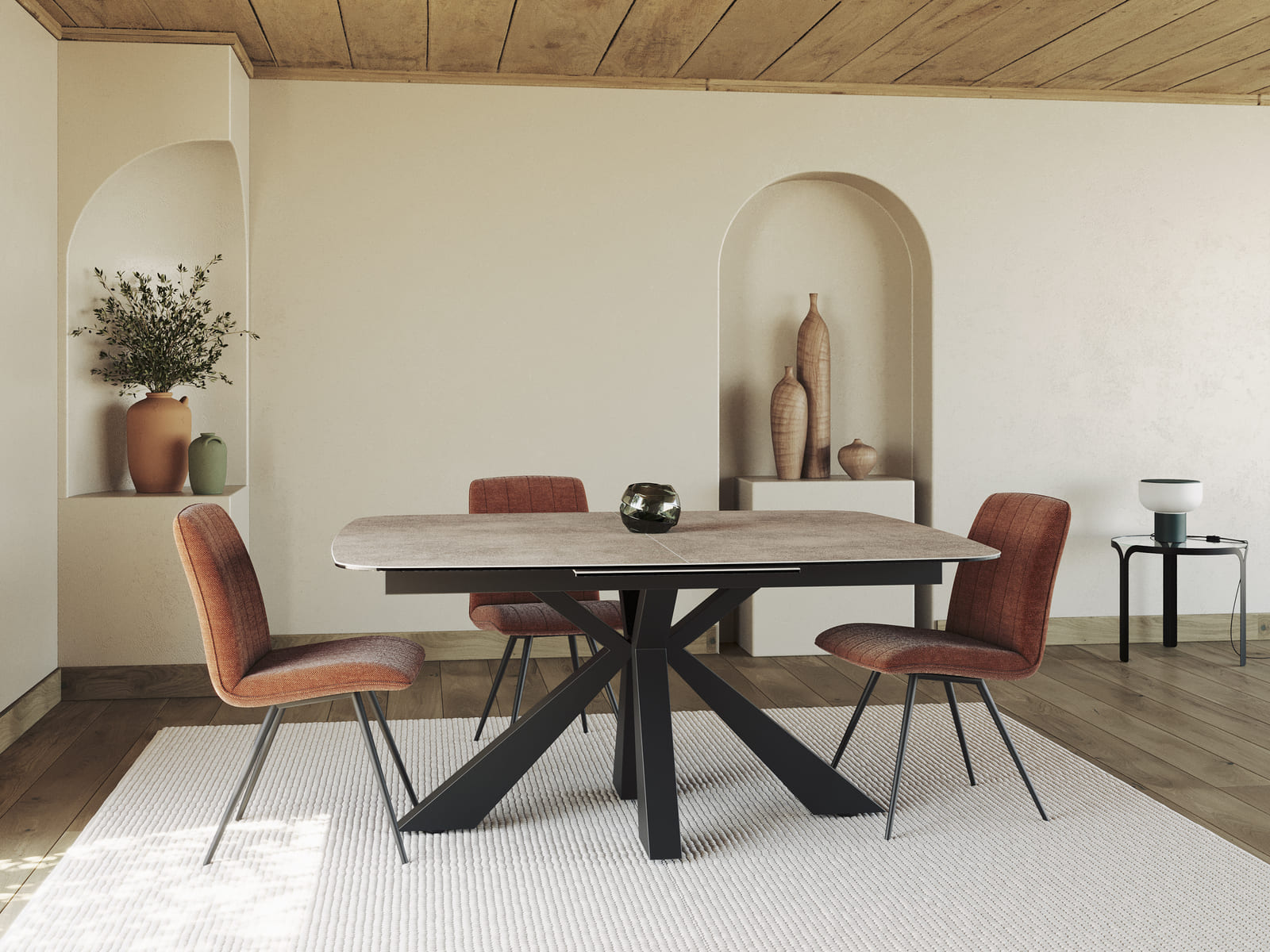 Akante vous présente sa dernière création, la table de repas Rio. Le déploiement de son plateau a été conçu pour simplifier chaque geste du quotidien. Il suffit de le tirer vers soi pour faire apparaître une rallonge centrale : passez d’une table qui mesure 1,60 m de longueur à une table de 2,10 m. Son plateau est conçu en céramique argile de 3 mm collée sur un verre de 8 mm. Rio possède un élégant piétement en forme d’étoile, il apporte du caractère à sa structure grâce à sa finition en acier laqué noir.