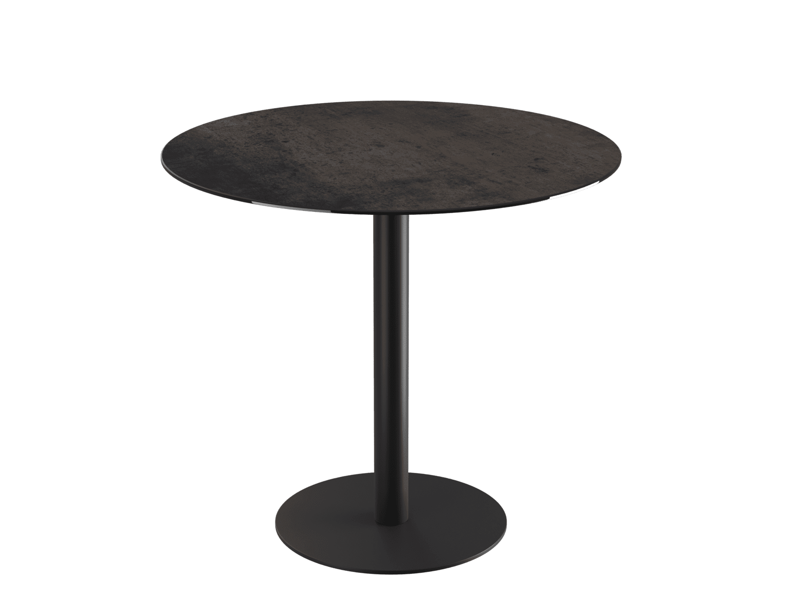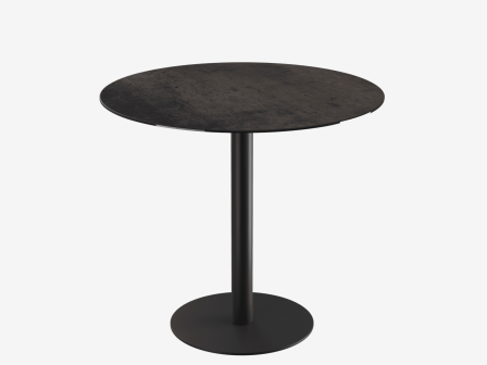 Orlando est une table snack d'un diamètre de 100cm. Sa hauteur est de 90cm. Son plateau est en céramique acier de 3mm fabriquée en Espagne et collée sur un vitrage de 8mm. Cela rend sa surface hyper résistante aux chocs et rayures.