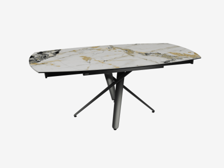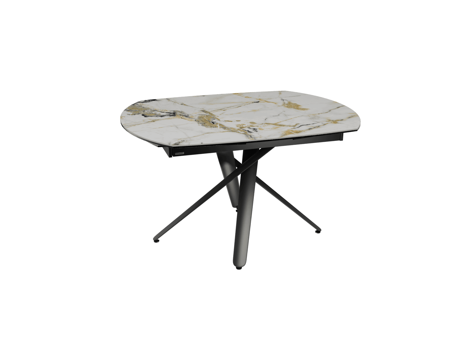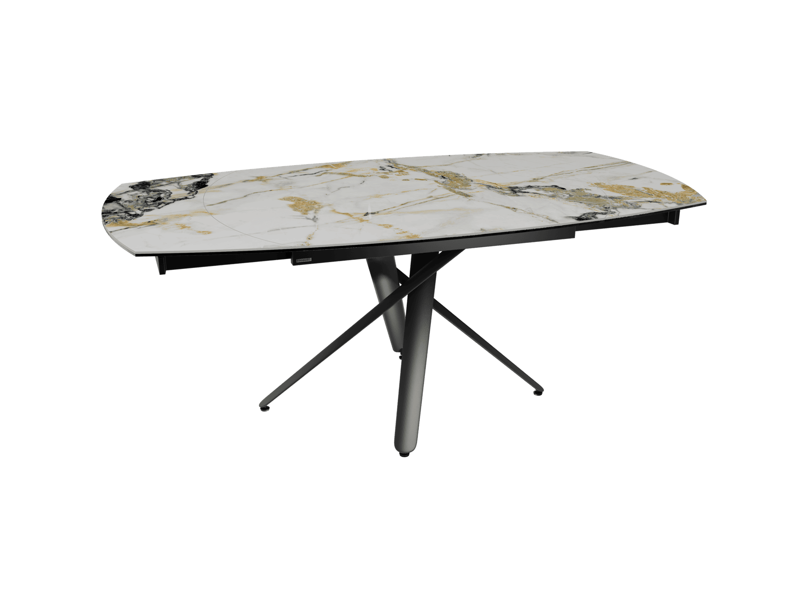 Astucieuse, la table de repas Rivoli conjugue raffinement et fonctionnalité. Dotée de deux rallonges latérales de 30 cm, une simple rotation du plateau suffit pour obtenir une surface de 190 x 100 cm. Pour les grandes occasions, elle vous permet de réunir jusqu’à 8 invités. Son design contemporain et ses lignes fines lui confèrent une allure élégante qui s’intègre parfaitement dans un intérieur moderne. Son plateau est en céramique Marbre Doro de 6 mm, collée sur un verre de 6 mm. Ses veines dorées s’accordent parfaitement au piétement entrecroisé conçu en acier laqué noir mat.
