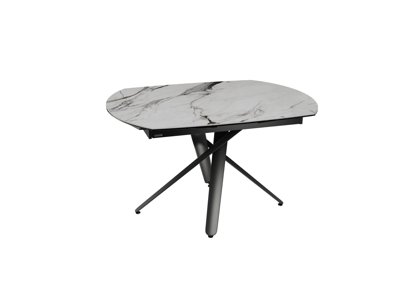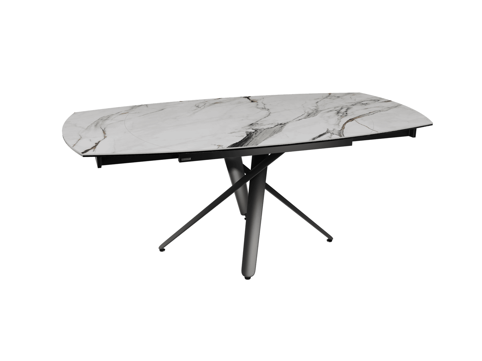 Optez pour la céramique Marbre Fiorentino et ses délicates veines aux tonalités terracotta avec la table de repas Rivoli. Ce modèle astucieux est équipé d’un mécanisme synchronisé : une simple rotation du plateau principal suffit pour déployer automatiquement deux rallonges latérales de 30 cm. Vous obtenez ainsi une surface généreuse de 190 x 100 cm, idéale pour accueillir jusqu’à 8 convives. Le plateau est réalisé en céramique Marbre Fiorentino de 6 mm, collée sur un verre de 6 mm. Les veinures se prolongent harmonieusement sur les rallonges. Son piétement entrecroisé en acier laqué noir mat allie raffinement et robustesse.