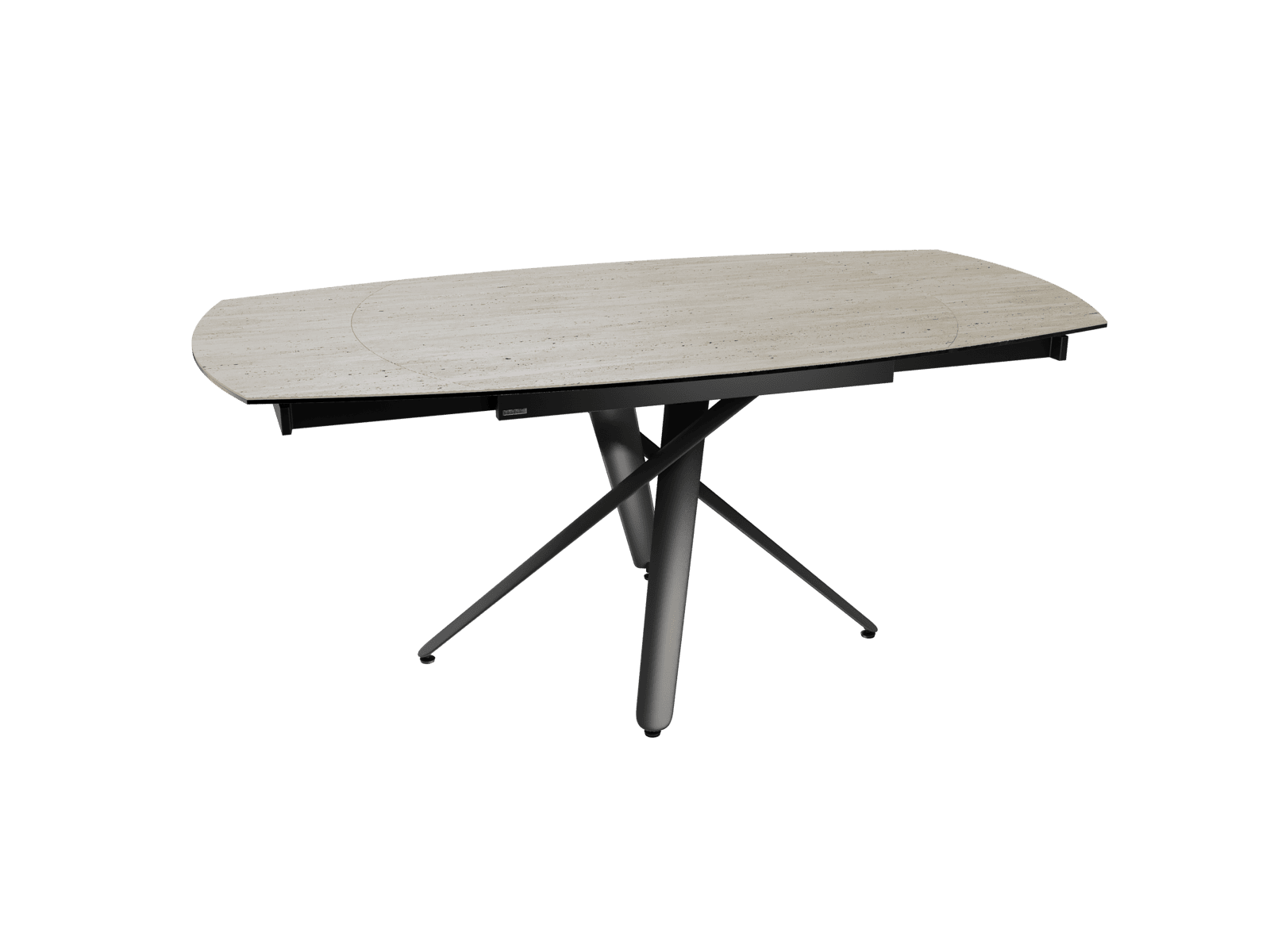 Dans une ambiance chaleureuse, la table de repas Rivoli sera idéale pour des moments authentiques et conviviaux. La céramique Travertin combinée à l’acier noir mat du piétement présente un look contemporain. Dotée d’un mécanisme synchronisé, la table Rivoli permet par une simple rotation du plateau principal, de révéler deux rallonges latérales de 30 cm dissimulées sous celui-ci. Obtenez une surface de plateau de 180 x 90 cm, idéal pour accueillir entre 6 et 8 convives. Son élégant piétement croisé ajoute du caractère et de la stabilité, il est en acier laqué noir mat.