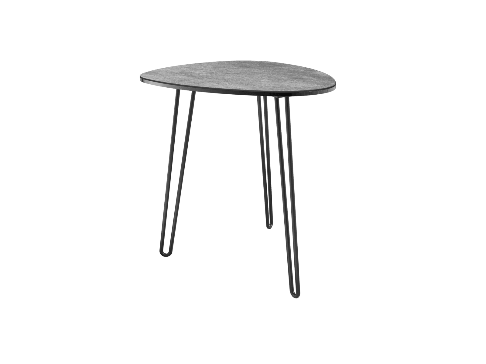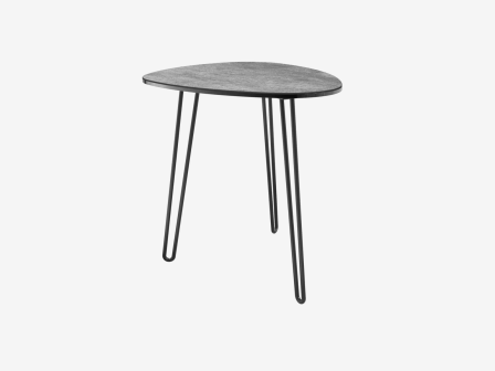 Baleares, le bout de canapé minimaliste aux douces courbes. Appréciez son plateau original à la forme organique de 55 cm de long sur 45 cm de large. Ce bout de canapé est conçu en céramique Silver de 3 mm collée sur un verre de 6 mm. Ses trois pieds épingle de 50 cm de haut sont en acier laqué noir mat.