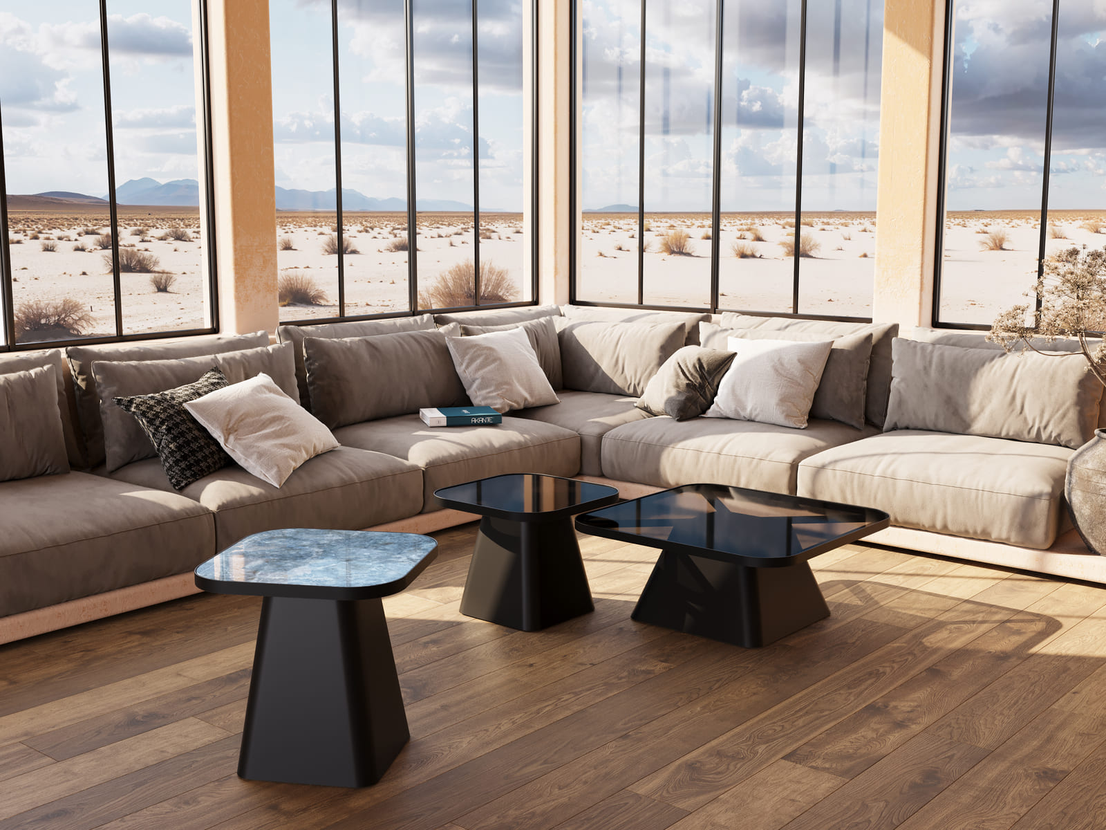 À tous les adeptes de design contemporain, laissez-vous subjuguer par le bout de canapé Petra. Son plateau carré mesure 50 cm de chaque côté, il est confectionné en verre trempé gris fumé d’une épaisseur de 10 mm. Ce matériau est 2 à 5 fois plus résistant qu’un verre ordinaire. Le piétement de Petra est en acier laqué noir mat, original et moderne, sa forme trapézoïdale assure un bon maintien de toute sa structure.
