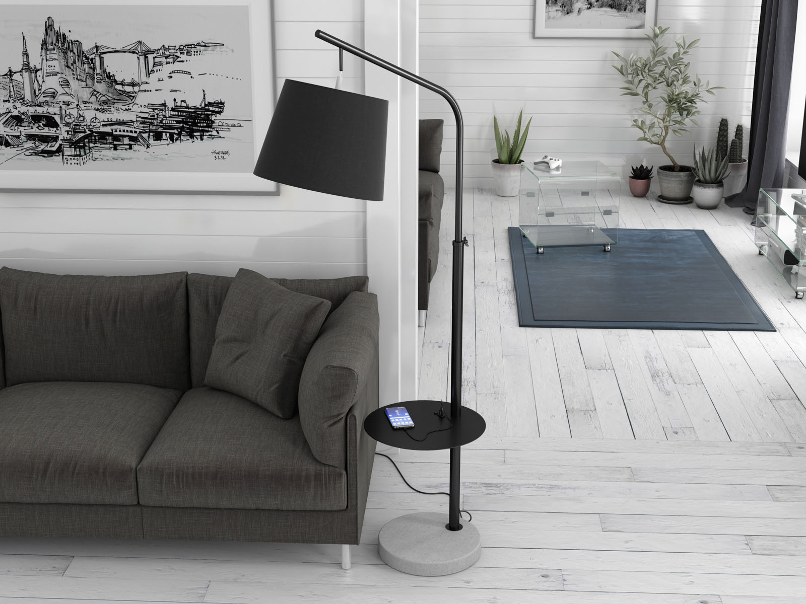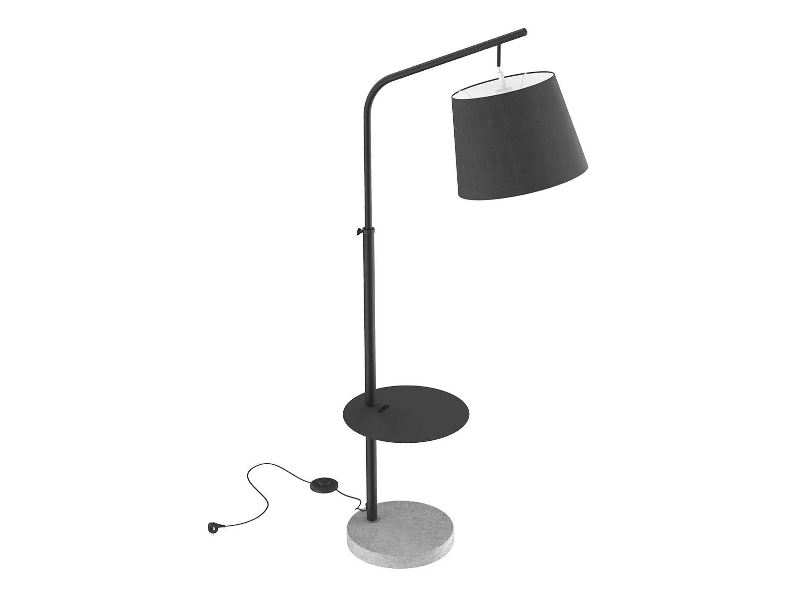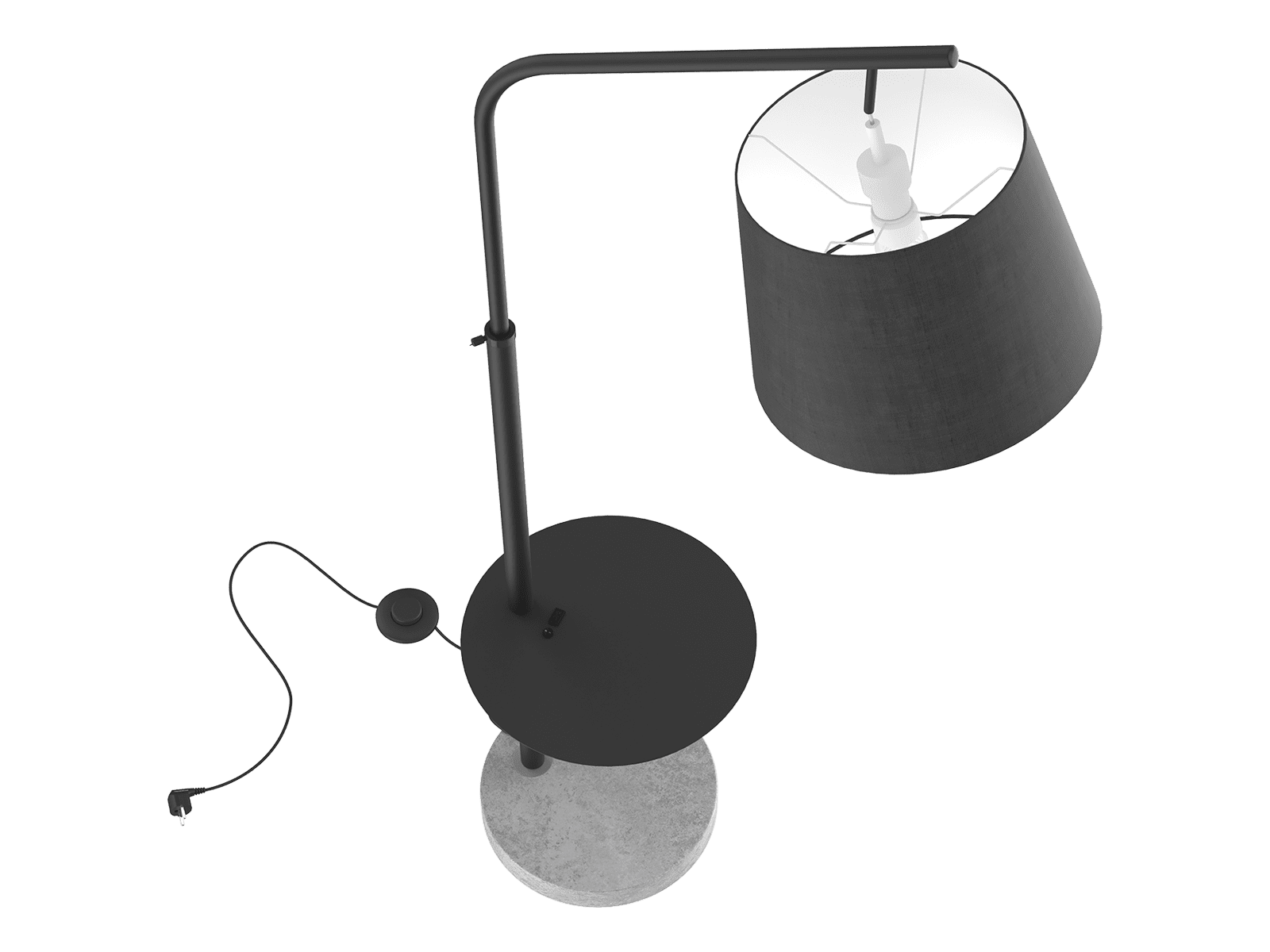Solaris est un lampadaire avec un pied en béton gris. Ce piétement assure une stabilité à tout épreuve. Ce lampadaire dispose aussi d’une tablette qui peut faire office de coin canapé. Cette tablette pivote autour de l’axe du lampadaire et permet de la positionner à la hauteur idéale. La hauteur de l’abat-jour peut aussi être réglée, tout comme la direction de l’abat jour. Ce lampadaire multi-fonctions est à la fois esthétique et pratique. Présenté ici avec un structure en acier laqué noir et un abat-jour noir.