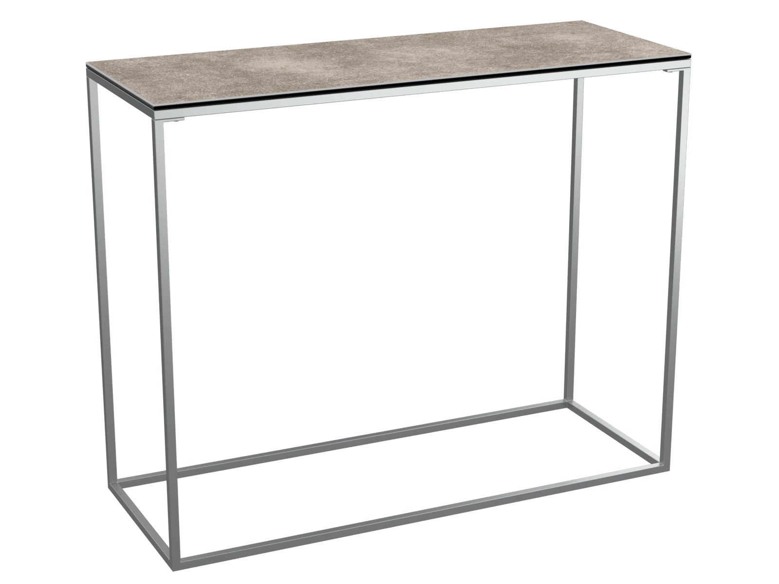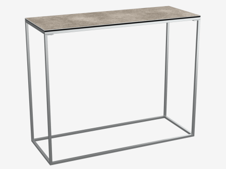 La console Julia de chez Akante dispose d'une structure en inox mat. Cette fintion contemporaine et intemporel se marie très bien avec son plateau en céramique grise qui lui donne un aspect bétonné très à la mode.