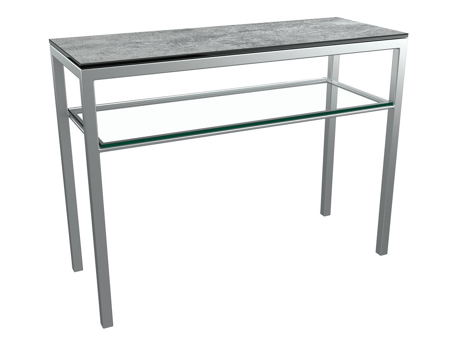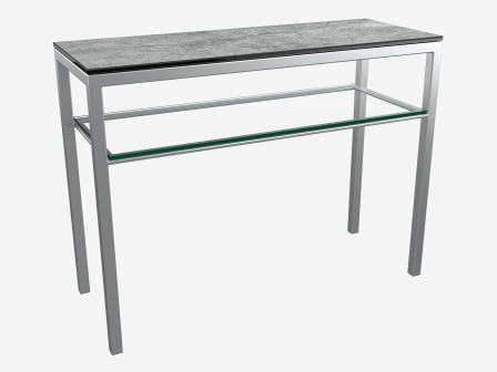 La console Claudia est une pièce de mobilier élégante et unique. Le mélange entre l’acier inoxydable brossé et la céramique silver la rend originale et raffinée. Haute de 75 cm, cette console saura vous séduire par ses courbes rectilignes et lumineuses. A placer dans votre salon, votre chambre ou même votre hall d’entrée, la console Claudia s’associe avec la table basse du même nom pour habiller votre intérieur avec des matériaux nobles.