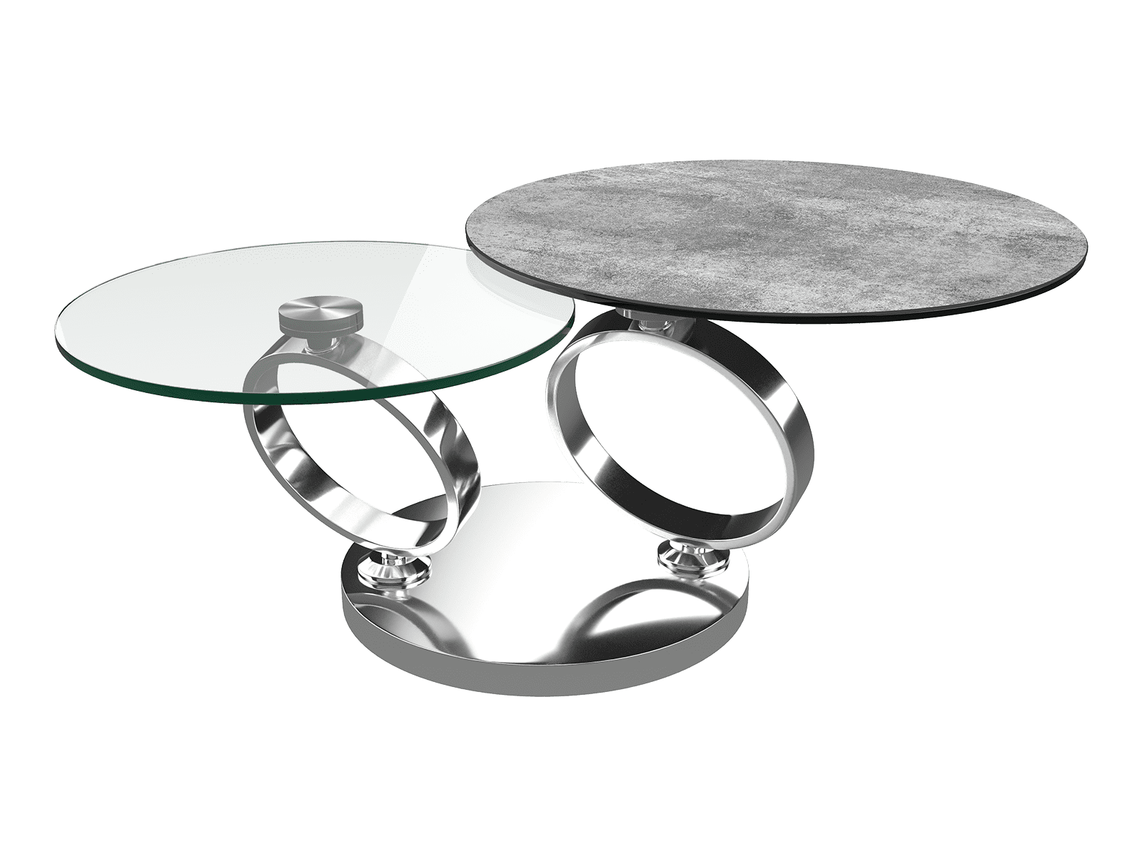 Eolia, une table basse pleine d’élégance et de lumière. Avec son piétement en acier chromé de 41,5 cm de hauteur, donnez du volume à votre séjour. En plus d’être originale, elle est fonctionnelle. Grâce à ses 2 anneaux rotatifs, vous pouvez déployer la table de 75 cm à 130 cm en un clin d’oeil. Son déploiement est synchronisé et facile. Le plateau inférieur est en verre trempé de 10 mm d’épaisseur. Akante offre des meubles solides et durables grâce à sa céramique de 3 mm collée sur un vitrage de 6 mm. Ici, son plateau supérieur est en céramique silver. Eolia existe également en total look black ou avec d’autres céramiques.