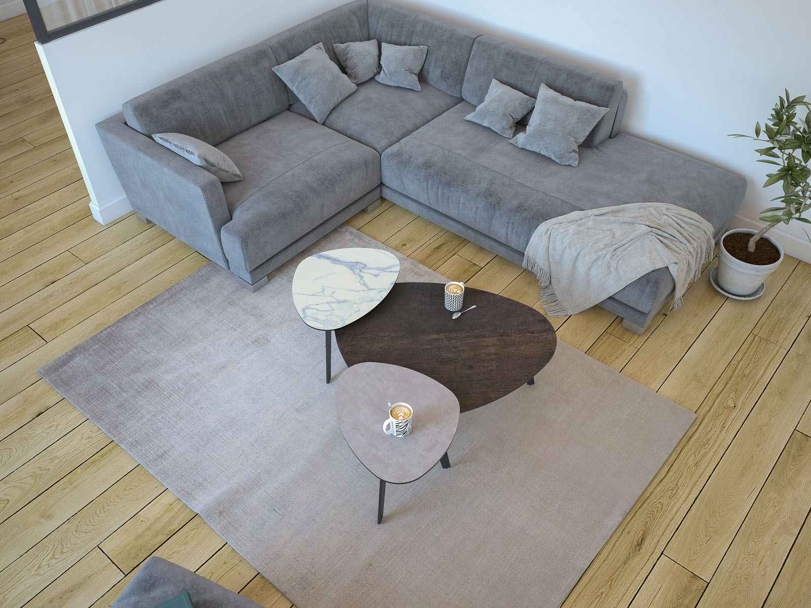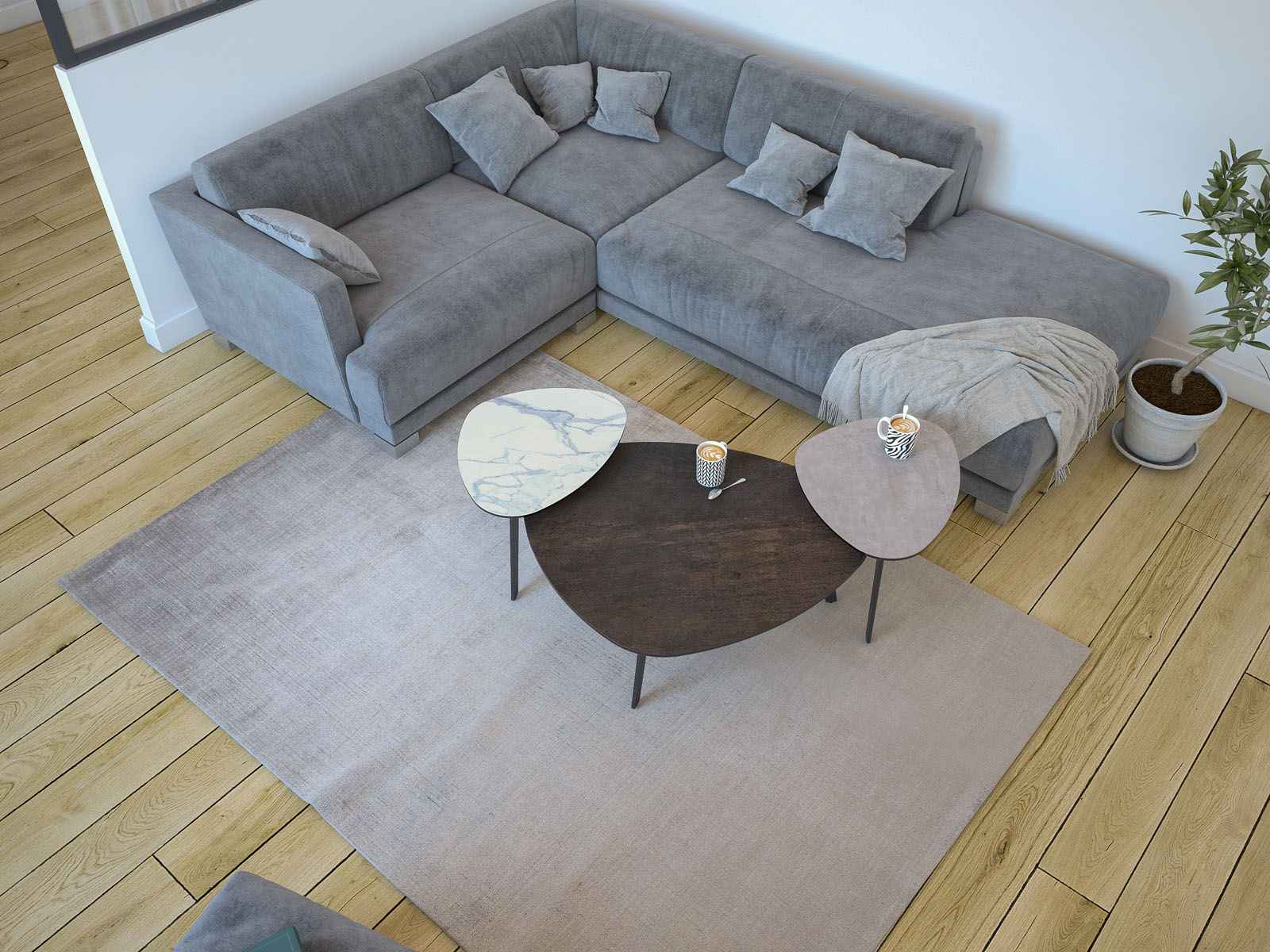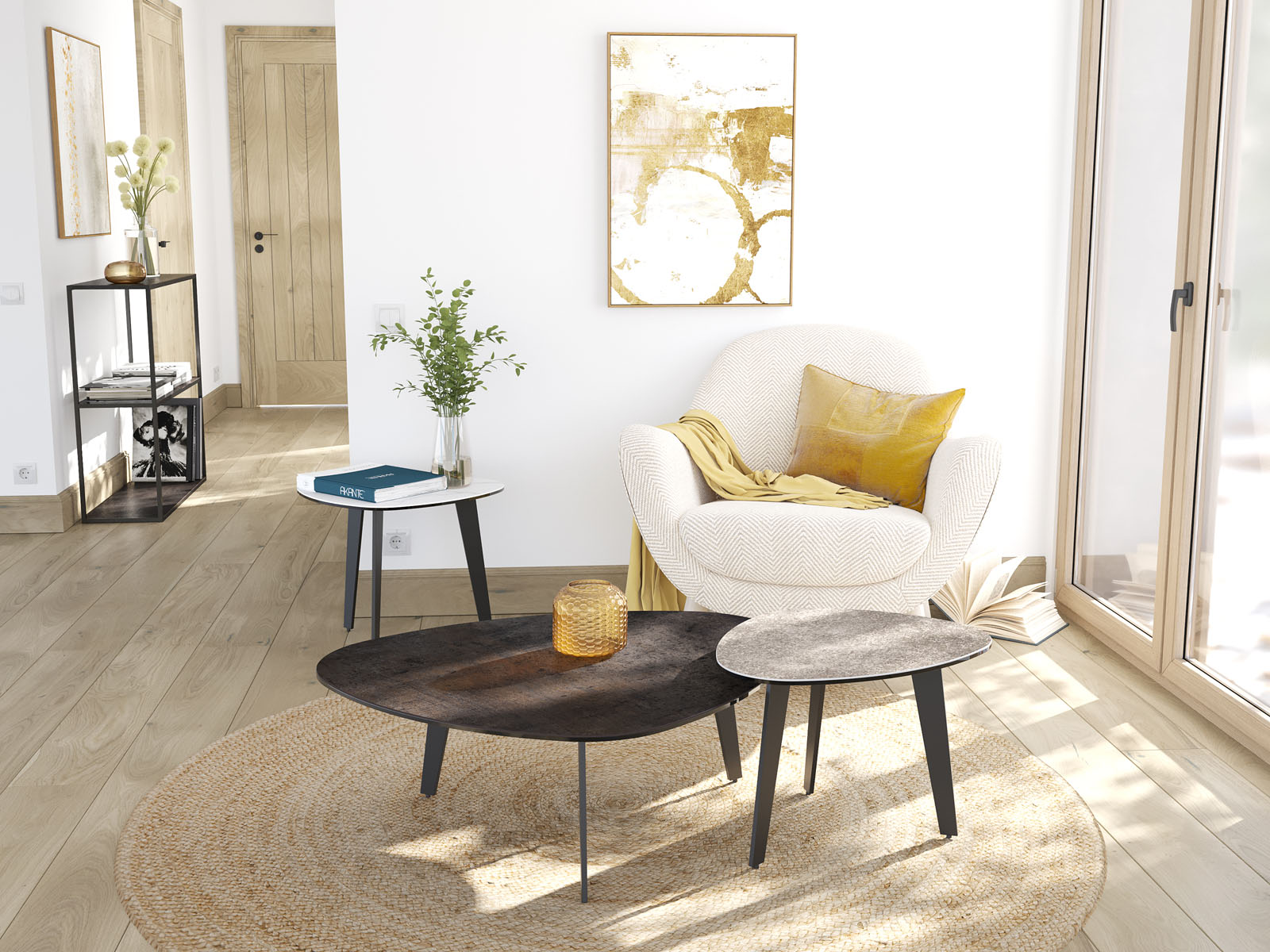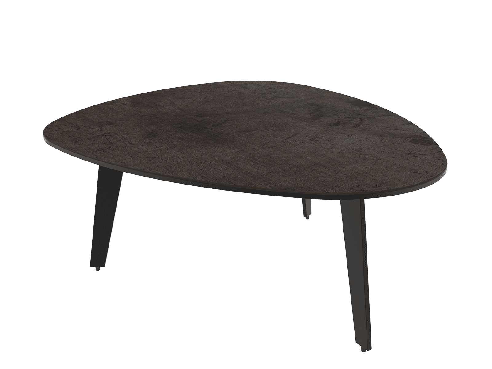 La table basse Galet est unique avec son piétement en acier laqué noir mat et la forme de son plateau en céramique acier. Sa céramique en provenance d'Espagne mesure 3 mm d'épaisseur et est collée sur un verre de 6 mm afin de renforcer la résistance du plateau.
