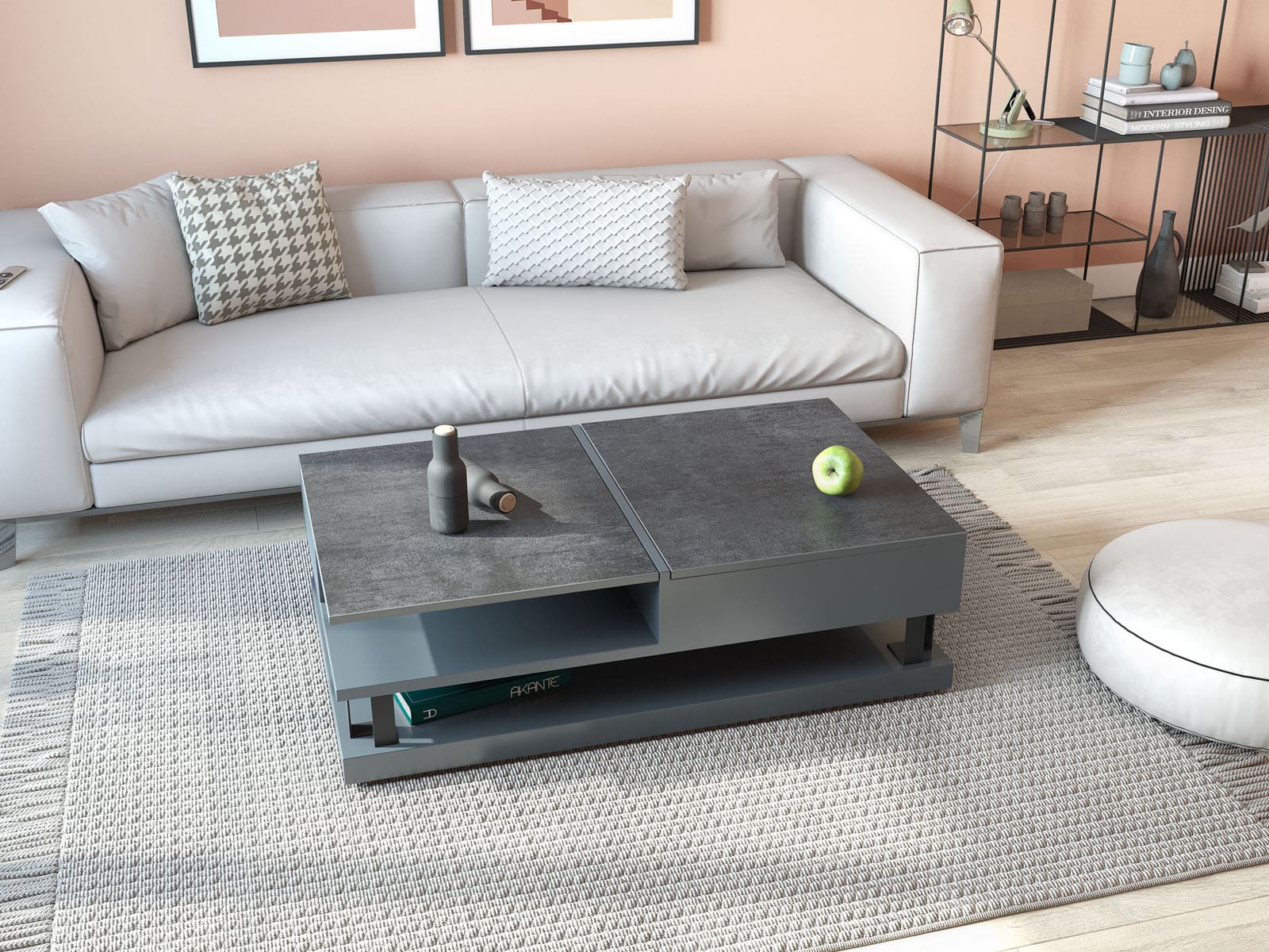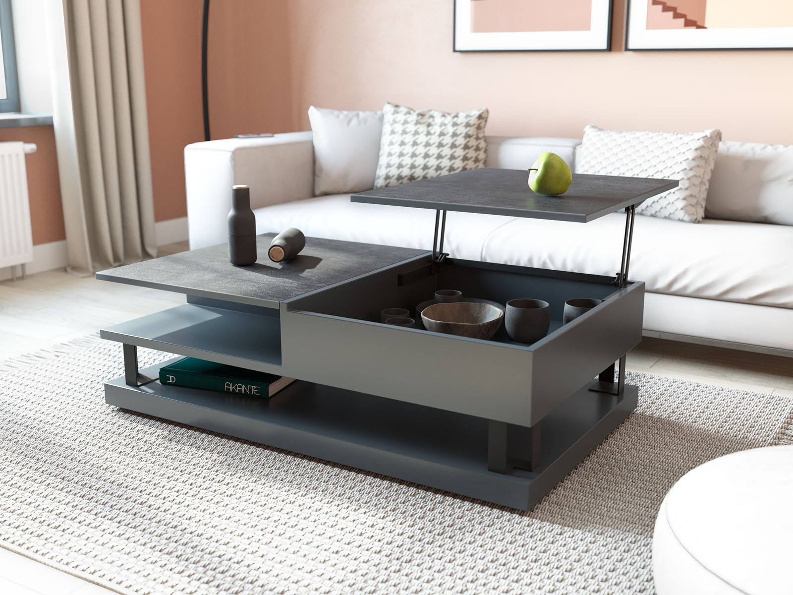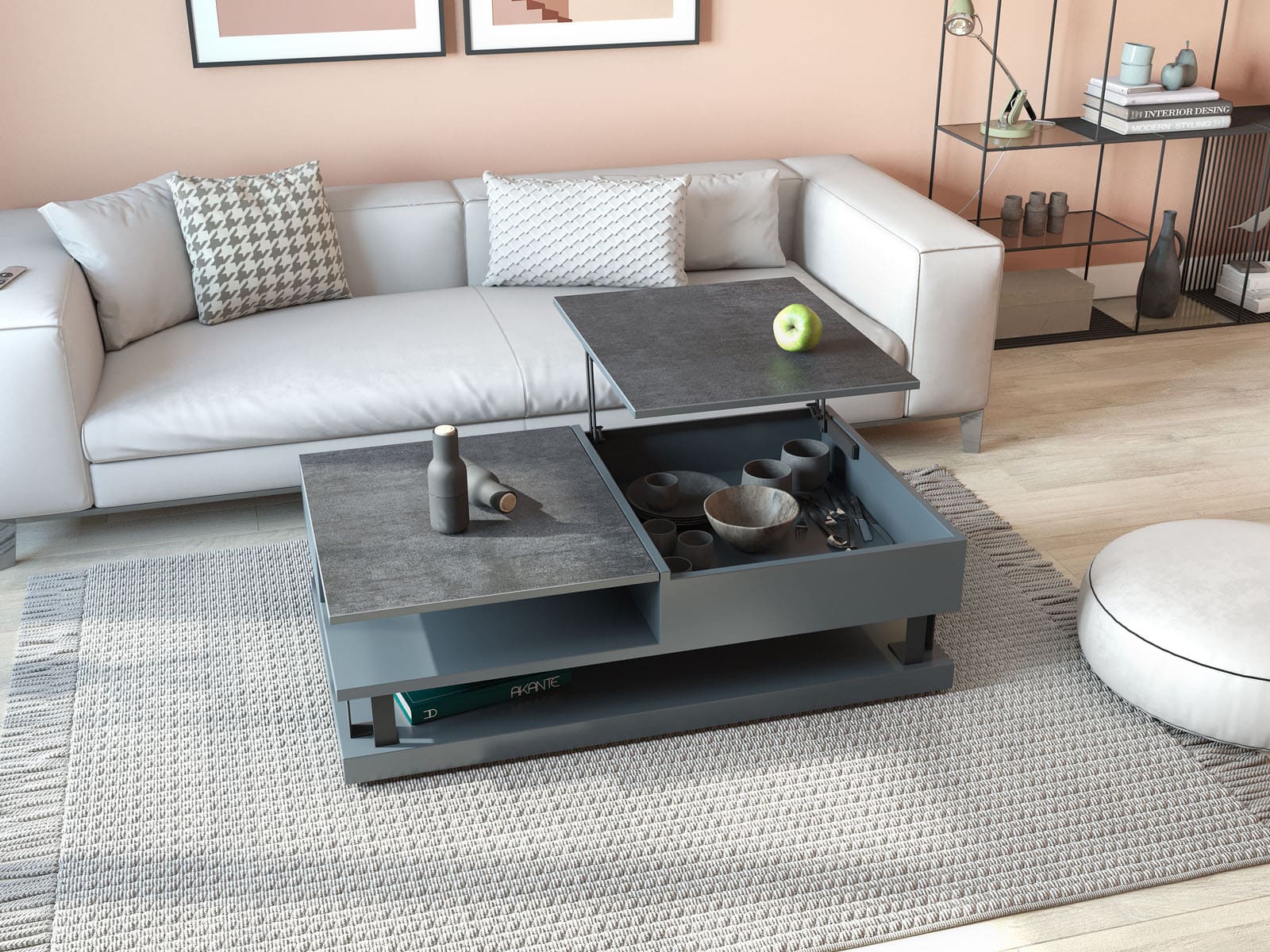 Découvrez la table basse Varium, une table basse aussi esthétique que pratique. Le plateau supérieur en céramique titane se soulève jusqu’à 61,5 cm pour laisser place à un bel espace de rangement. L'empiètement est en MDF laqué ce qui s'accorde très bien avec le plateau titane qui est une signature spéciale Akante.