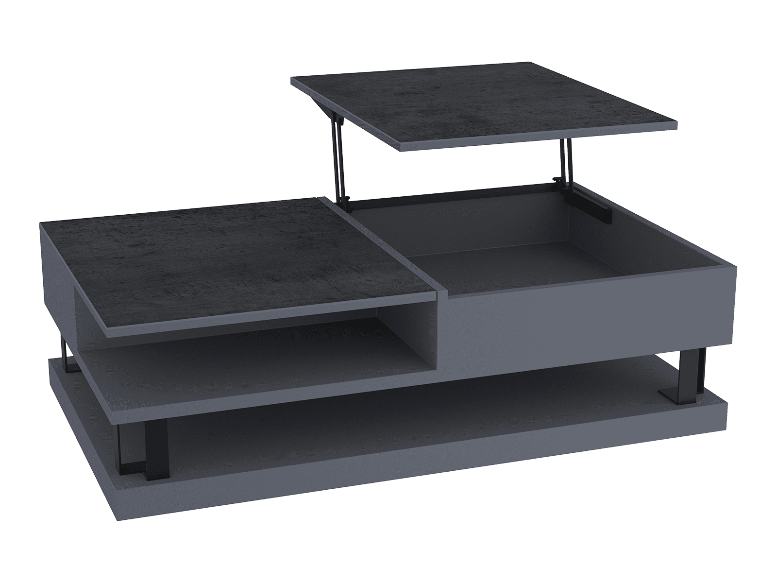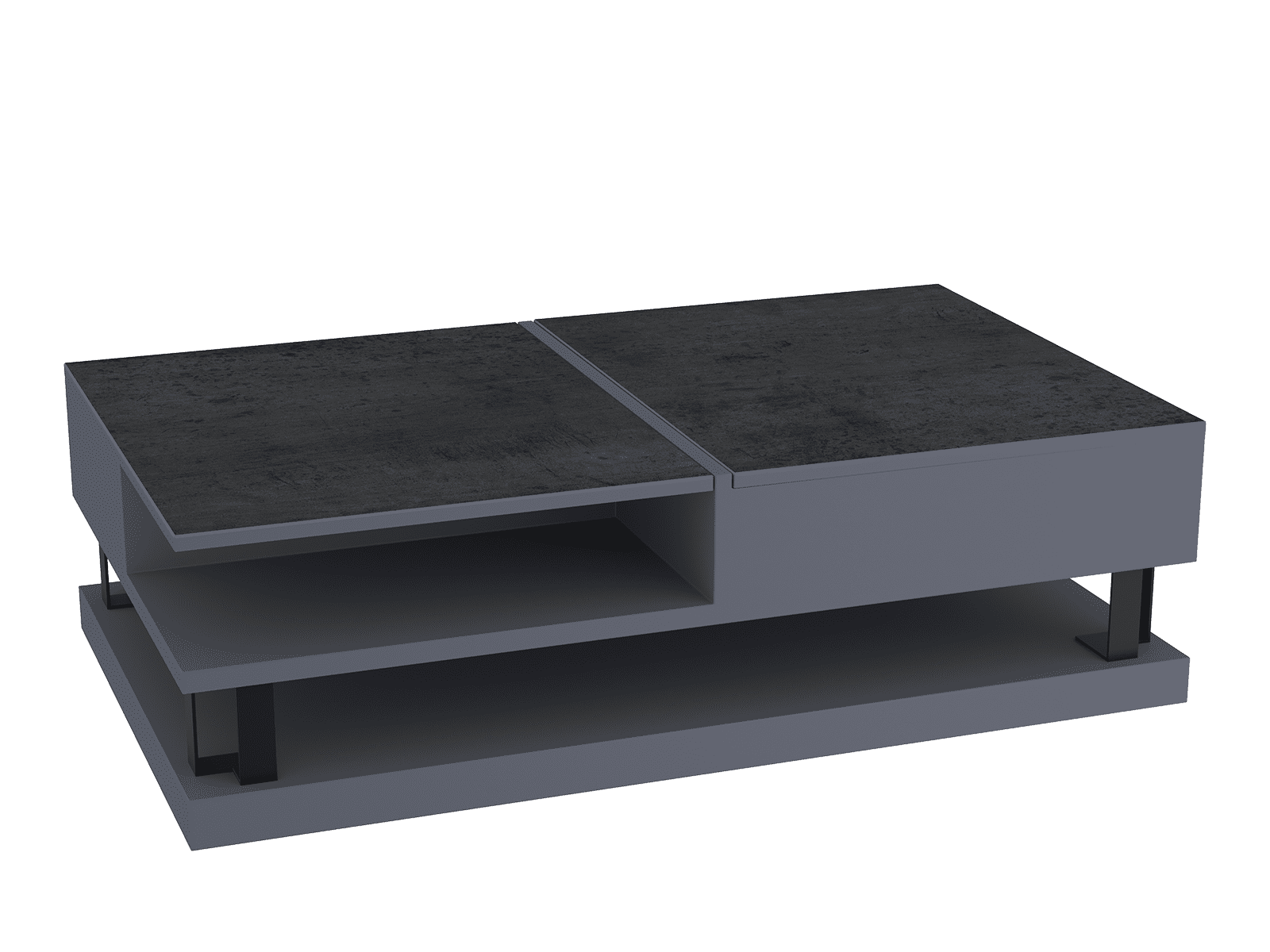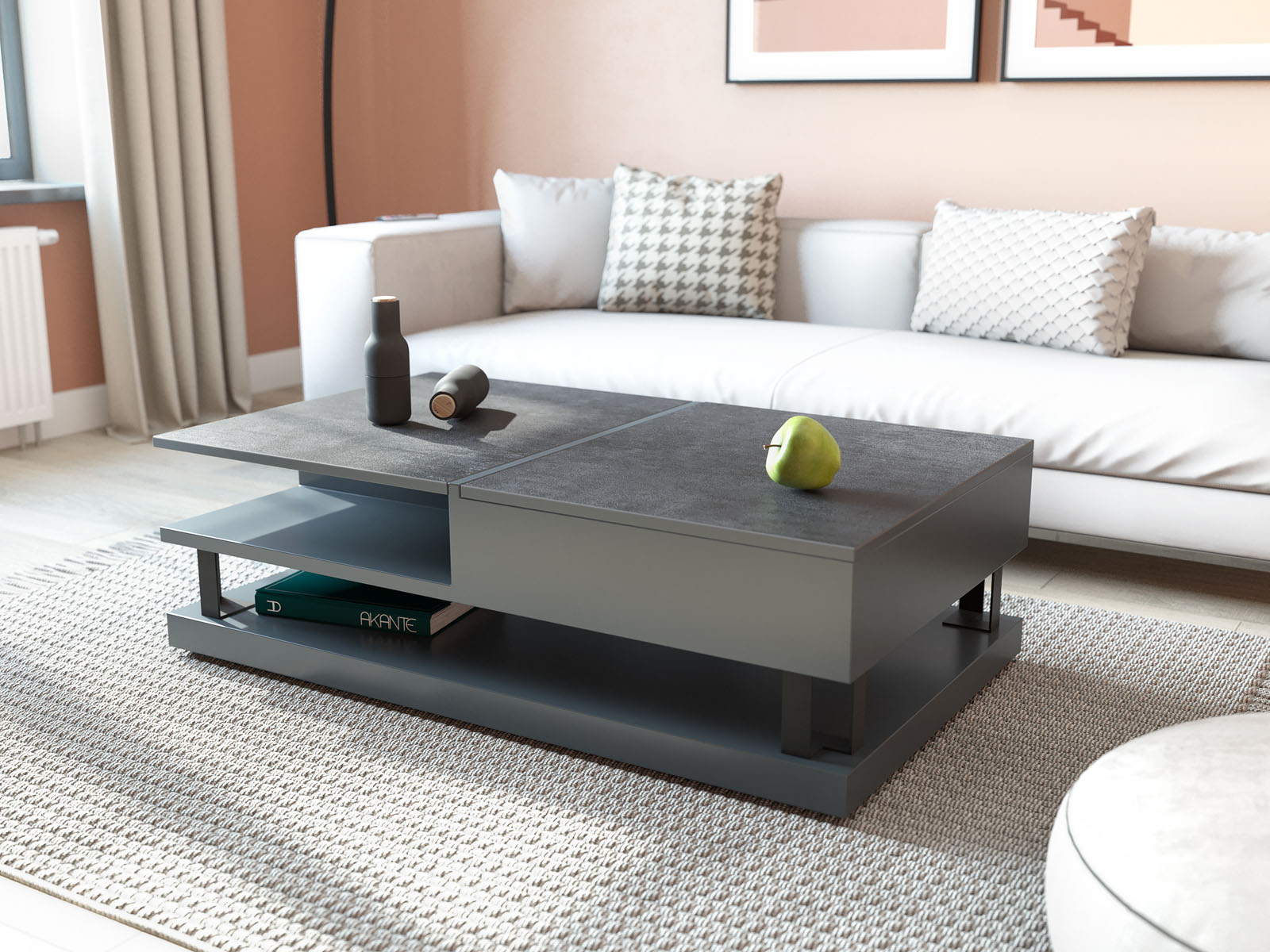 Découvrez la table basse Varium, une table basse aussi esthétique que pratique. Le plateau supérieur en céramique titane se soulève jusqu’à 61,5 cm pour laisser place à un bel espace de rangement. L'empiètement est en MDF laqué ce qui s'accorde très bien avec le plateau titane qui est une signature spéciale Akante.