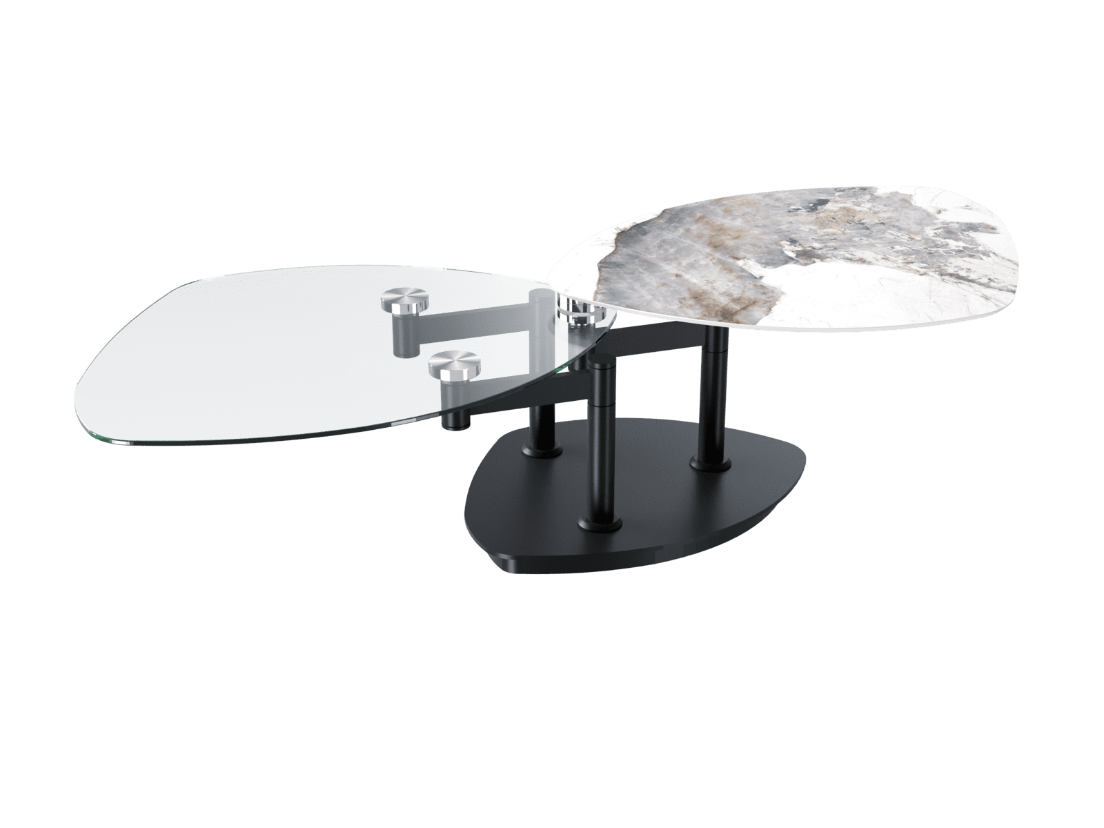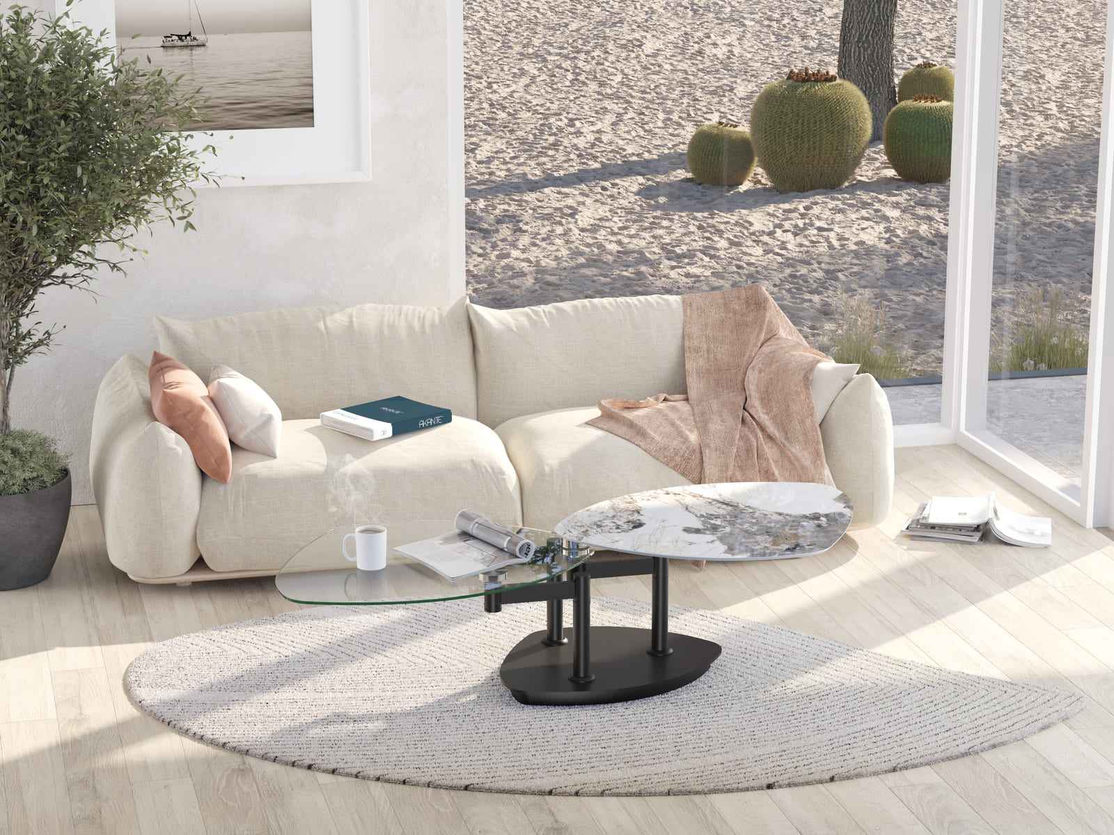 Vous aimez le charme de la céramique marbre Calcatta et la transparence du verre ? Découvrez la table basse Sevilla ! C’est la combinaison d’un plateau en céramique pleine masse de 11 mm et d’un plateau en verre clair. Les plateaux ovales sont mobiles, cela vous permet d’ajuster la taille de la table selon vos envies. Son piétement design est en acier laqué noir mat et mesure 42 cm de hauteur, il est équipé de roulettes. C’est la table épurée que vous attendiez.