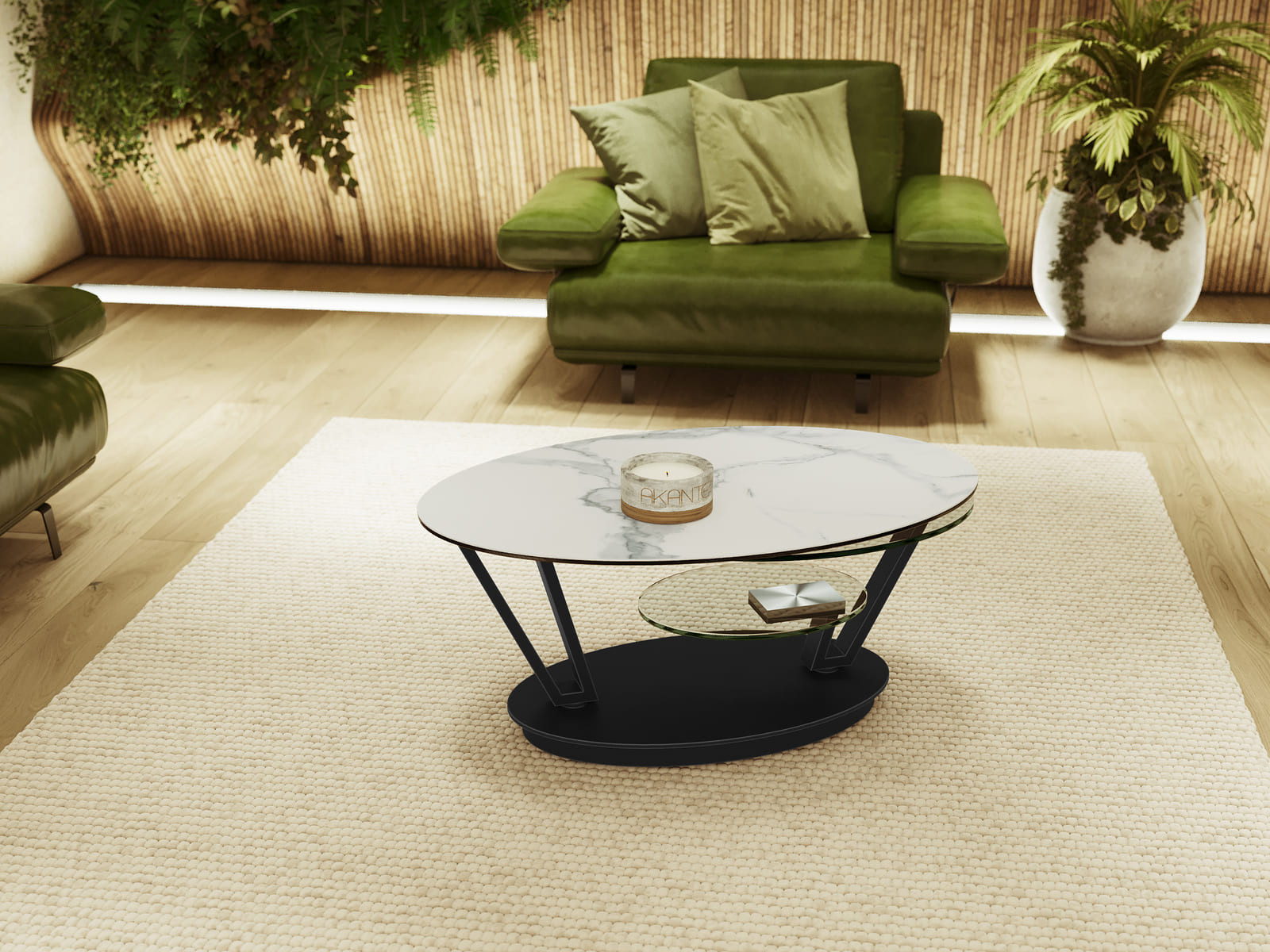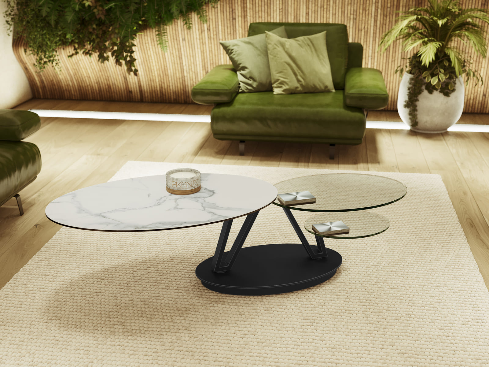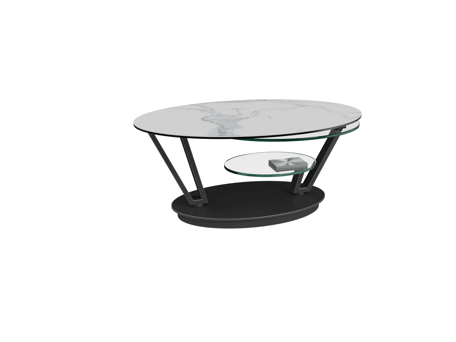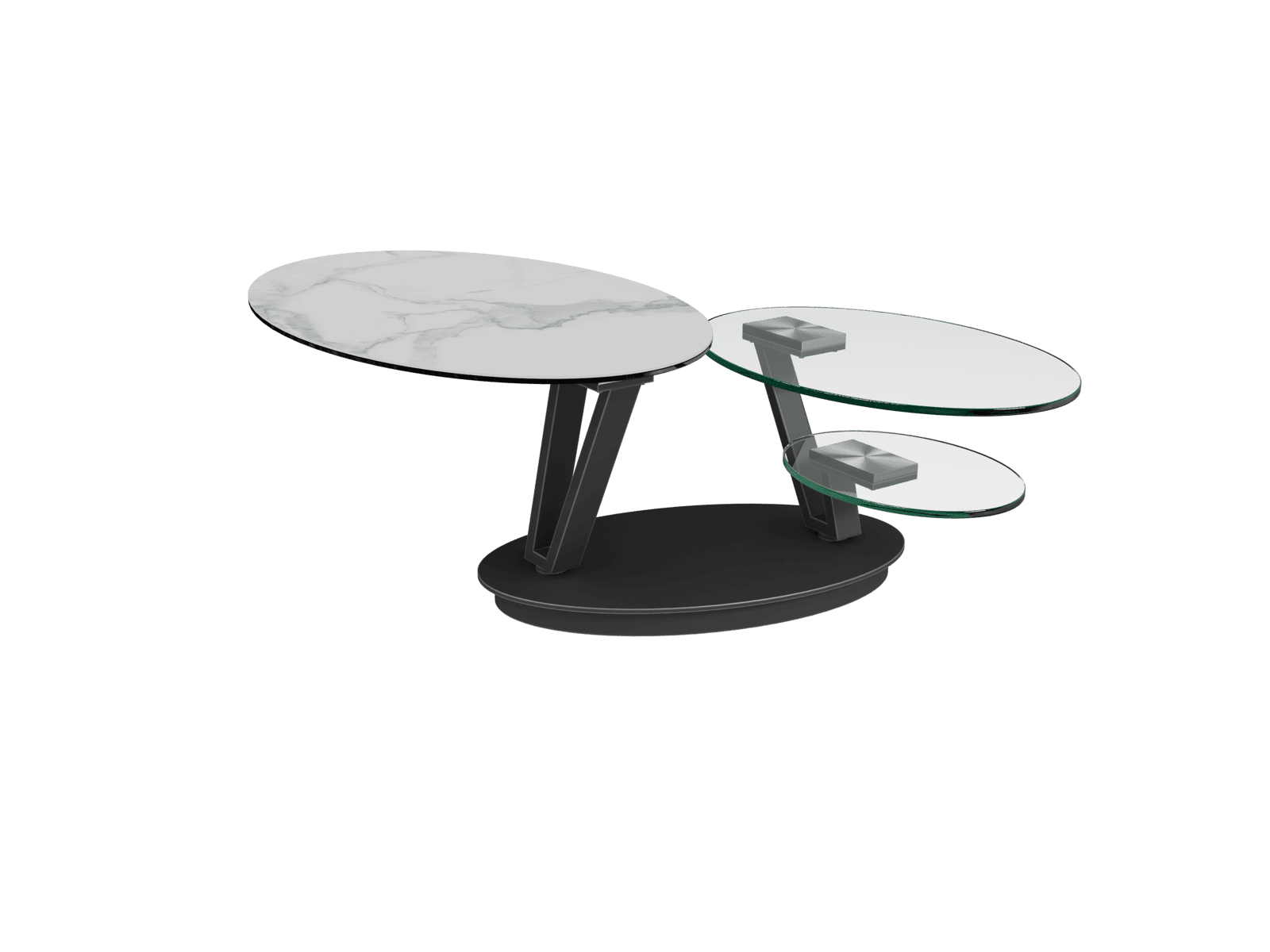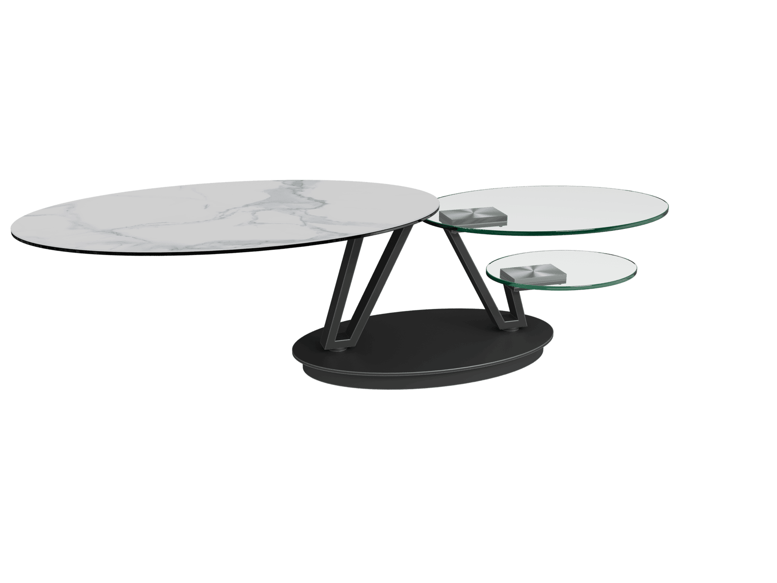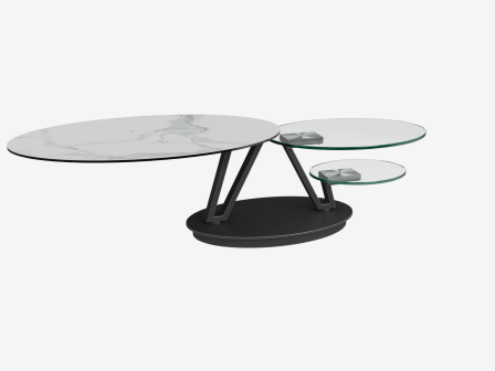 La table basse Fira allie parfaitement élégance et fonctionnalité. Elle possède trois plateaux superposés et pivotants. Fira est la table basse qui vous permet d'atteindre une surface allant jusqu'à 1,5 mètre de long en un simple mouvement de la main. Le plateau supérieur est en céramique marbre mat de 3 mm, collée sur un verre de 6 mm. Les deux plateaux inférieurs sont en verre trempé, pour ajouter une touche de profondeur et de transparence. La structure est en acier laqué noir mat, elle permet à ses bras ajourés de pivoter sur eux-mêmes. Fira mesure 95 cm de long, 60 cm de large et 43 cm de haut.